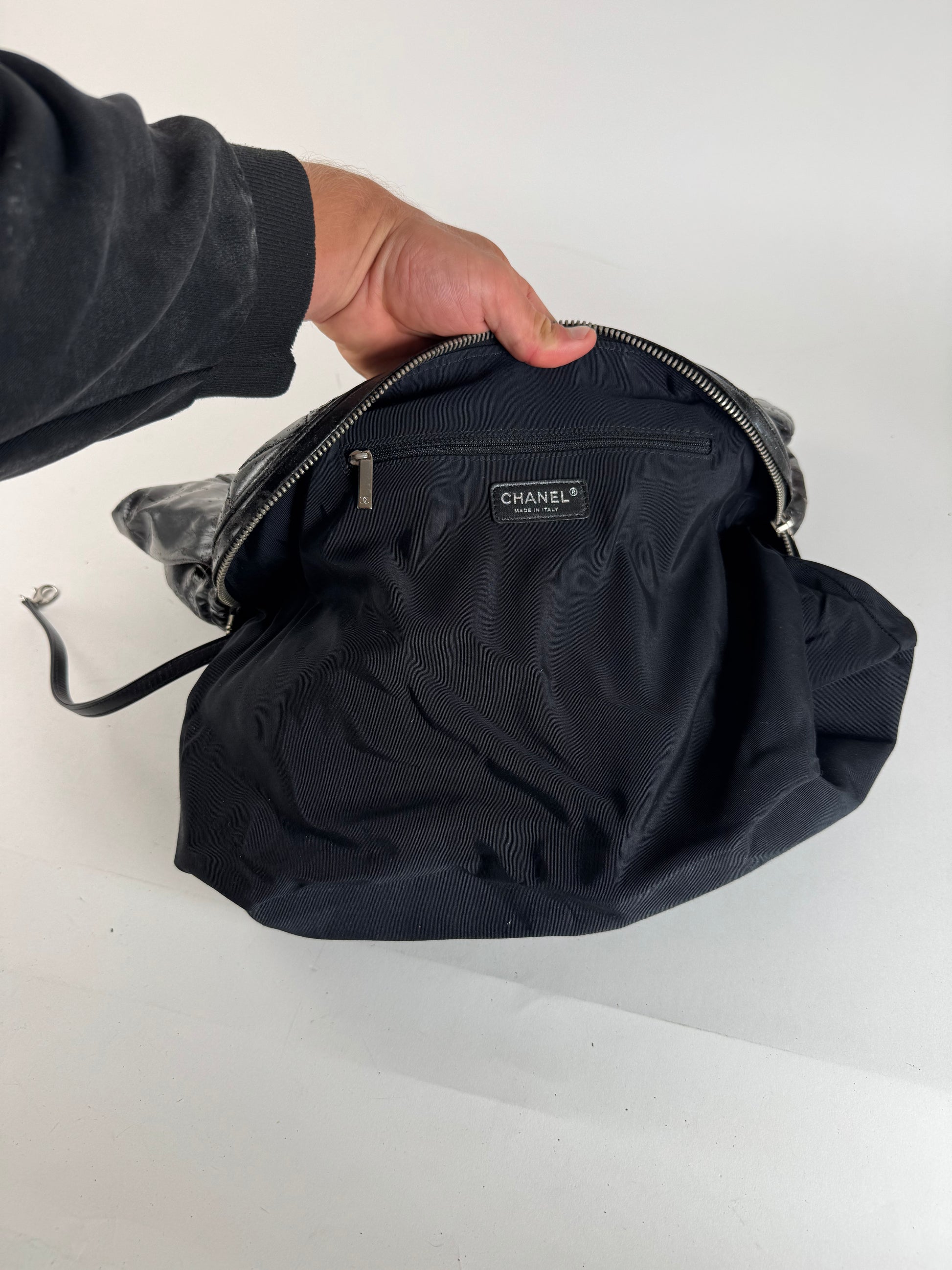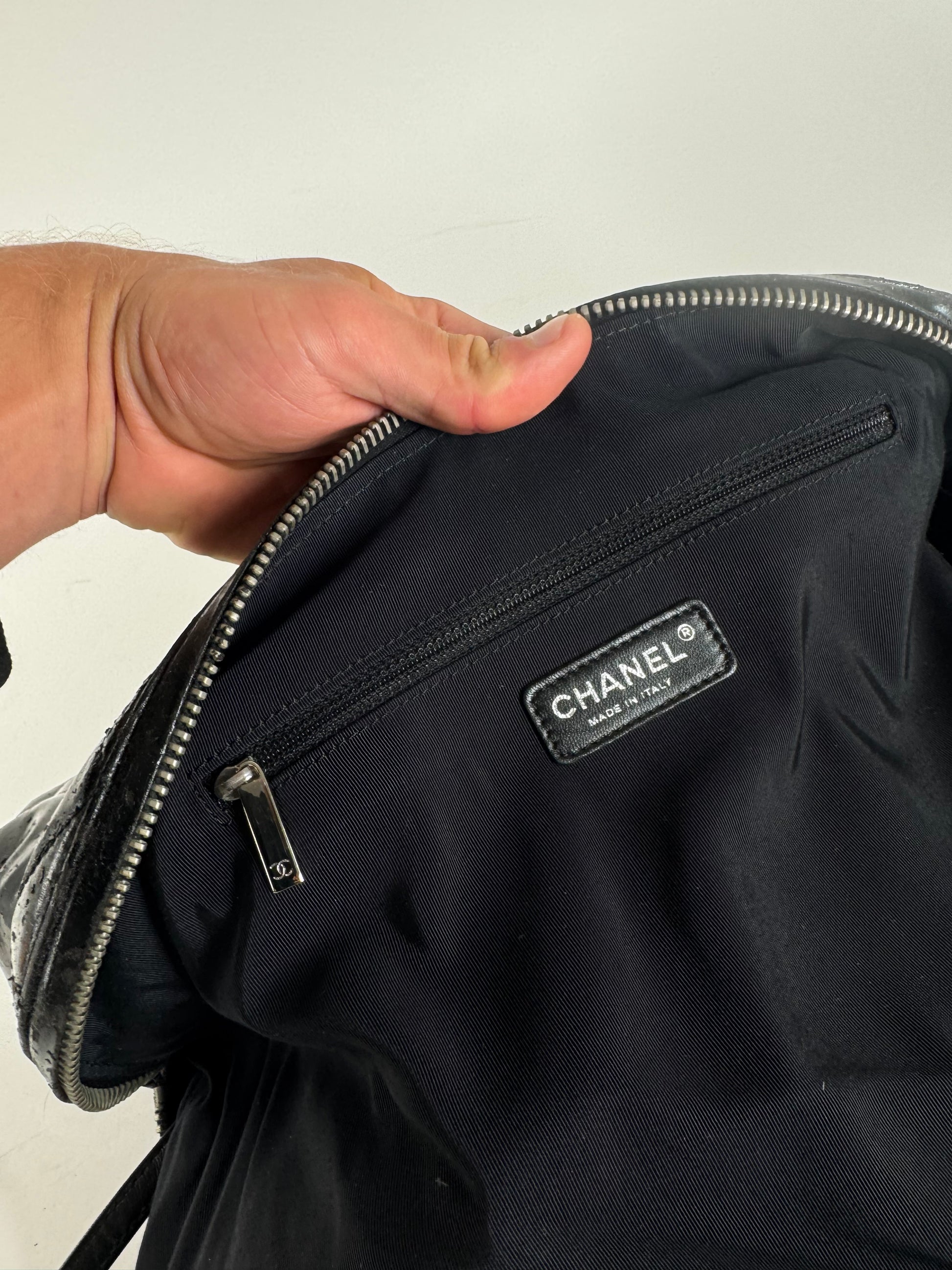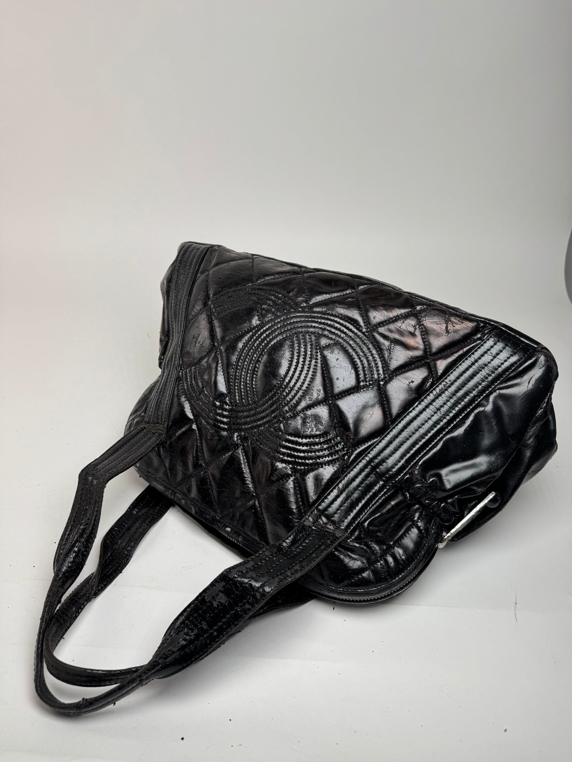 CHANEL vintage handbag. This chic handbag is finely crafted of black patent leather. The bag features two long top handles, a top zipper closure, and the iconic CC logo on the front. The interior is lined with black polyester.