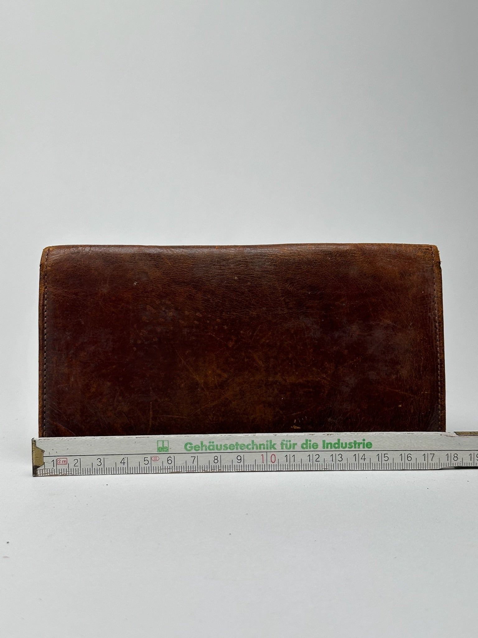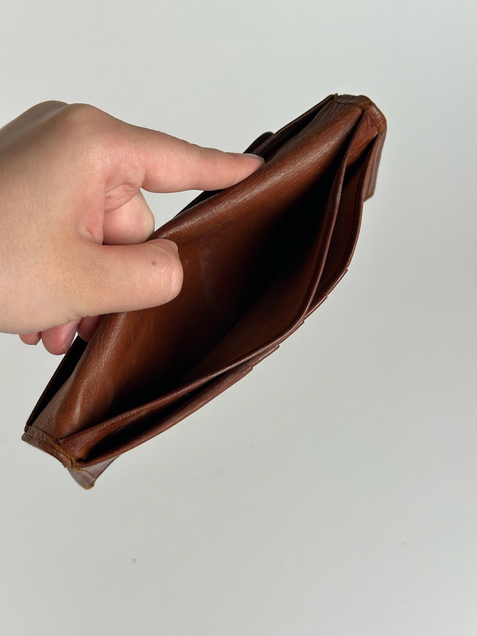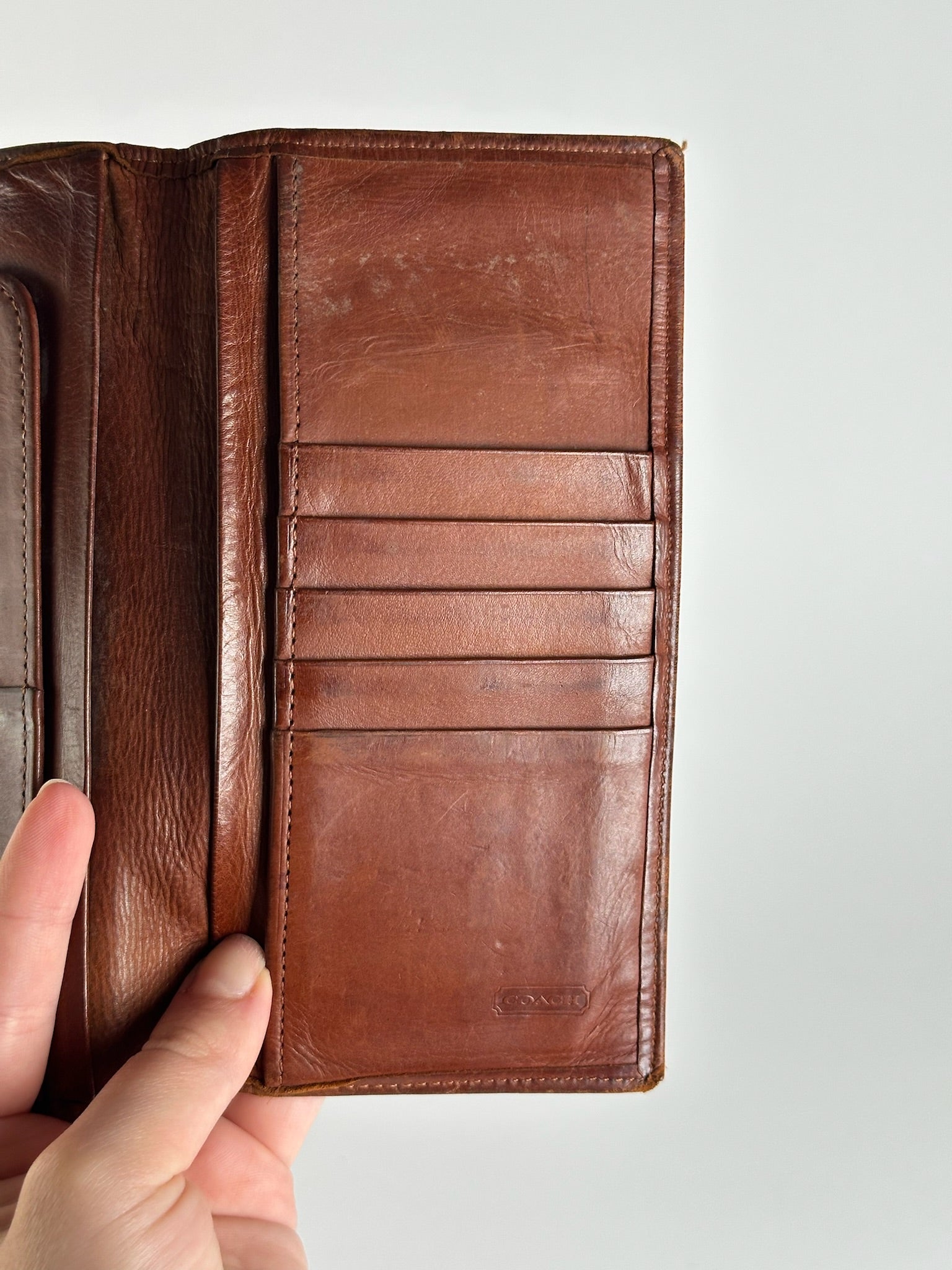 COACH vintage card holder. This minimal and functional cardholder is finely crafted from smooth brown leather in a classic, understated design. The piece features no hardware and opens to a matching brown leather interior with compartments for cards or identification. A timeless and practical vintage accessory.
