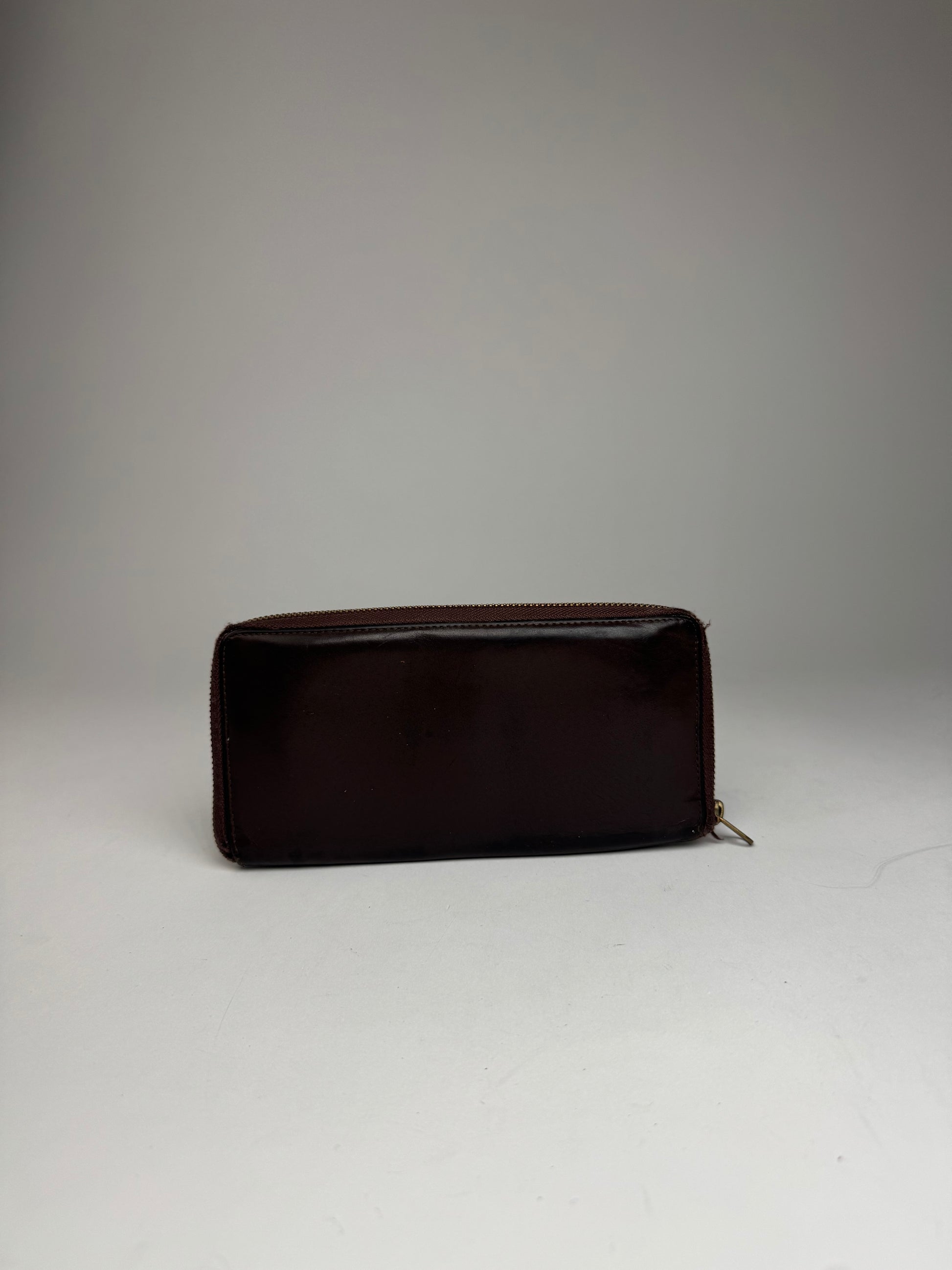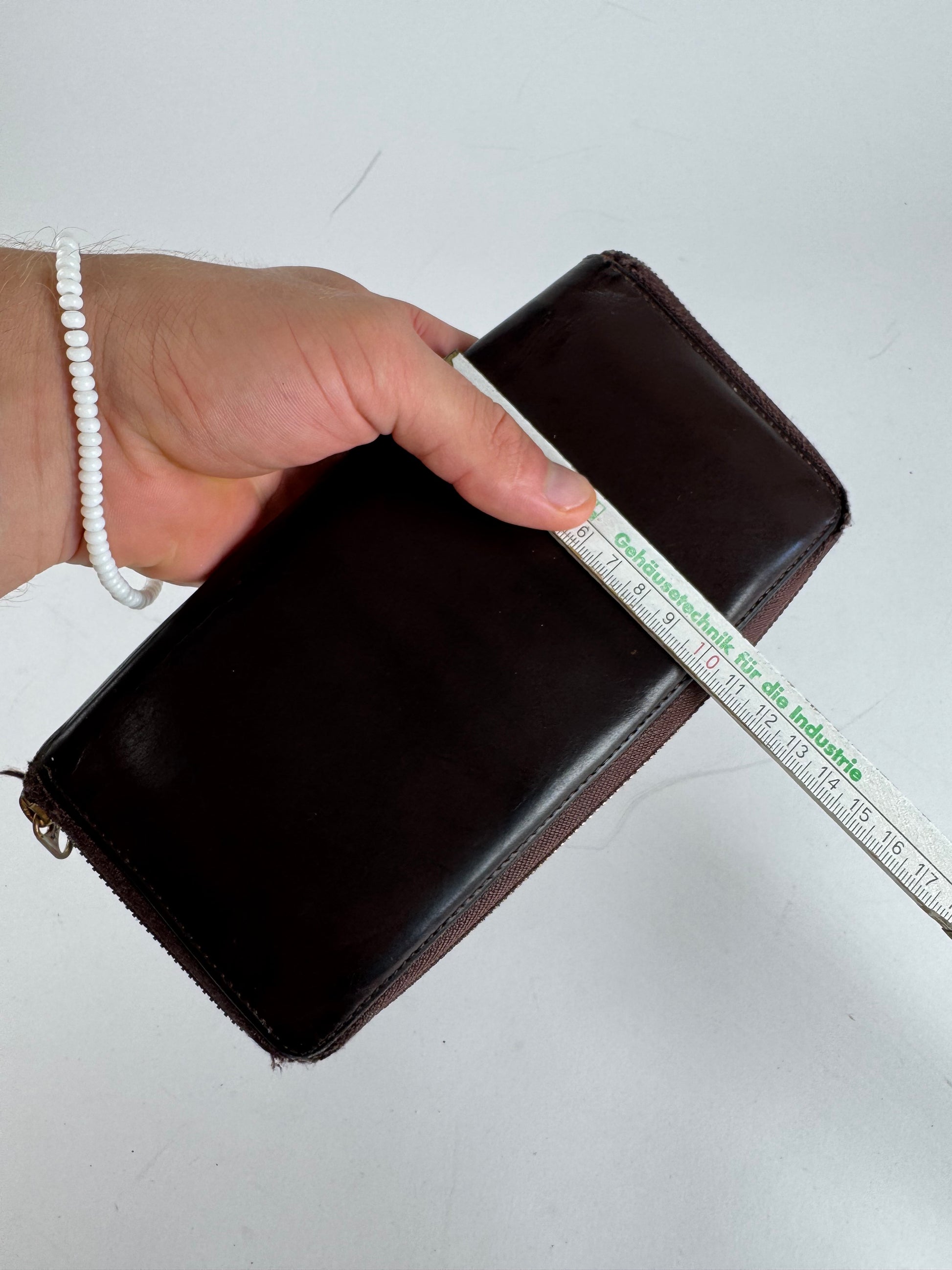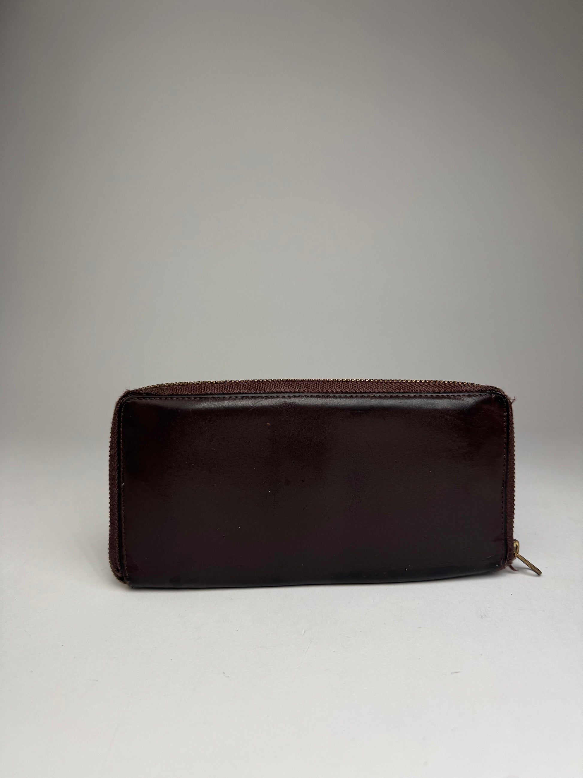 COMME DES GARÇONS vintage wallet. This chic accessory is finely crafted from smooth brown leather and features a top-around gold-tone steel zipper. The interior is also finished in brown leather and offers compartments for cash, cards, and notes — but no coin pocket.