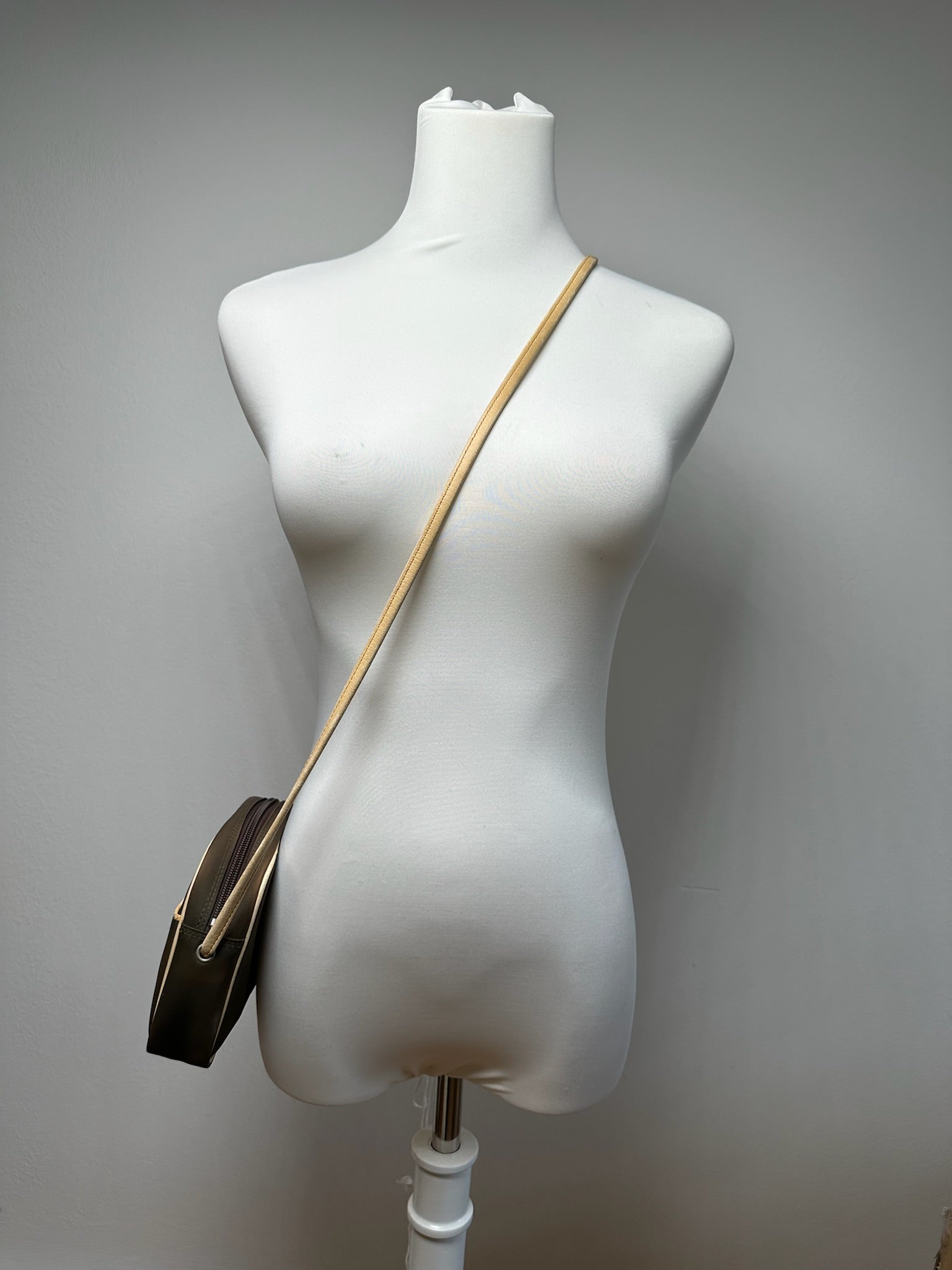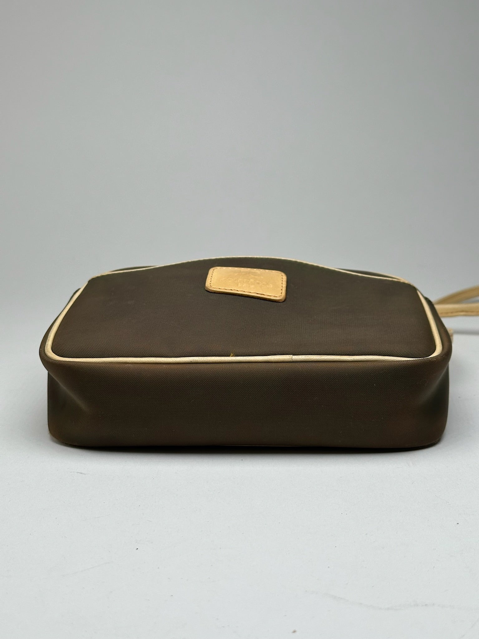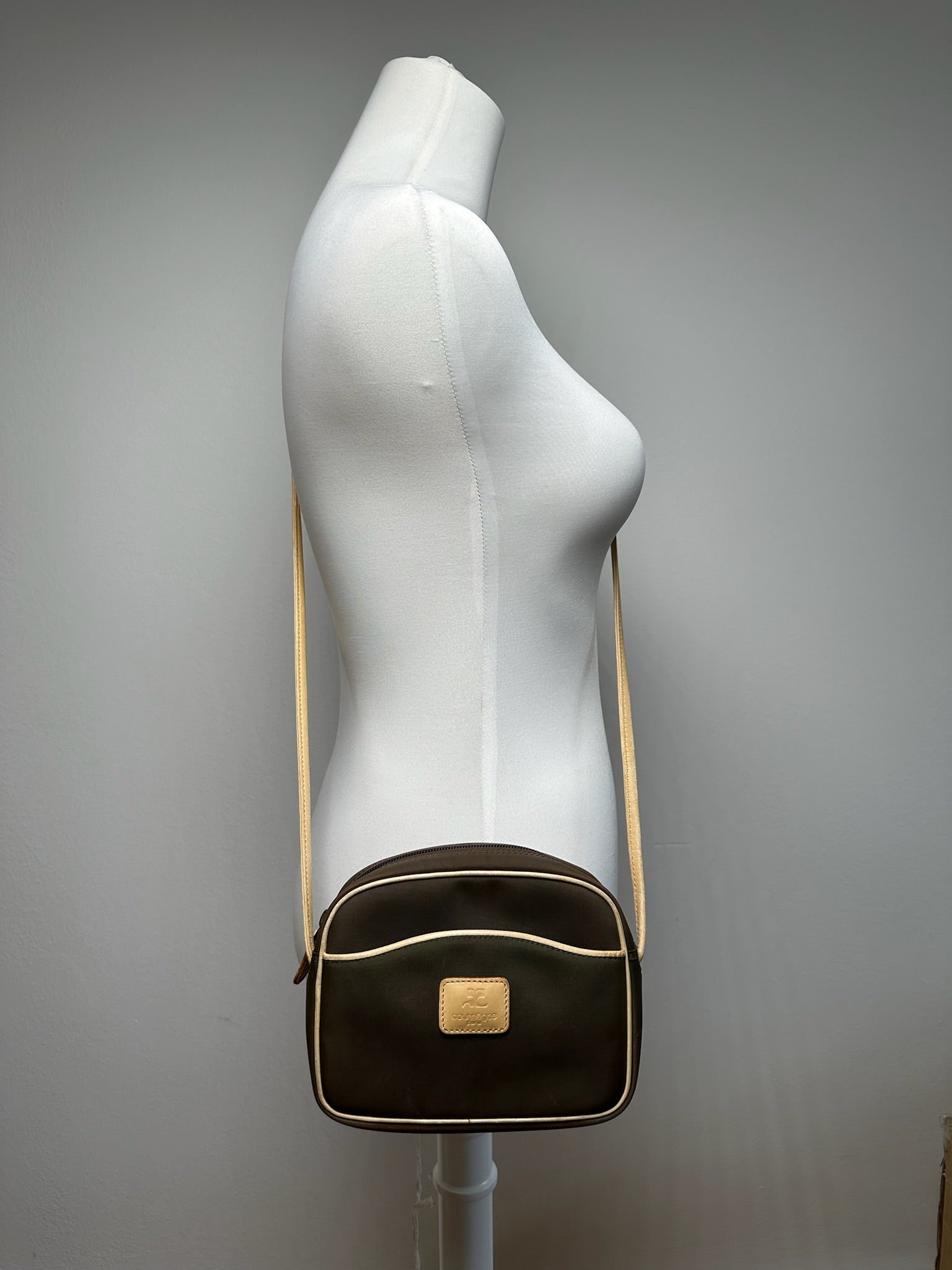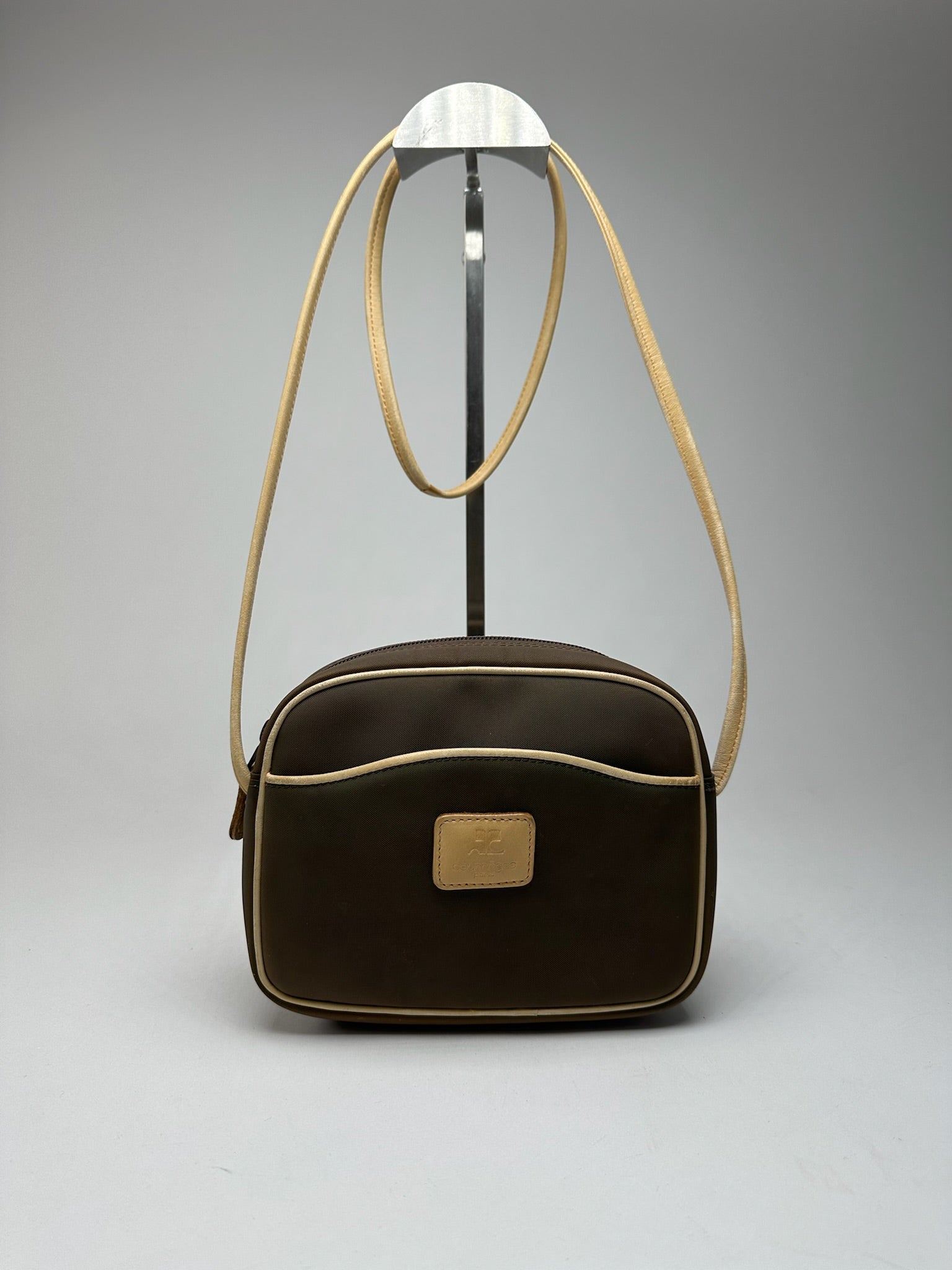 COURRÈGES Vintage Leather and Canvas Bag. This chic handbag is finely crafted of light brown leather and dark brown canvas. The interior is lined with black canvas fabric.