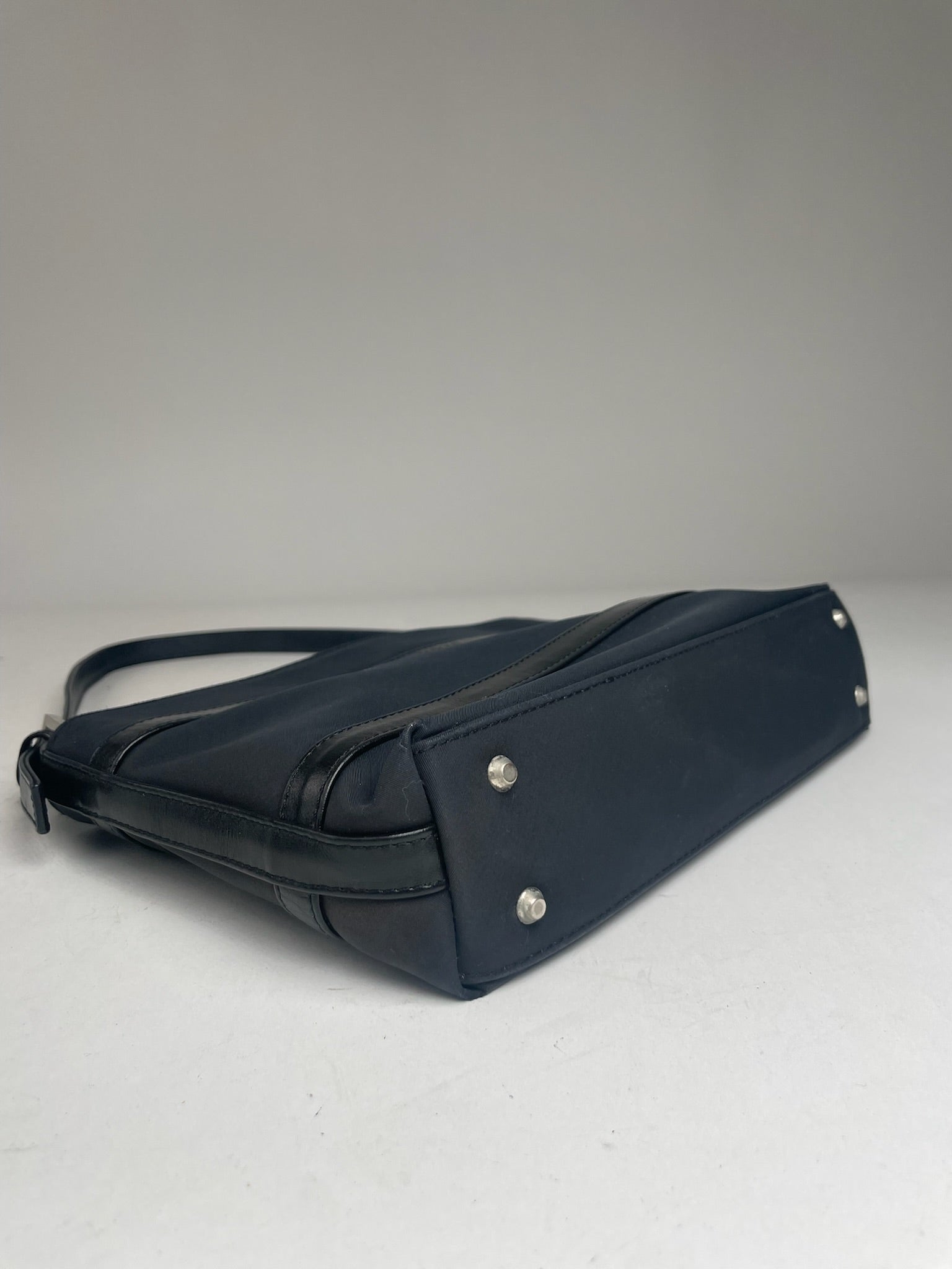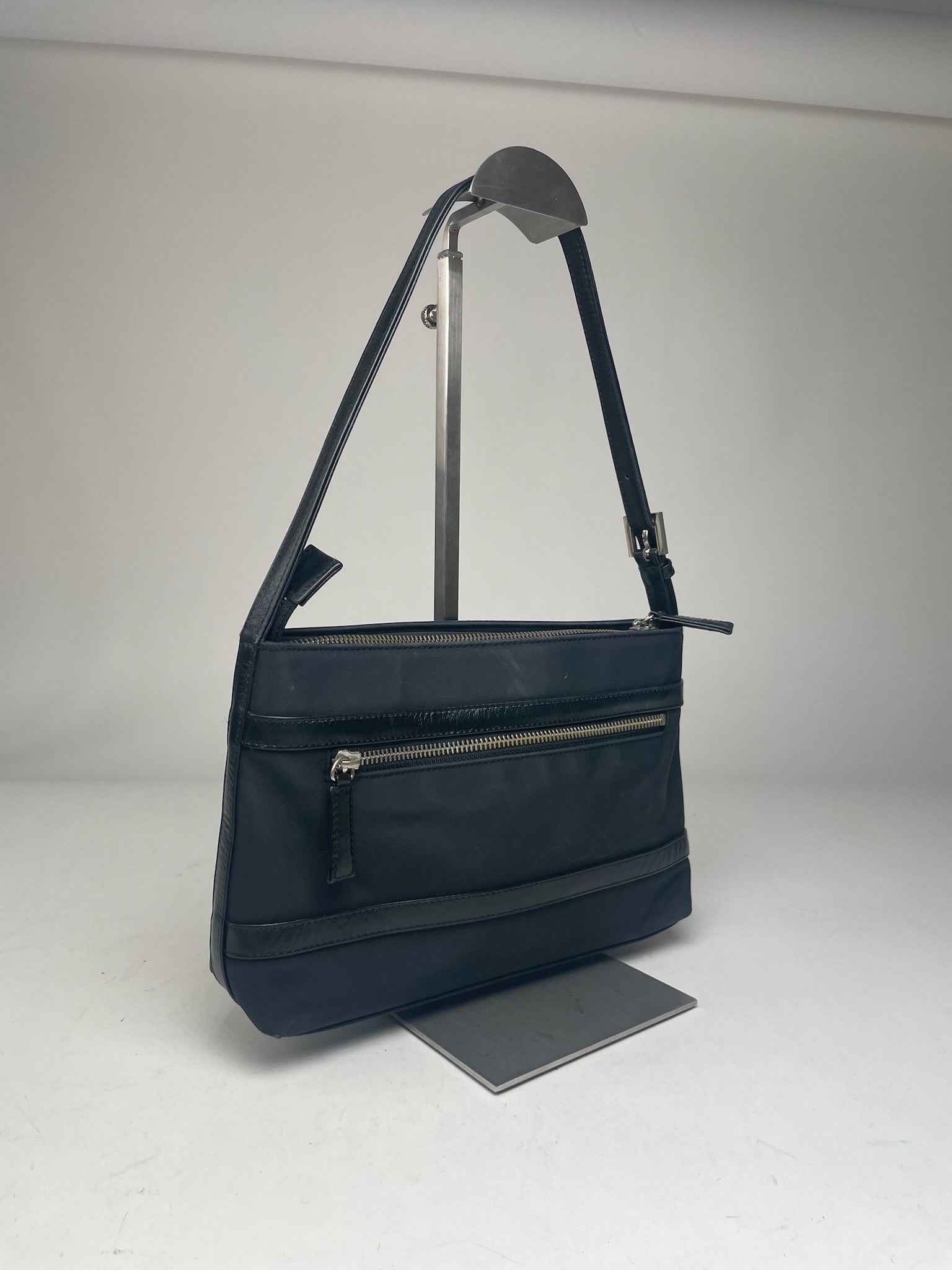 This chic vintage handbag by Courrèges is crafted from black leather with navy leather accents. It features a handle that is adjustable in length and silver hardware made of steel. The bag has a top zipper for secure closure and the interior is lined with black synthetic leather. The bag is in very good condition, showing only minor scratches and scuff marks.