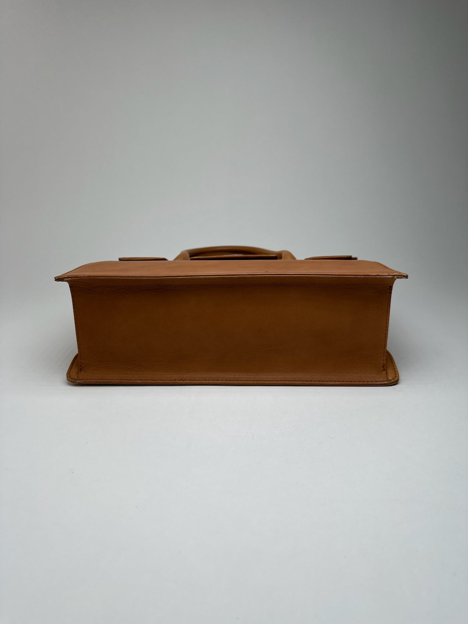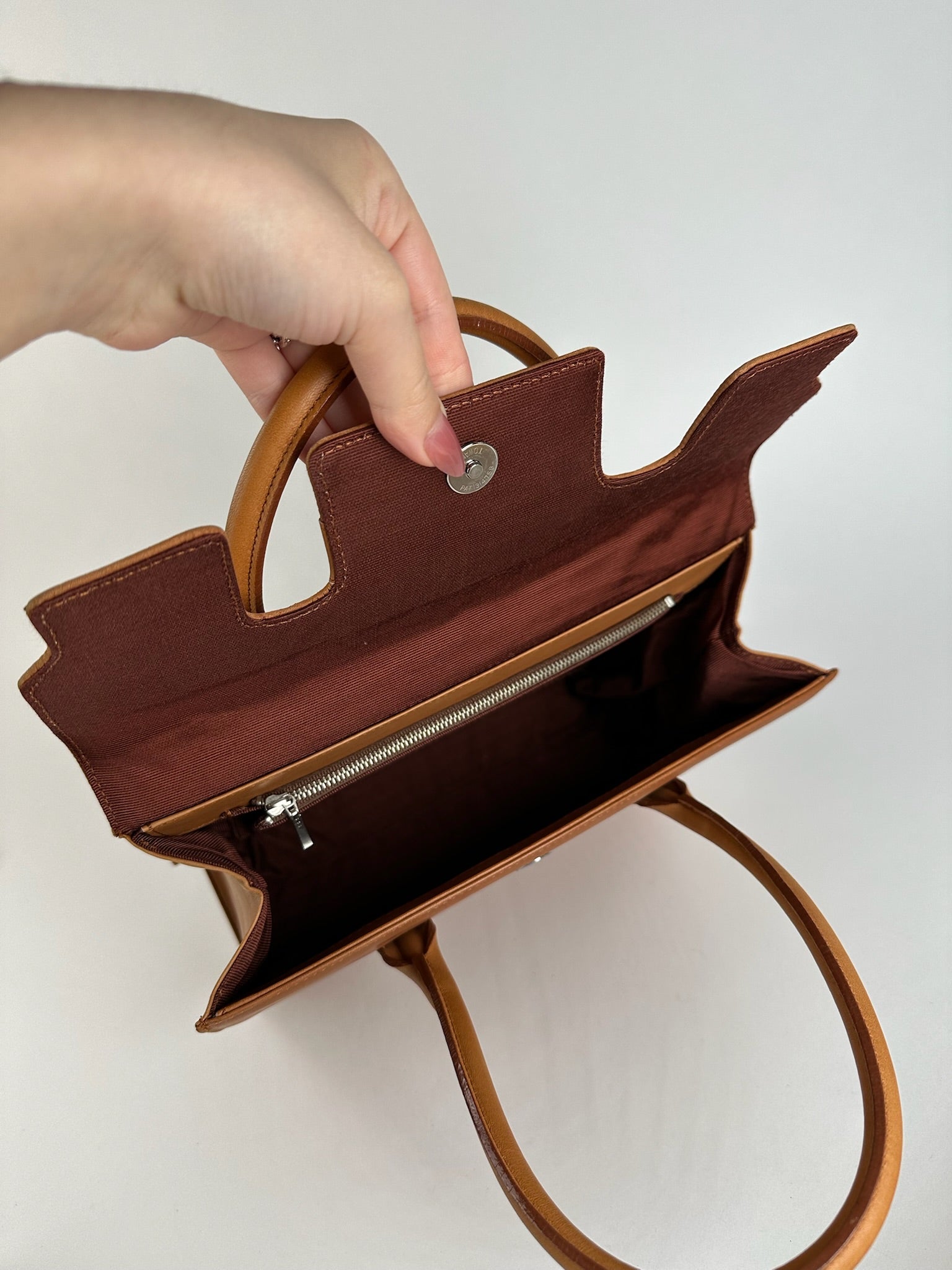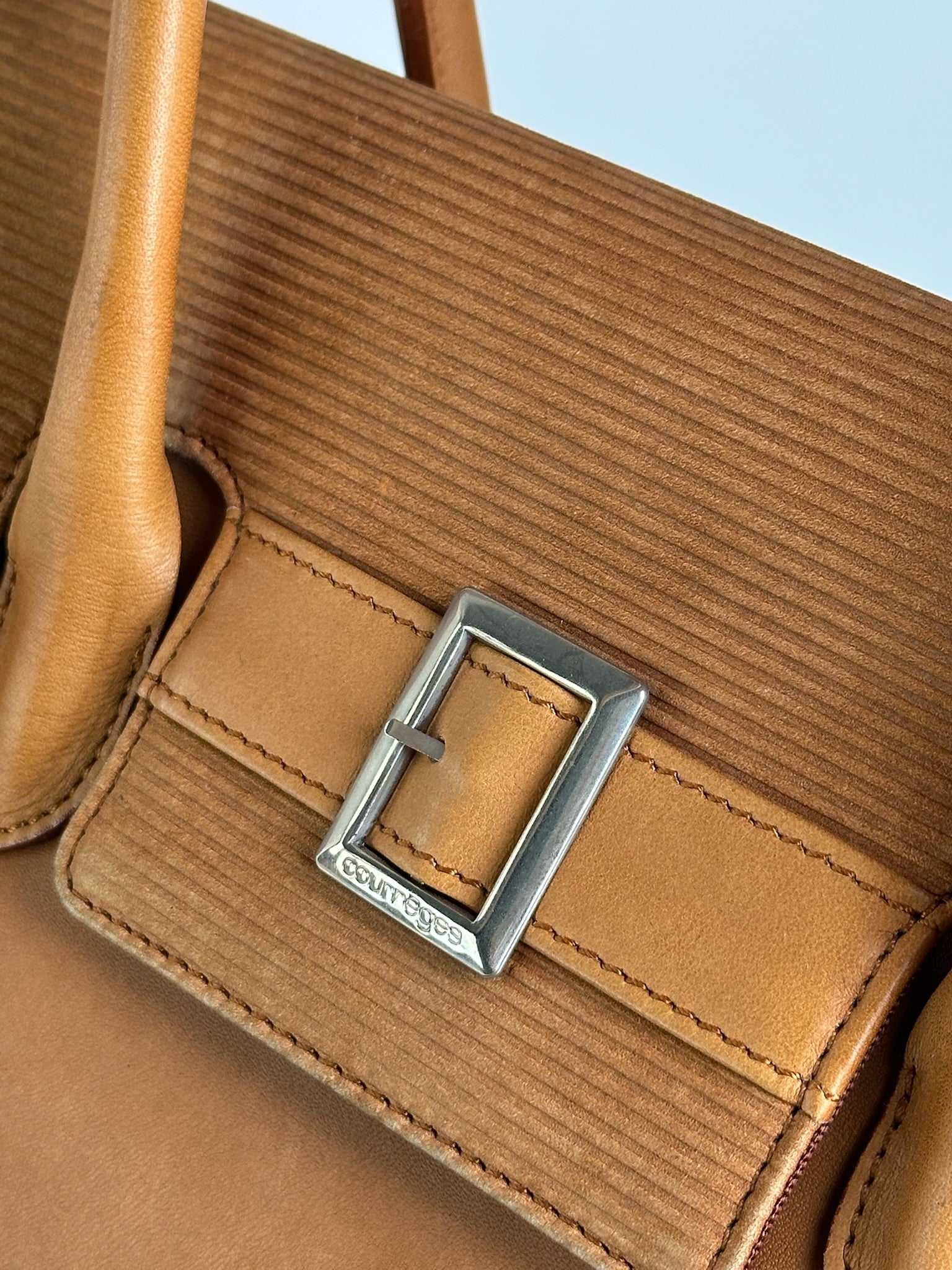 COURRÈGES Vintage Wool and Leather Handbag. This chic handbag is finely crafted of brown wool fabric with tan leather trim. The shoulder bag features two handles and a top magnetic closure. The interior is lined with orange-brown canvas.