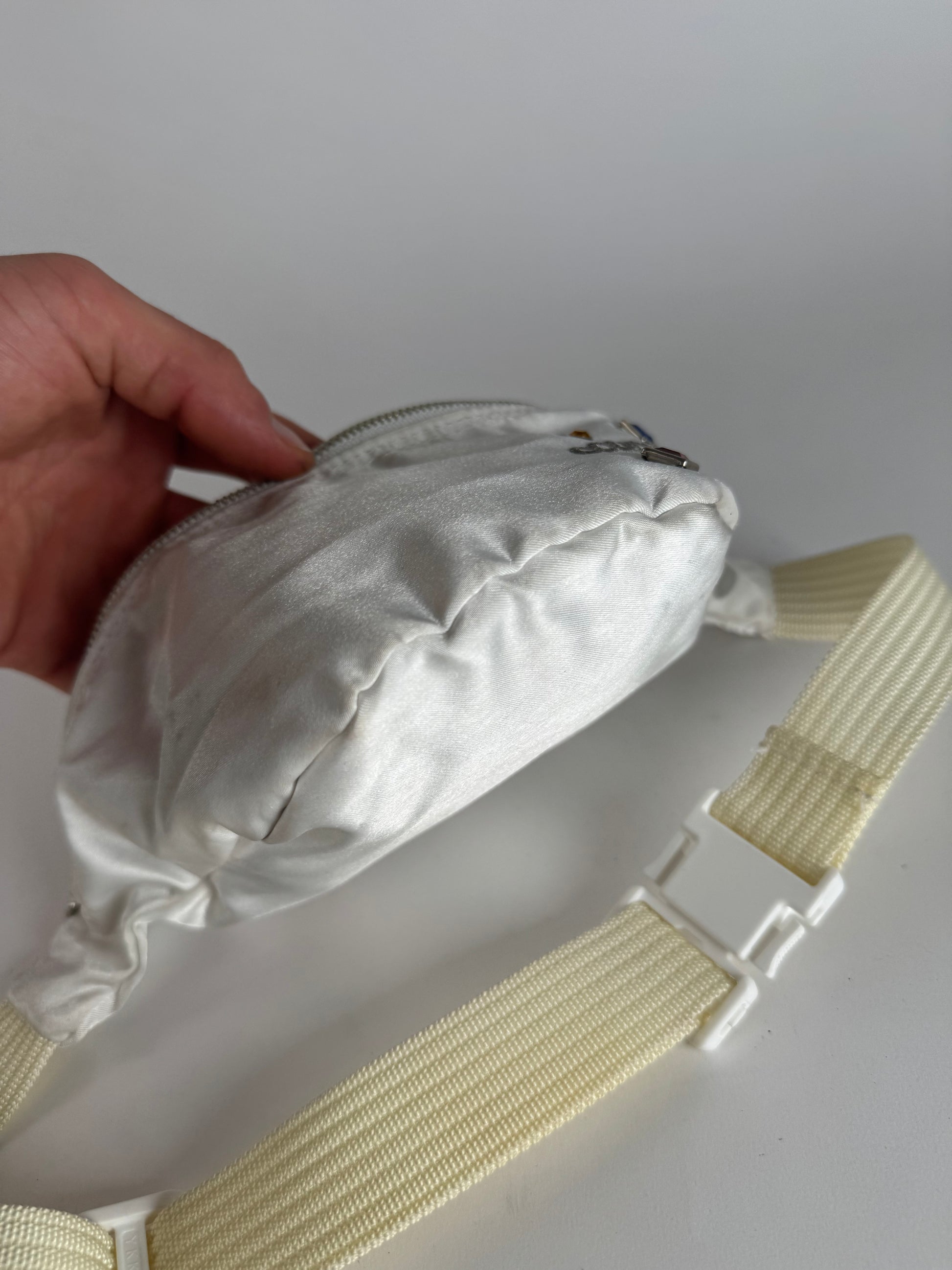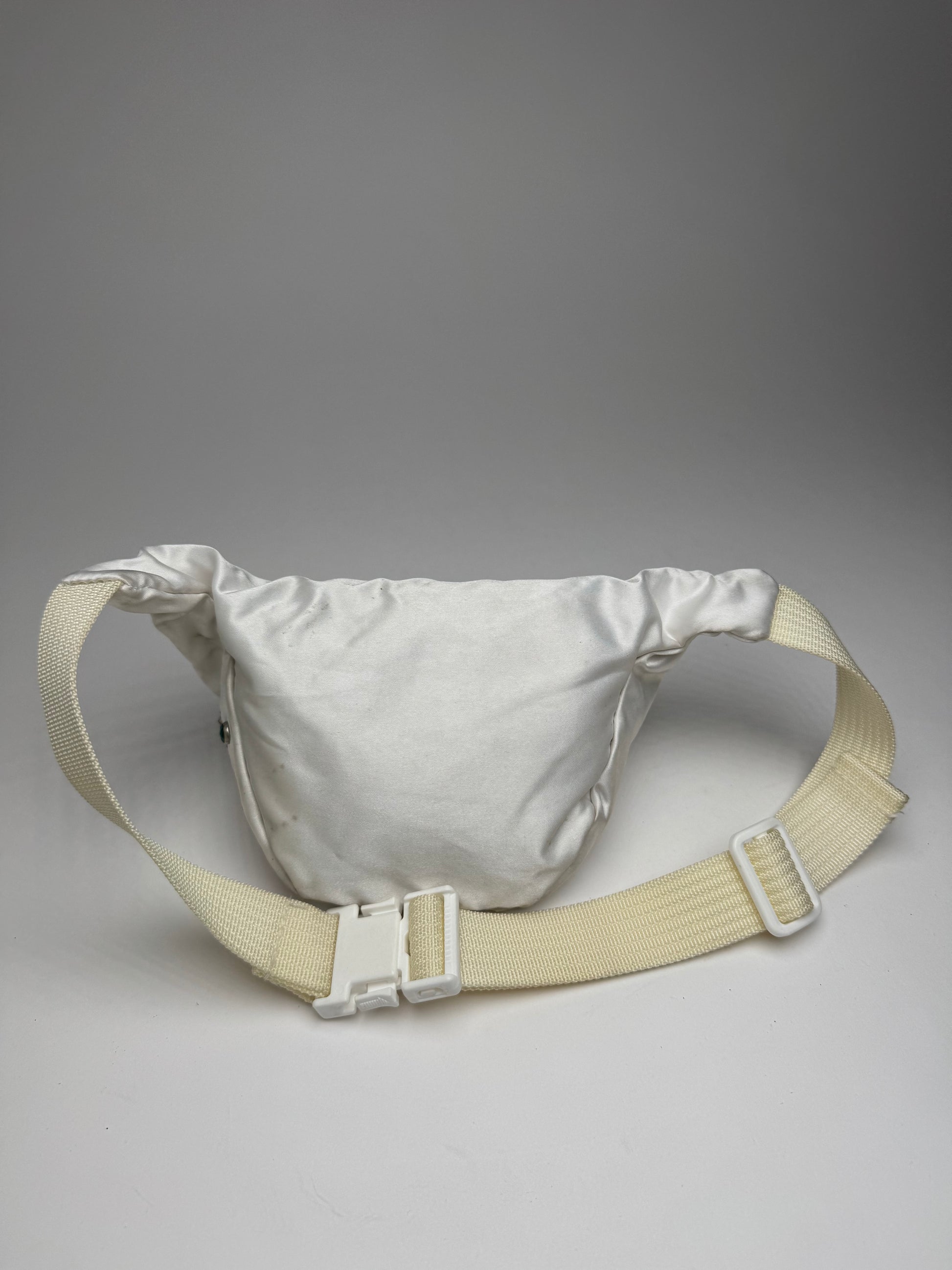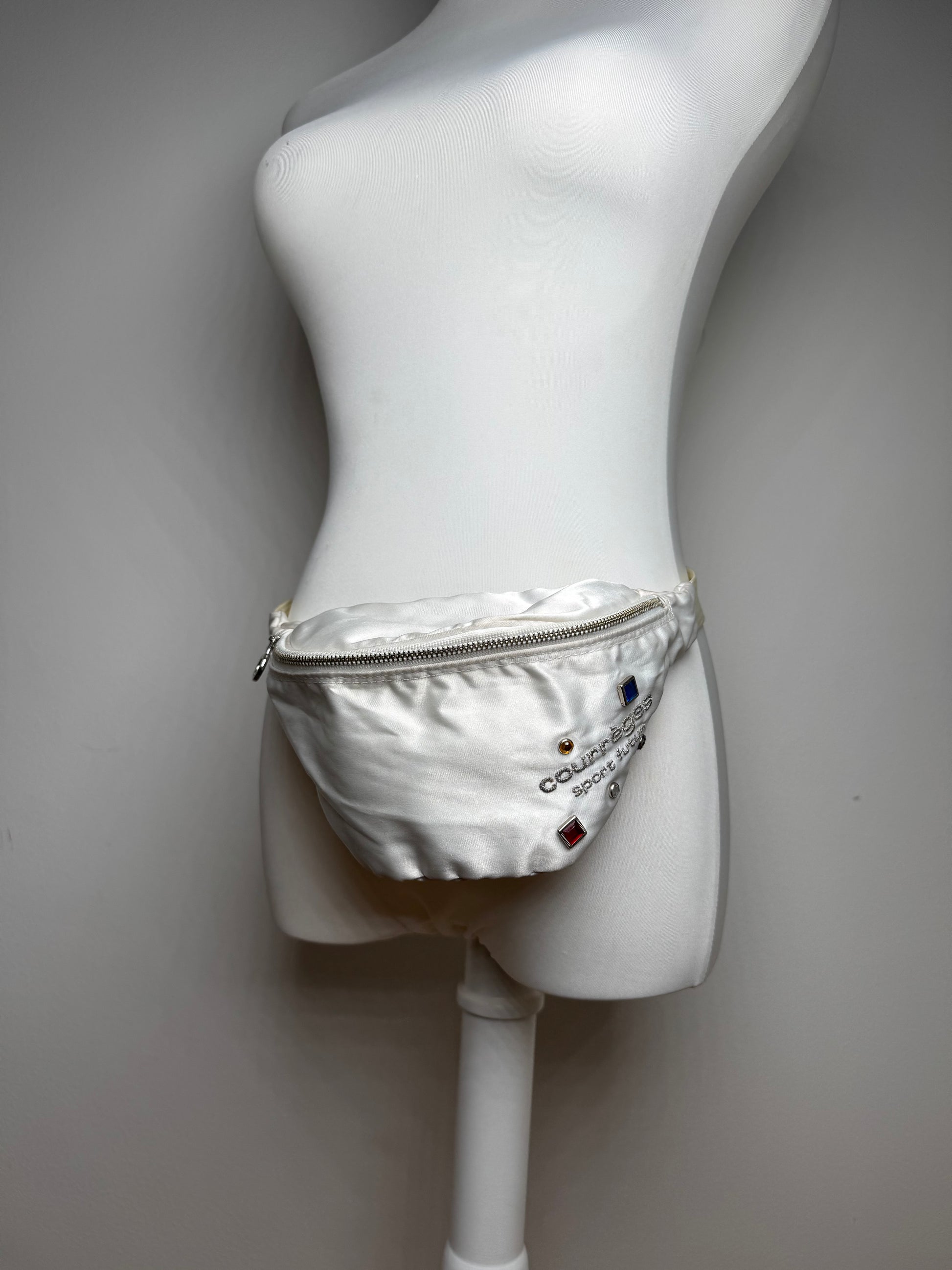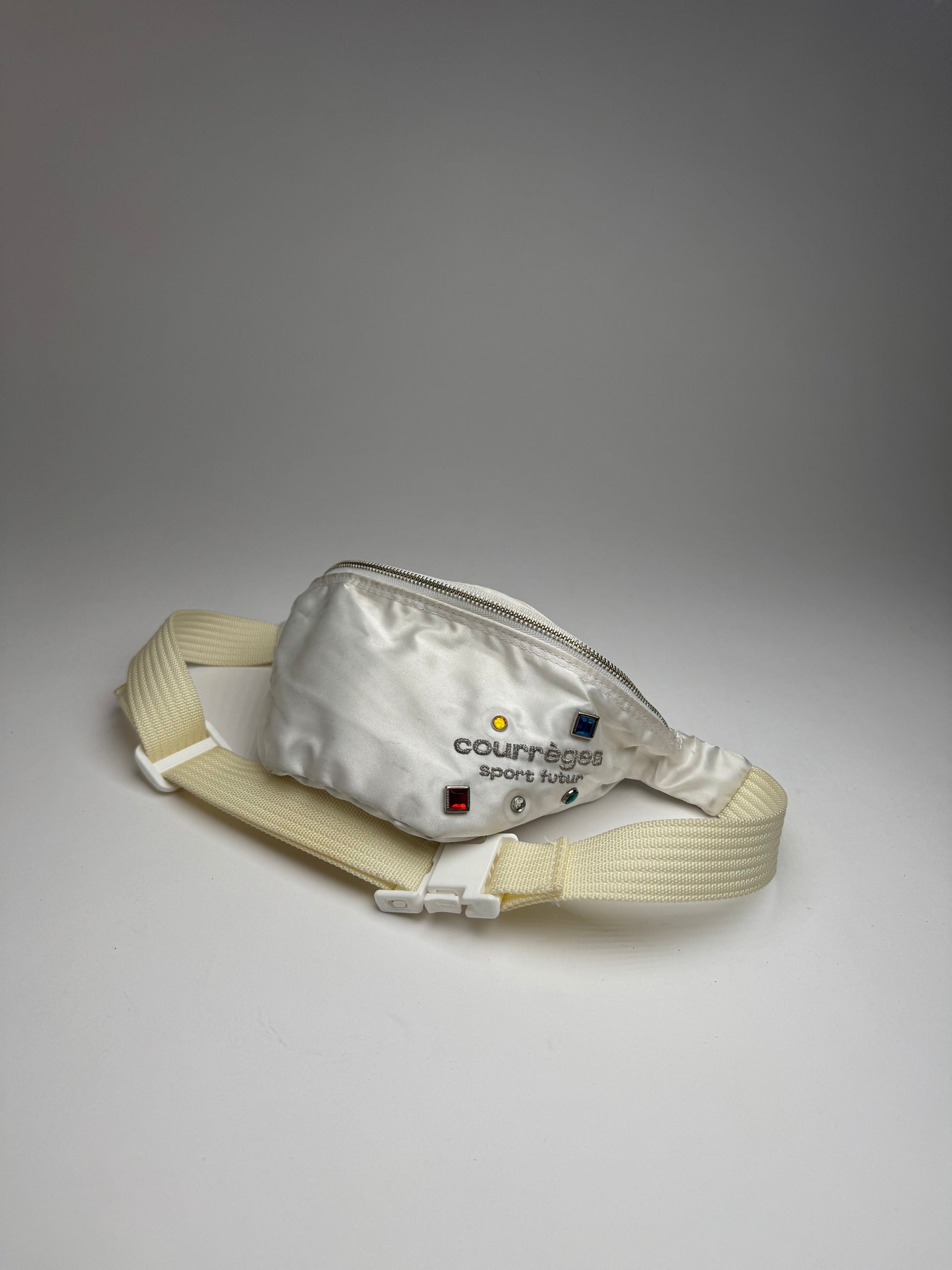 COURRÈGES PARIS Vintage Crossbody / Bum Bag. This vintage Courrèges Paris bag is crafted from white canvas and polyester , offering a sleek and sporty design. The adjustable strap in an ivory tone allows for versatile wear. The silver-tone steel hardware is adorned with colorful Swarovski stones , adding a unique and luxurious touch. Despite light spots , the bag remains in very good condition . A stylish unisex accessory.