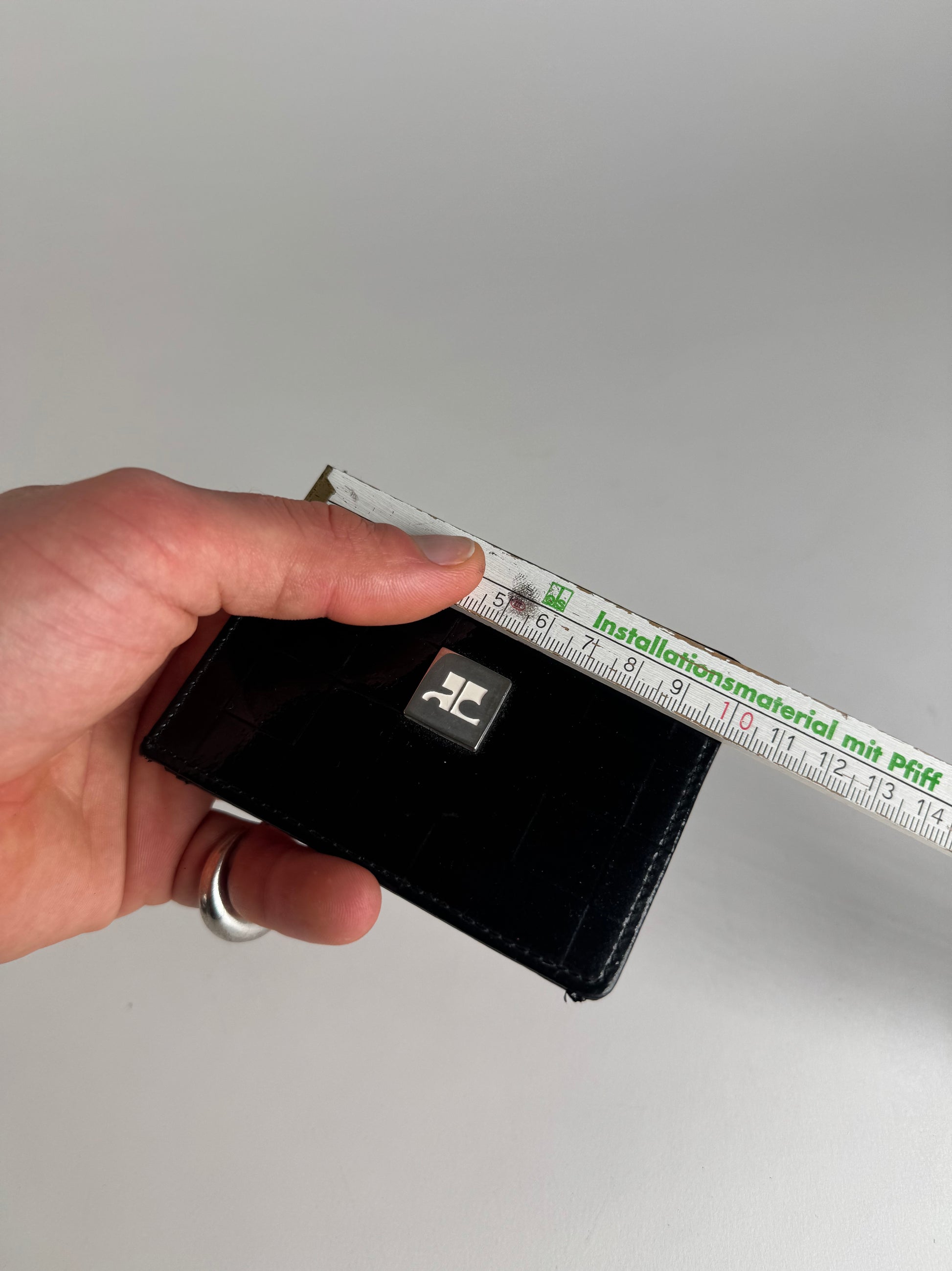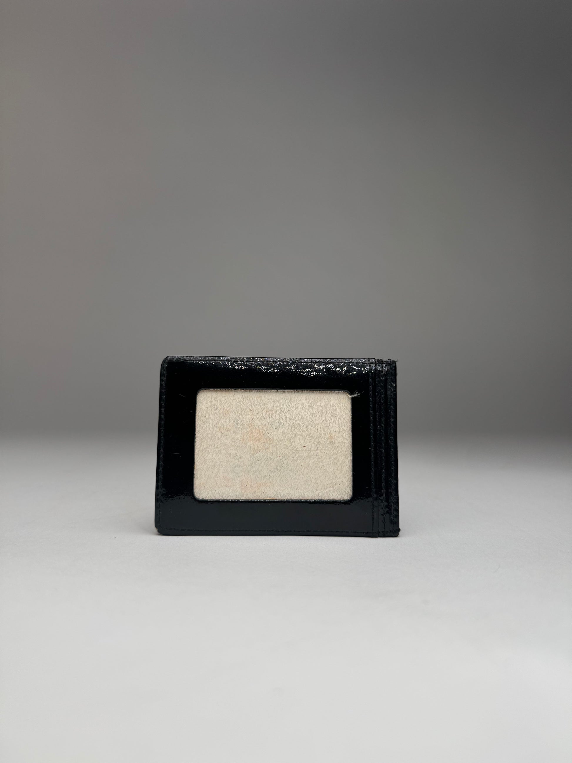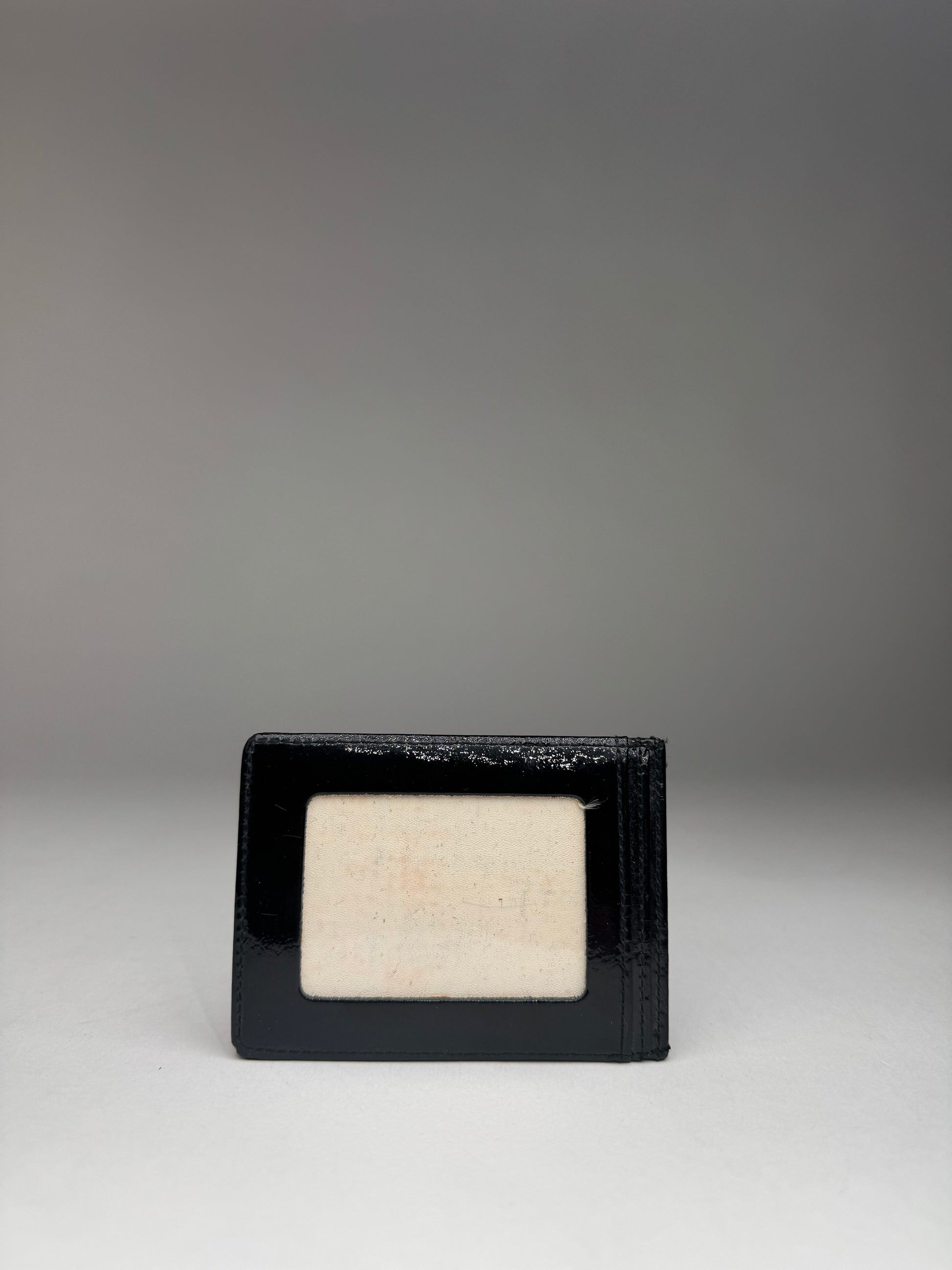 COURRÈGES PARIS Vintage Card Holder. This vintage Courrèges Paris card holder is crafted from black patent leather , featuring the Courrèges logo on the front for a sleek and sophisticated look. The interior is lined with white leather , creating a refined contrast. Despite some spots , the card holder remains in very good condition . A stylish unisex accessory.