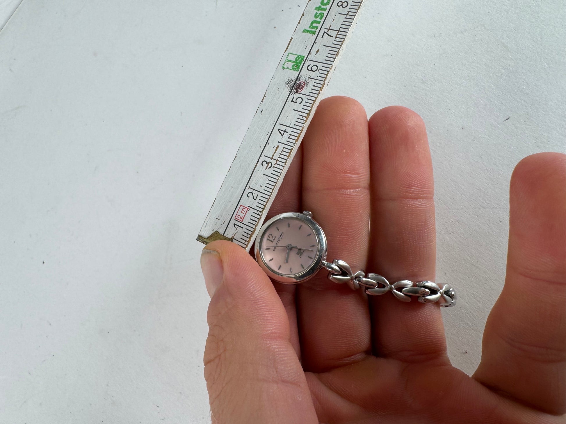 COURRÈGES PARIS Vintage Watch. This refined vintage wristwatch features a delicate chain-style bracelet crafted of silver-tone steel. The watch has a rose mother-of-pearl dial with silver-tone hands and a silver Courrèges logo on the dial. It is powered by a quartz movement, and the battery has been recently replaced. The watch is water-resistant and made in Japan.