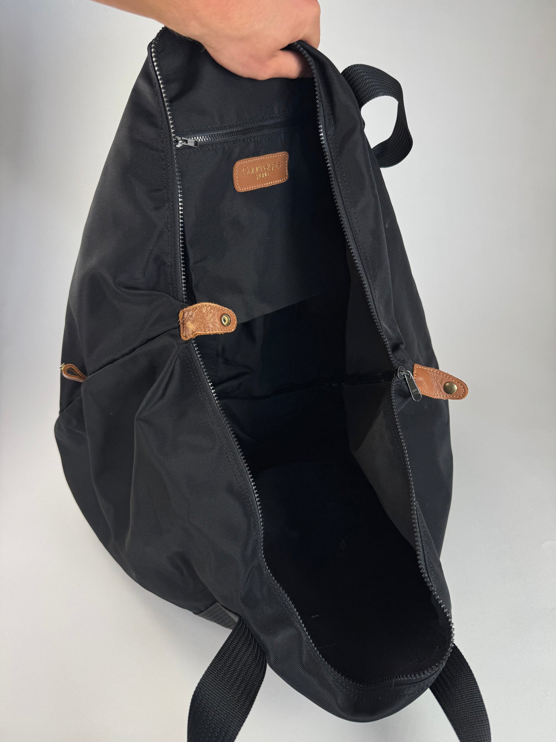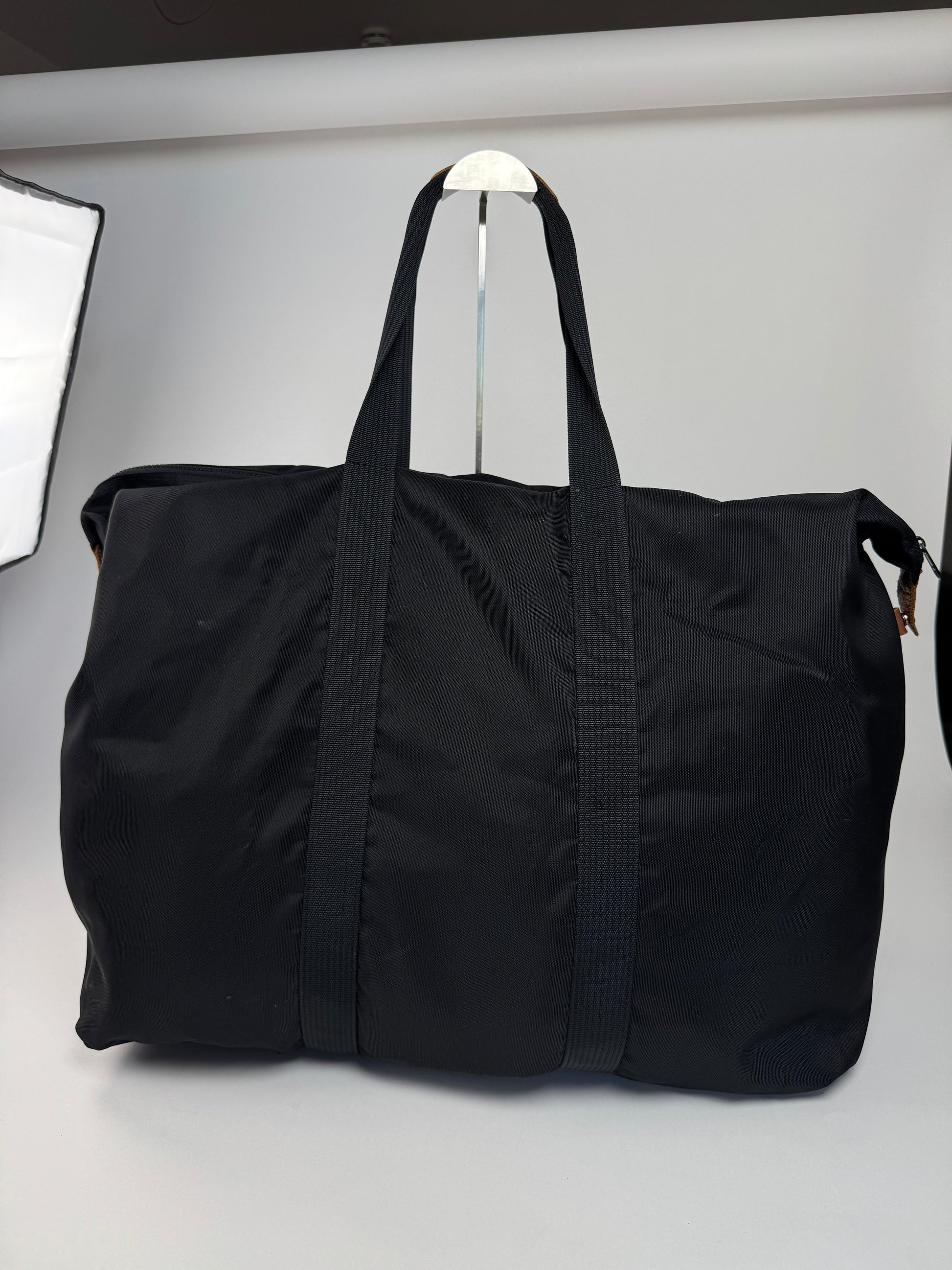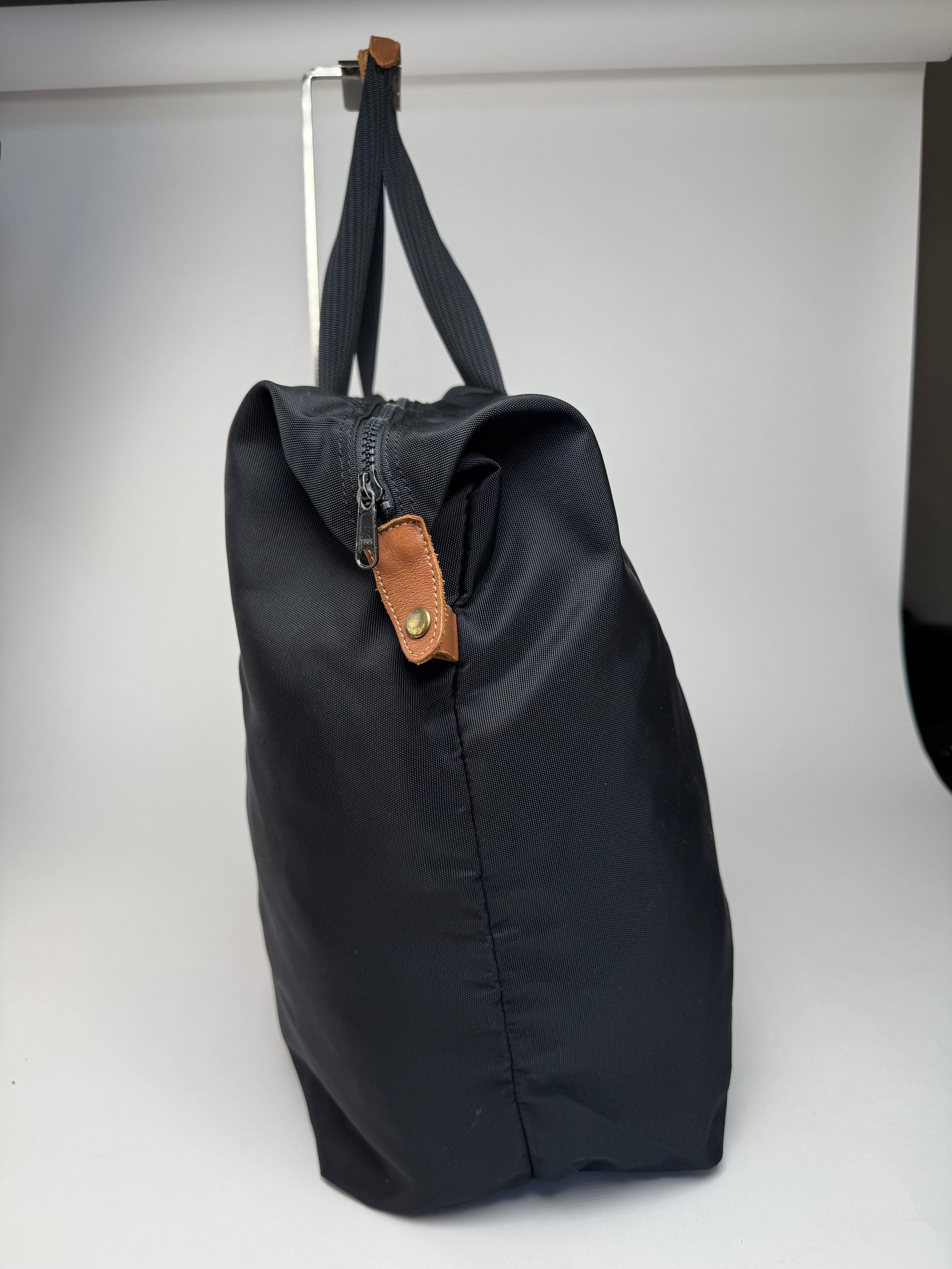 This stylish vintage weekender bag from Courrèges Paris is made from black polyester with brown leather details. The bag features gold-toned hardware made of steel, adding a luxurious touch. It is unisex and perfect for travel or everyday use.