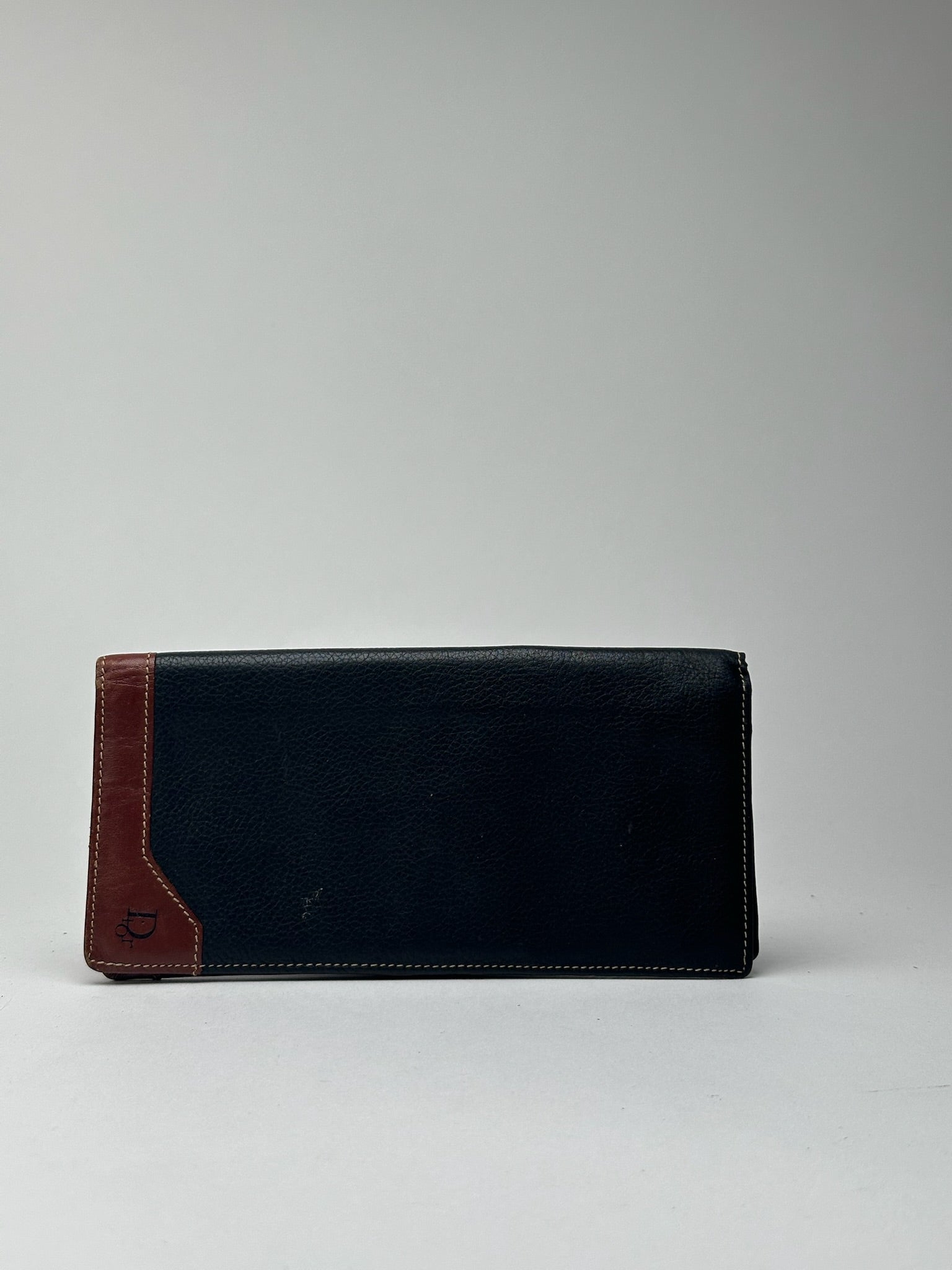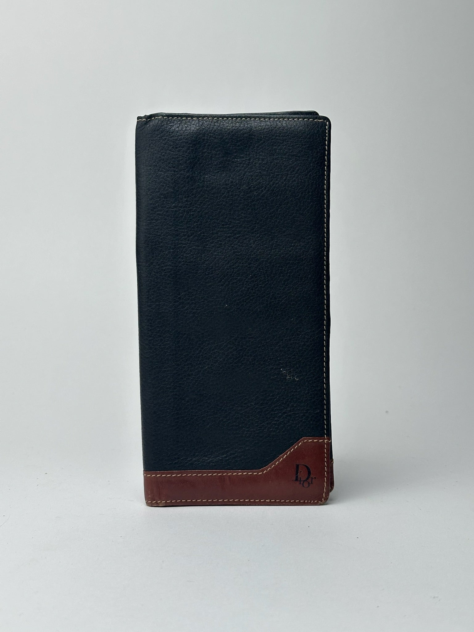 DIOR vintage card holder. This sleek cardholder is finely crafted of black leather with contrasting brown leather accents. The front features an embossed Dior logo, adding a subtle signature touch. The interior includes a transparent PVC ID slot and multiple compartments, all lined in black leather.