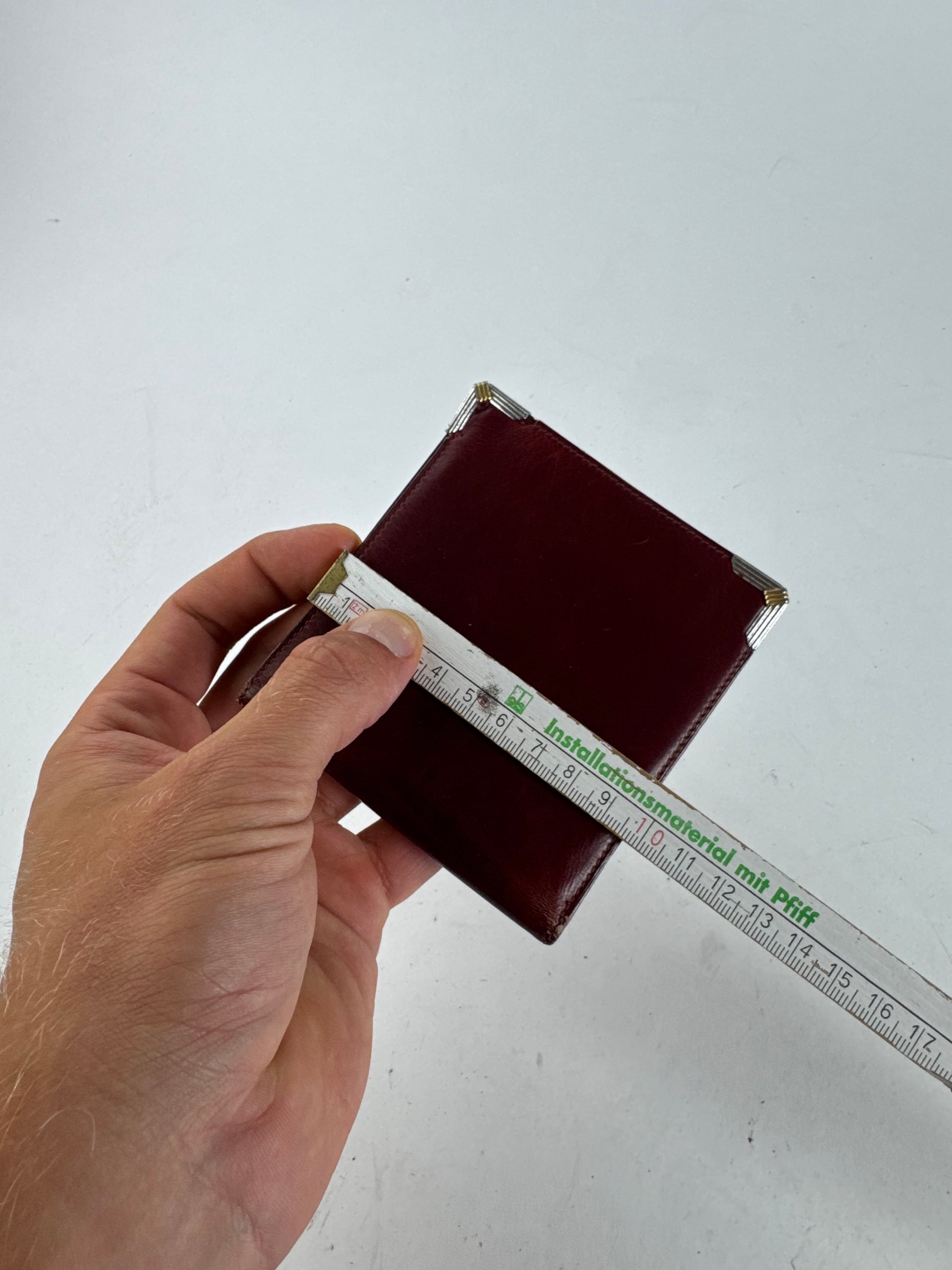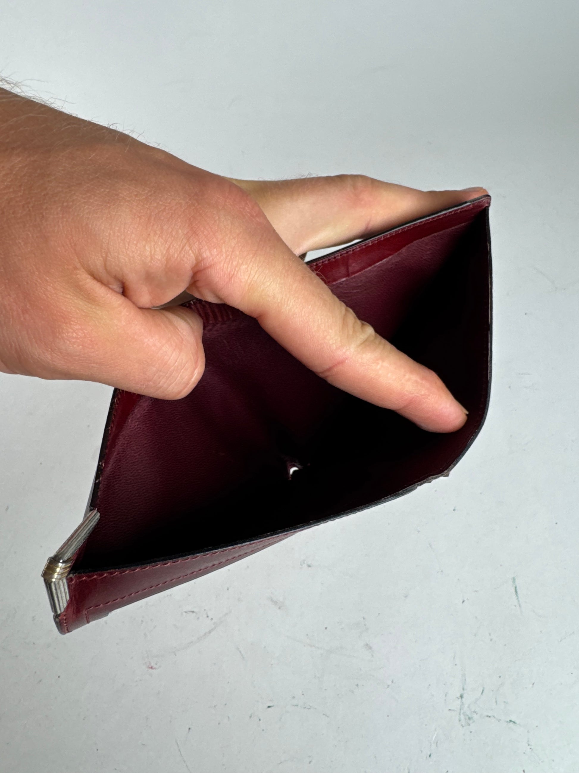 DIOR Vintage Exclusive Wallet. This vintage foldable wallet is finely crafted of purple-red leather. The front right corners are accented with silver and gold-toned steel caps. The interior features compartments for coins, cards, and bills.