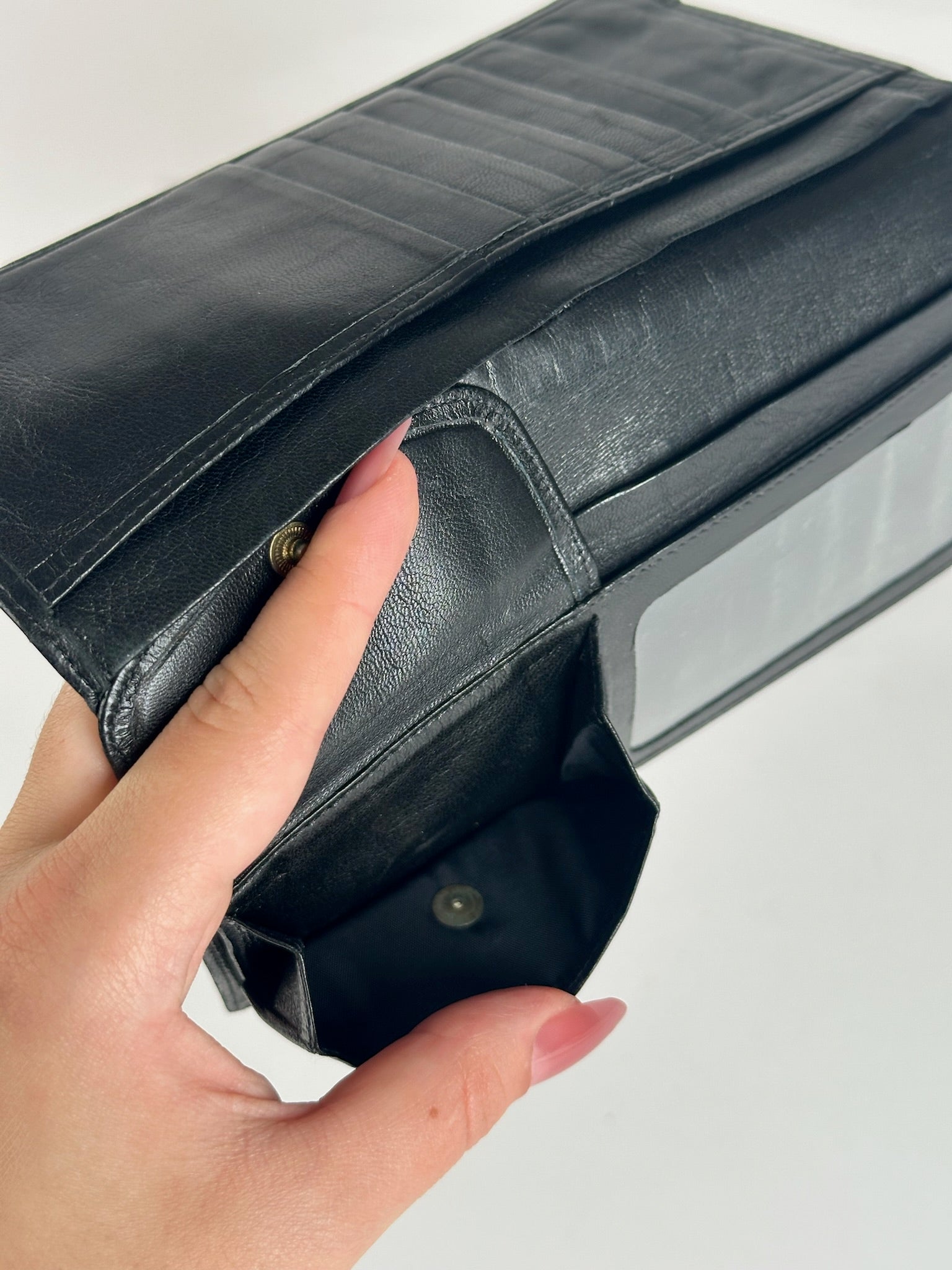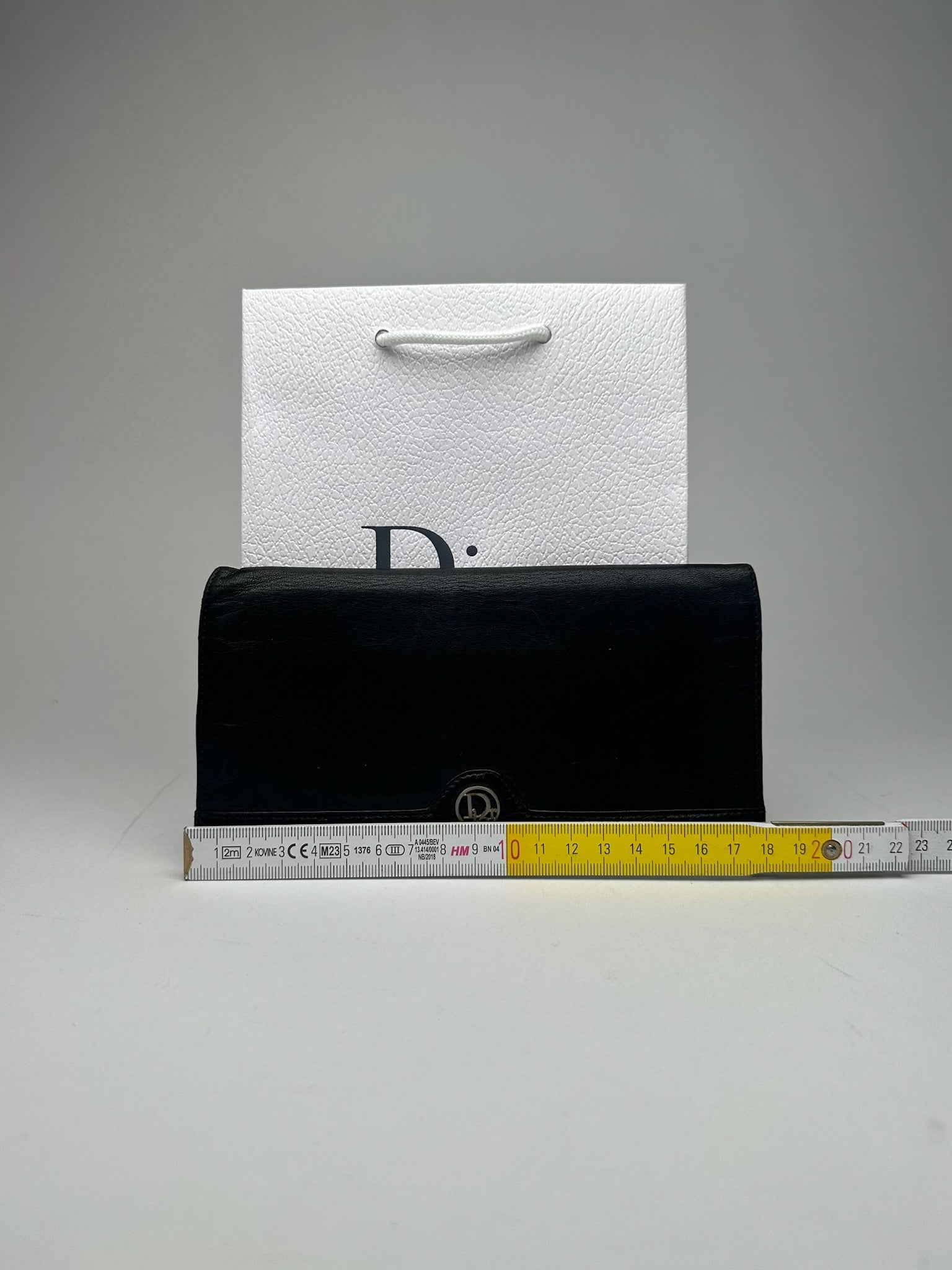DIOR Vintage Cardholder / ID Wallet. This elegant piece is finely crafted of black leather with a gold-tone steel Dior logo on the front. The interior is also lined with black leather and includes a coin compartment and a transparent PVC ID slot. Made in Italy.
