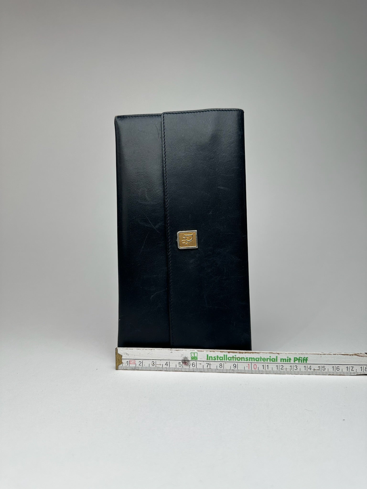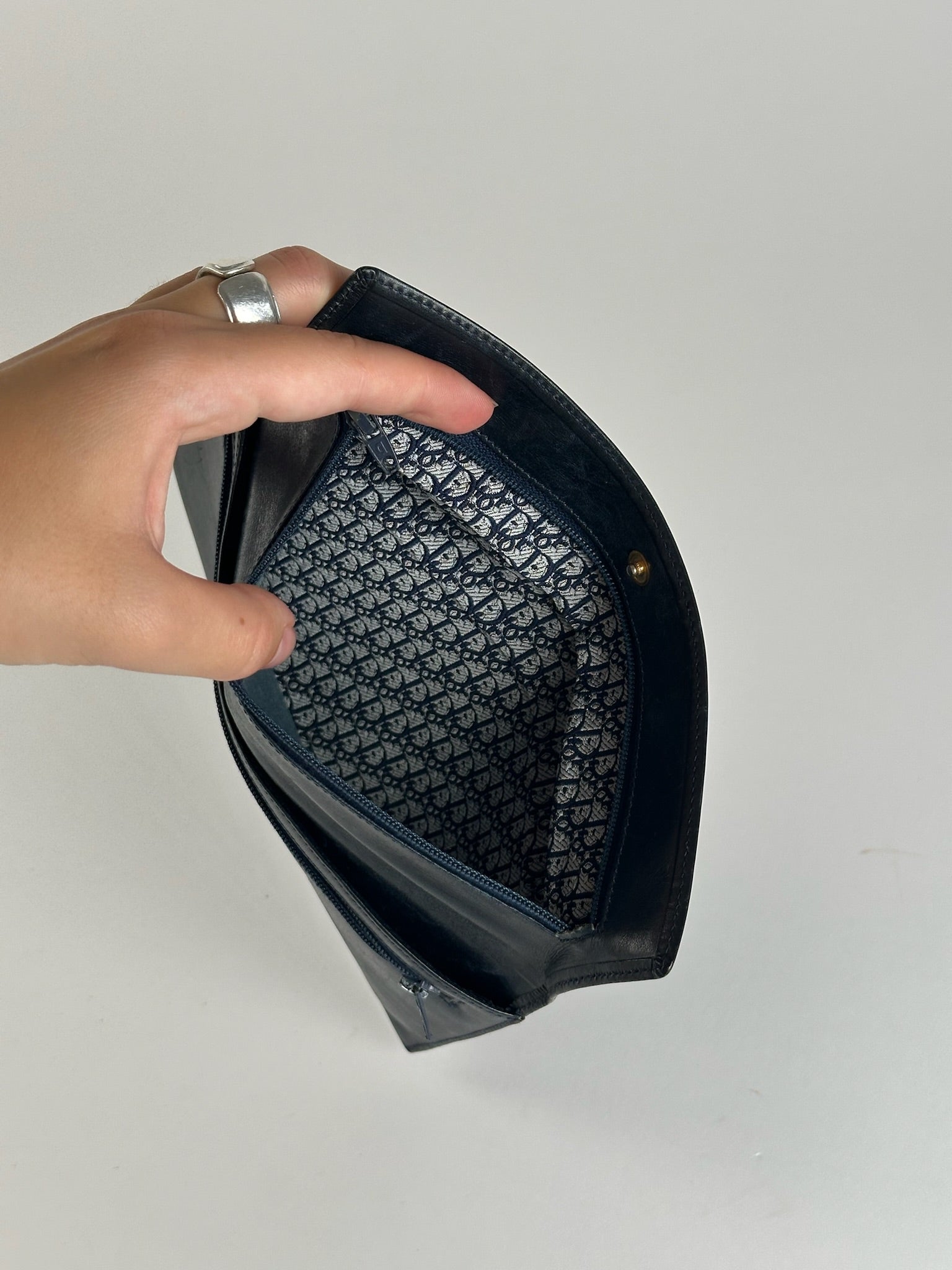 DIOR Vintage Leather Wallet. This chic wallet is finely crafted of navy leather with gold-tone steel hardware and features the Dior logo on the front in a combination of silver and gold-tone steel. It has a snap button closure and is lined in matching marine blue leather. The trimming is made of navy-grey canvas with the iconic Dior Oblique monogram.