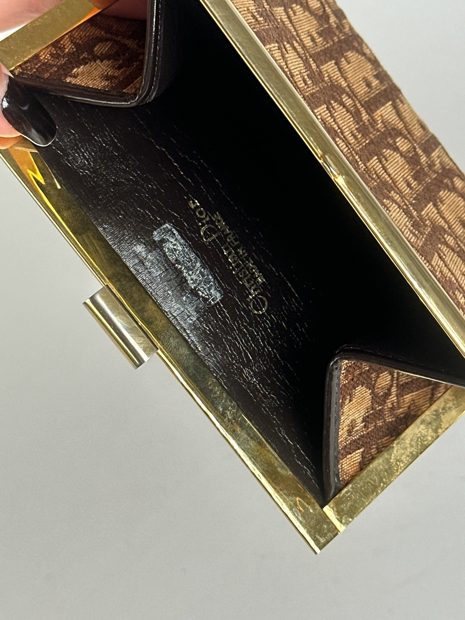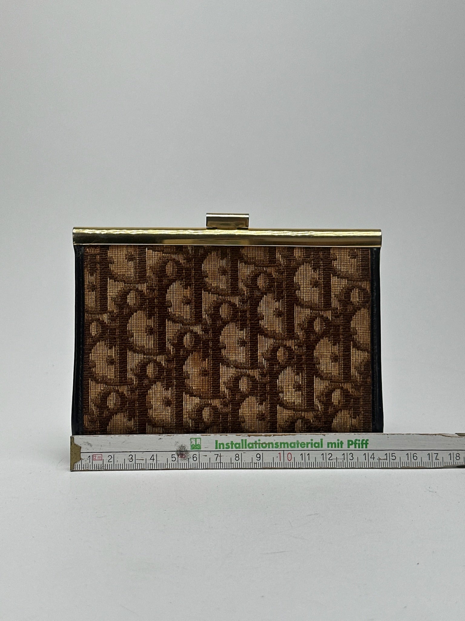 This vintage clutch or card holder is crafted in Dior's signature beige-red-brown Oblique canvas, a pattern introduced by Marc Bohan in 1967 that quickly became a symbol of the house's graphic elegance and remains a Dior icon to this day. The piece features a flap closure, gold-tone steel hardware, and opens to a black leather interior.