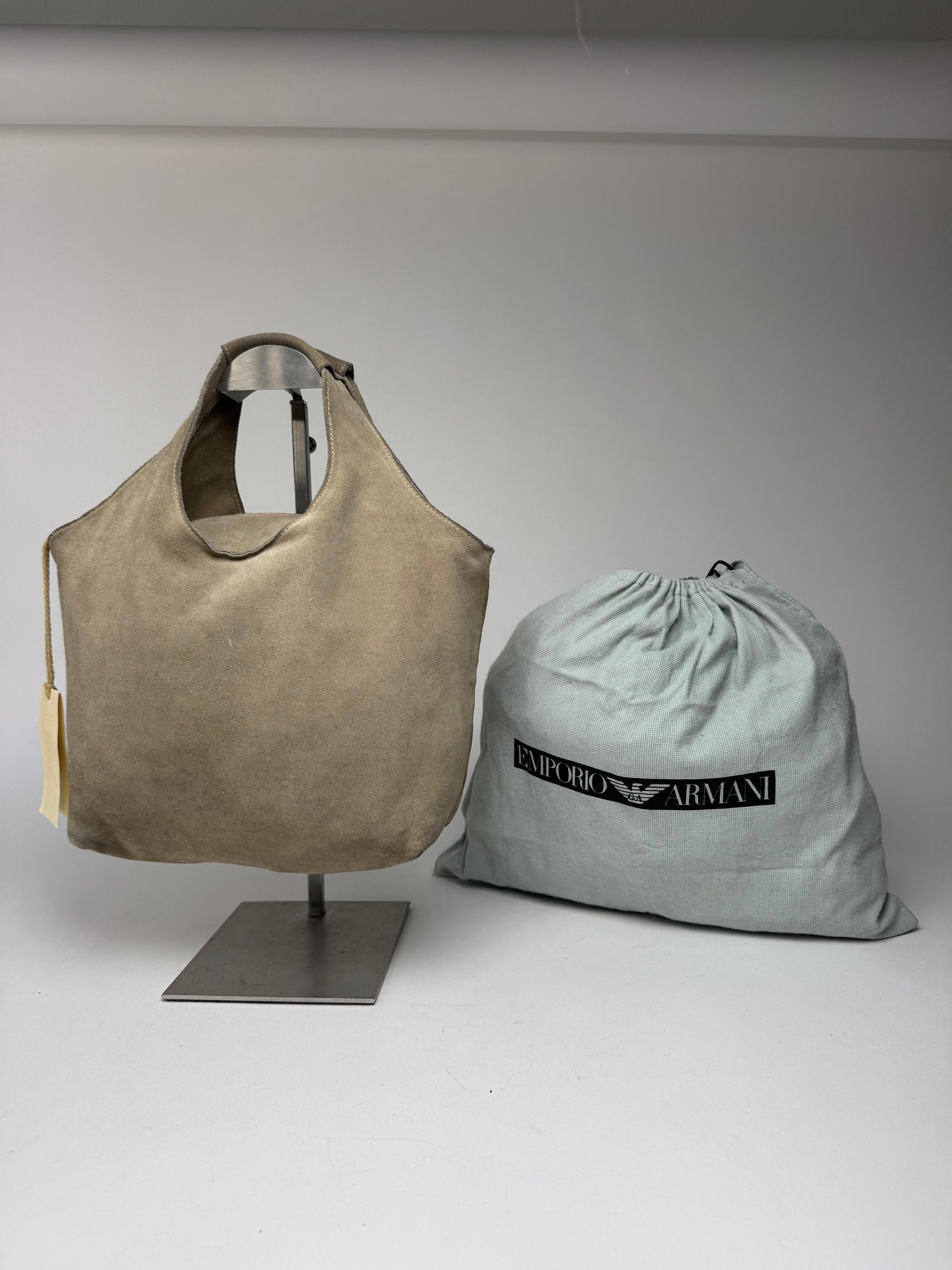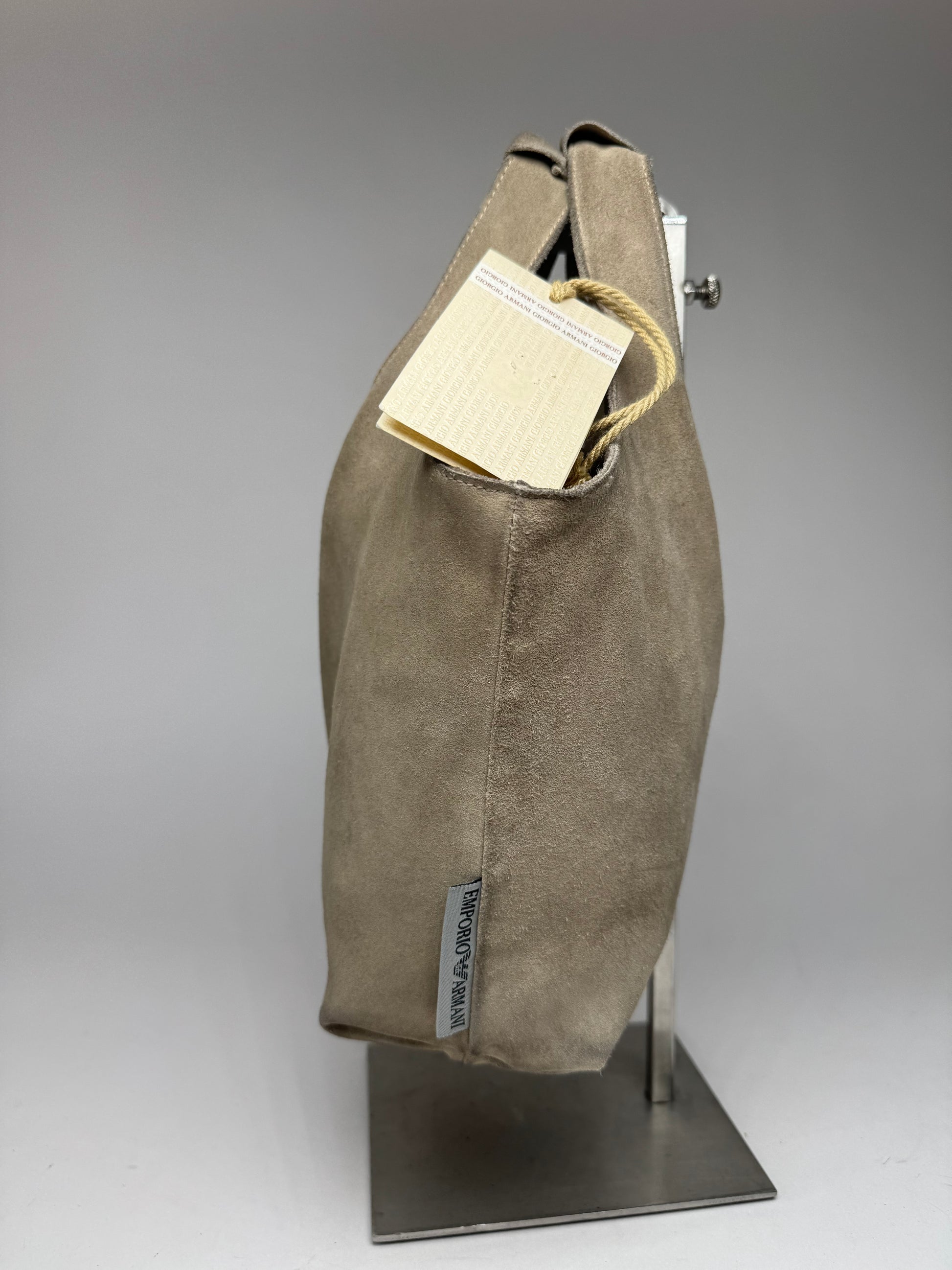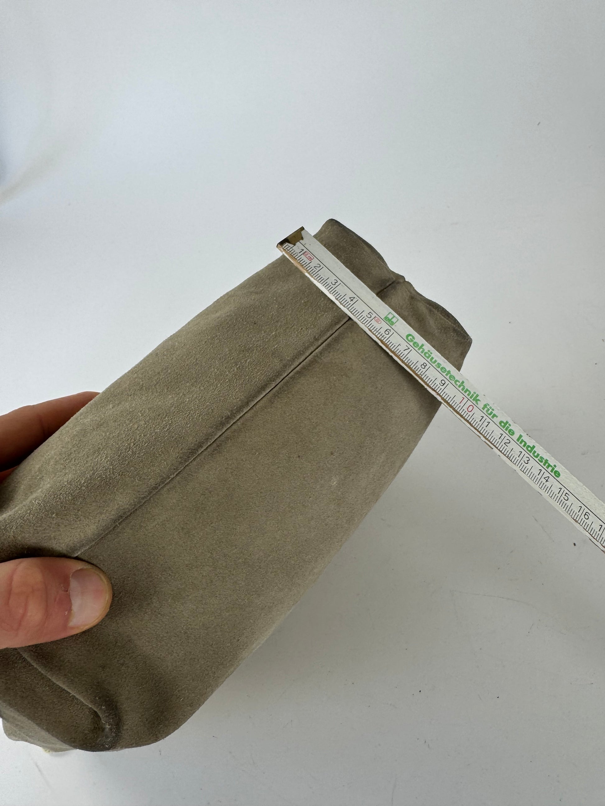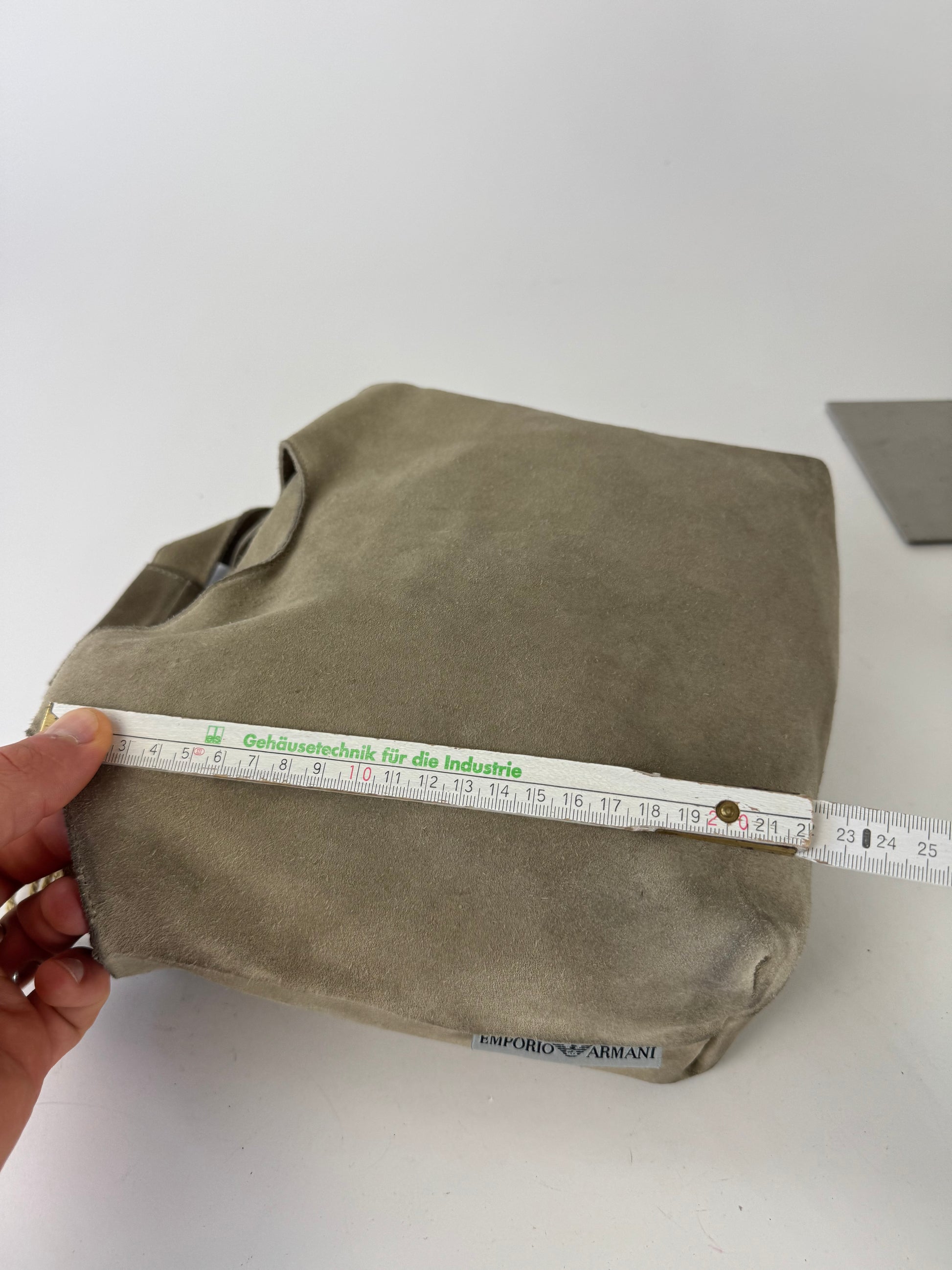 GIORGIO ARMANI Sabria vintage handbag. This chic handbag is finely crafted from beige-gray suede. The bag features silver-toned hardware and a top zipper closure.