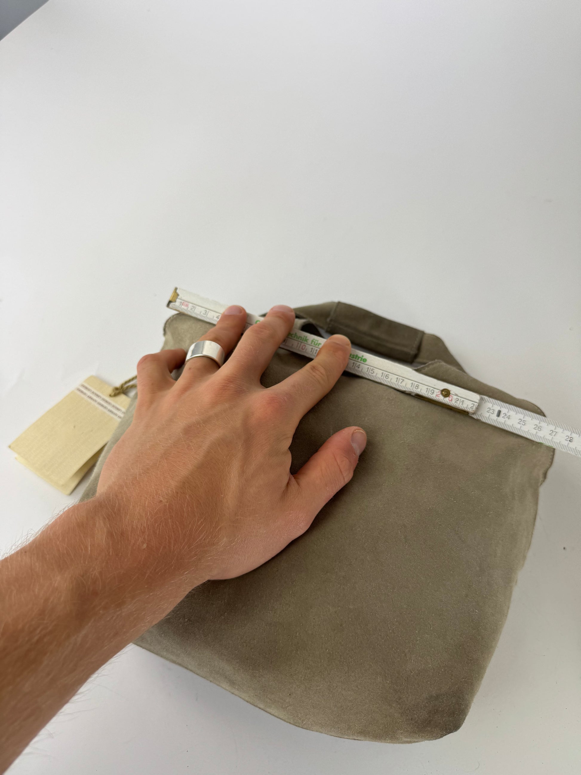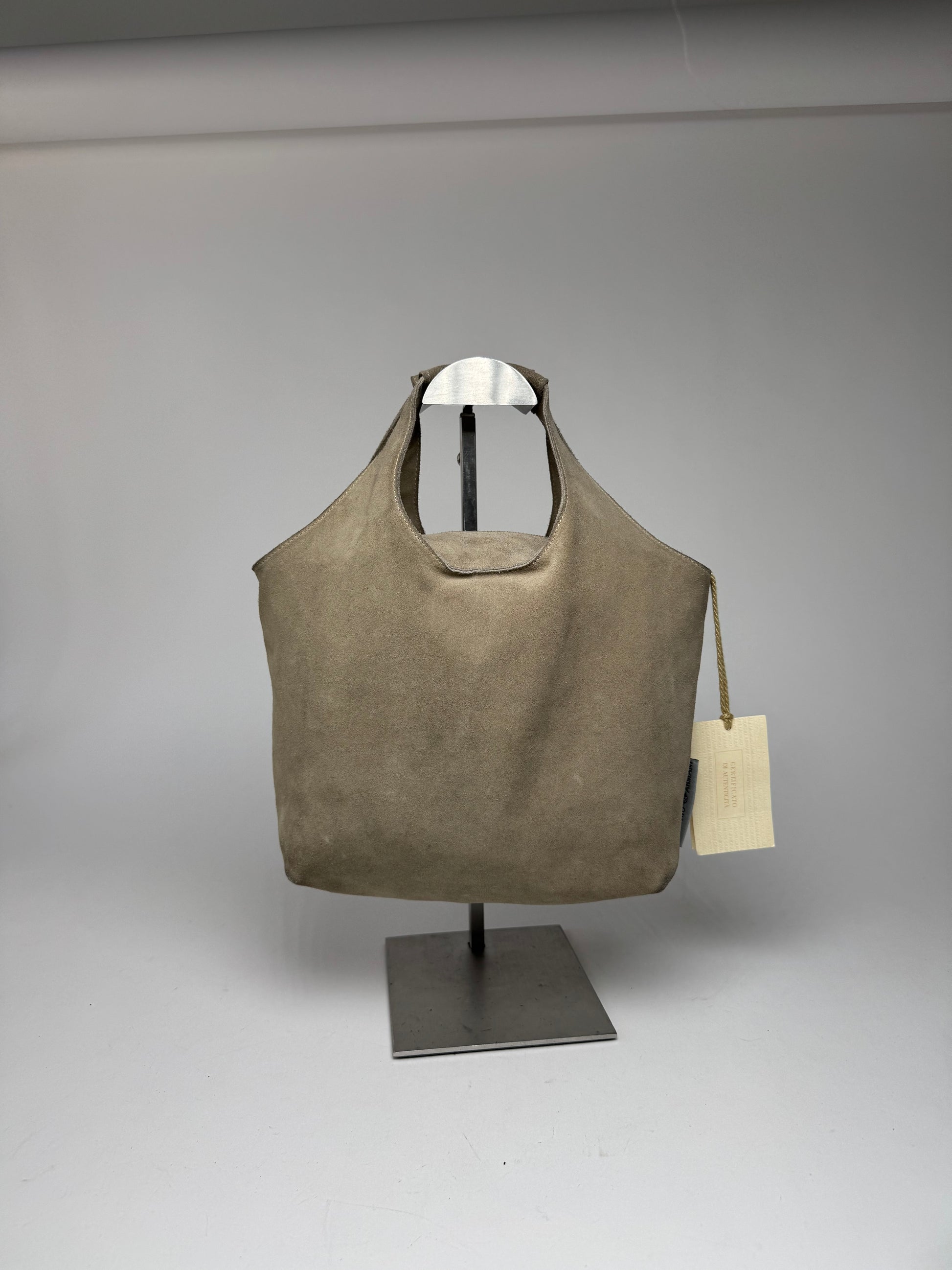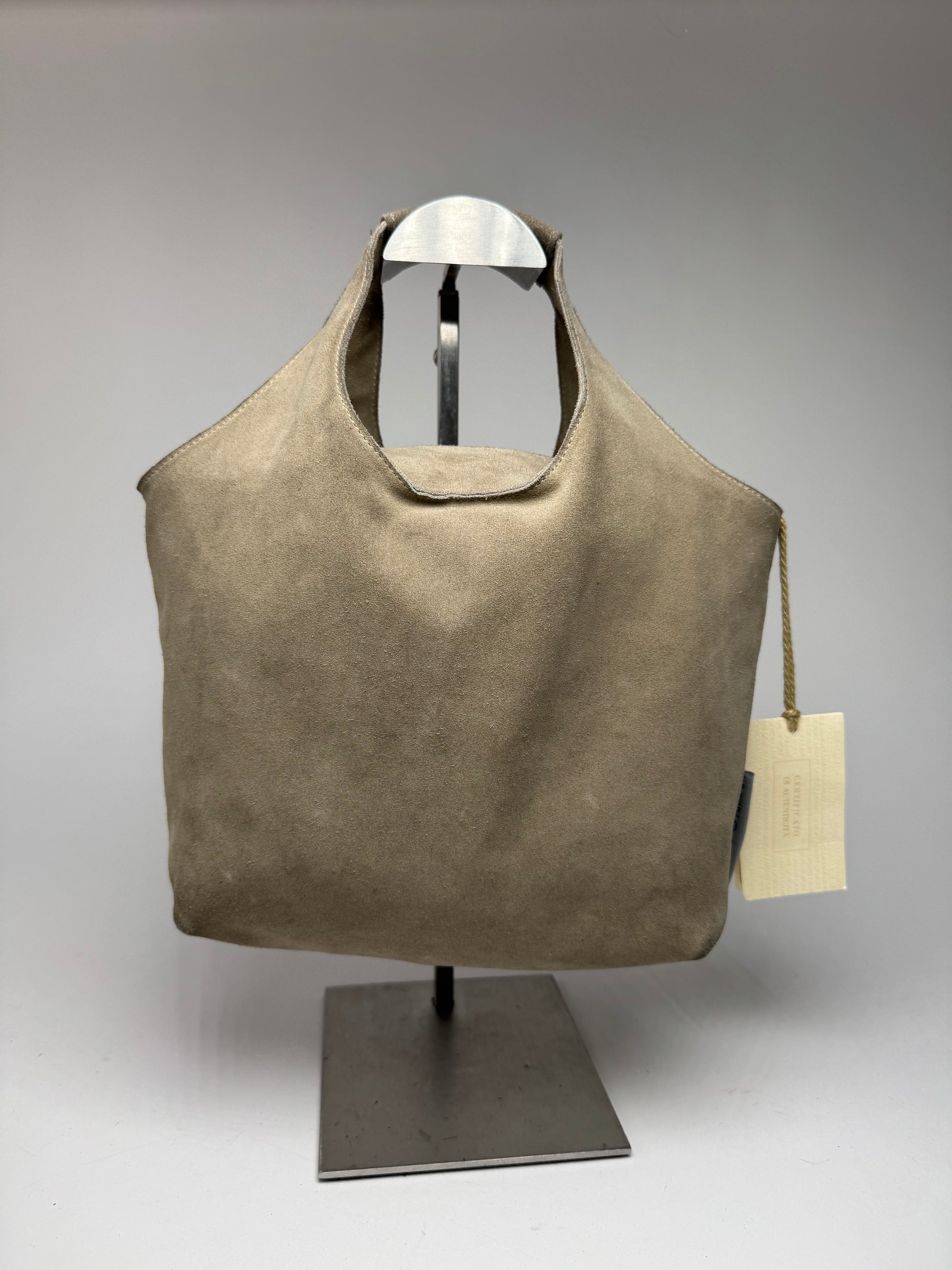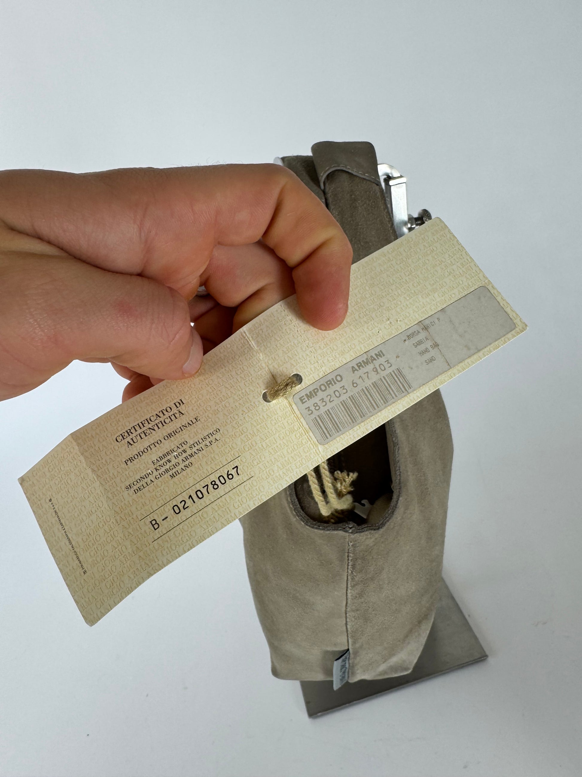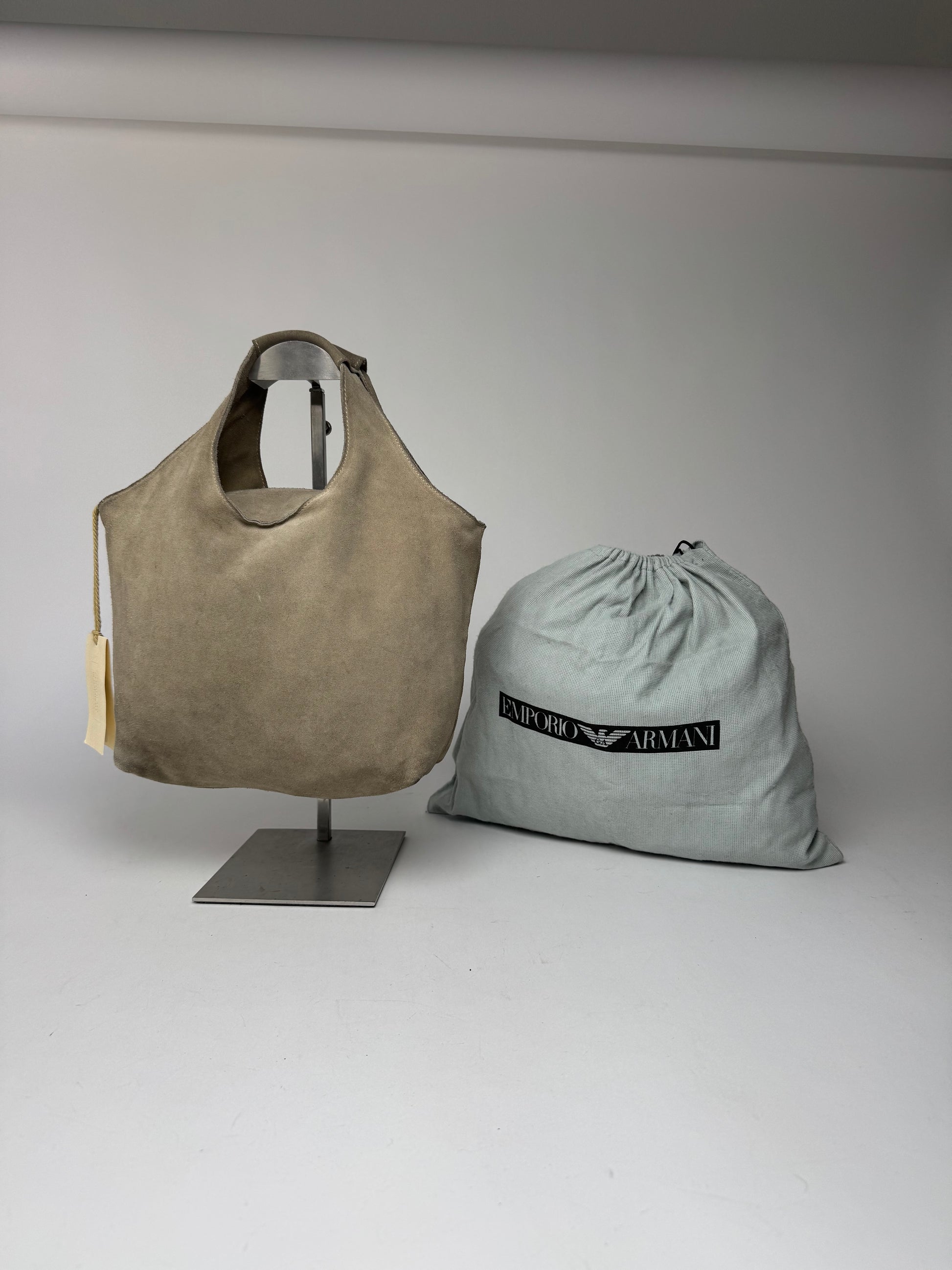 GIORGIO ARMANI Sabria vintage handbag. This chic handbag is finely crafted from beige-gray suede. The bag features silver-toned hardware and a top zipper closure.