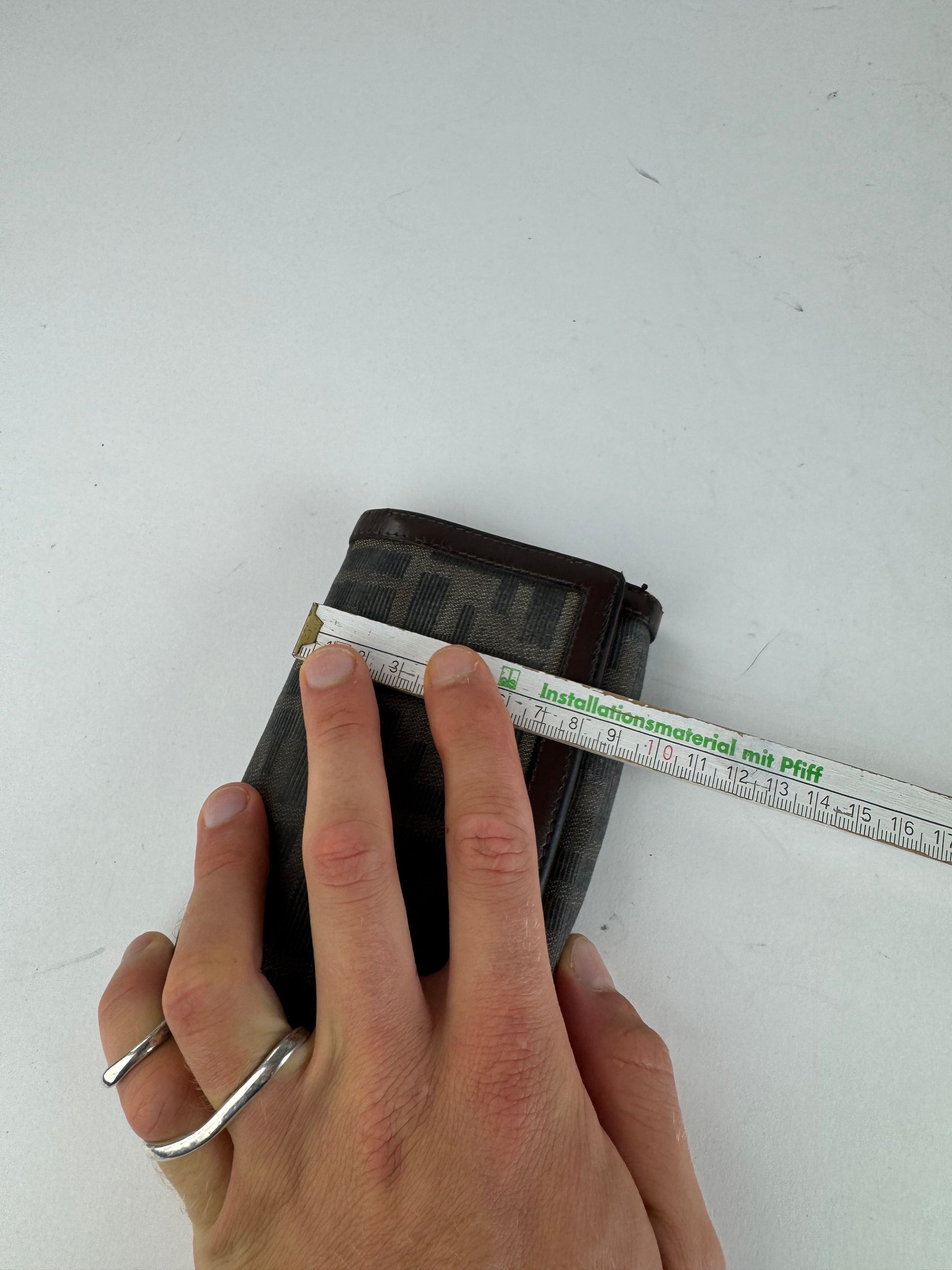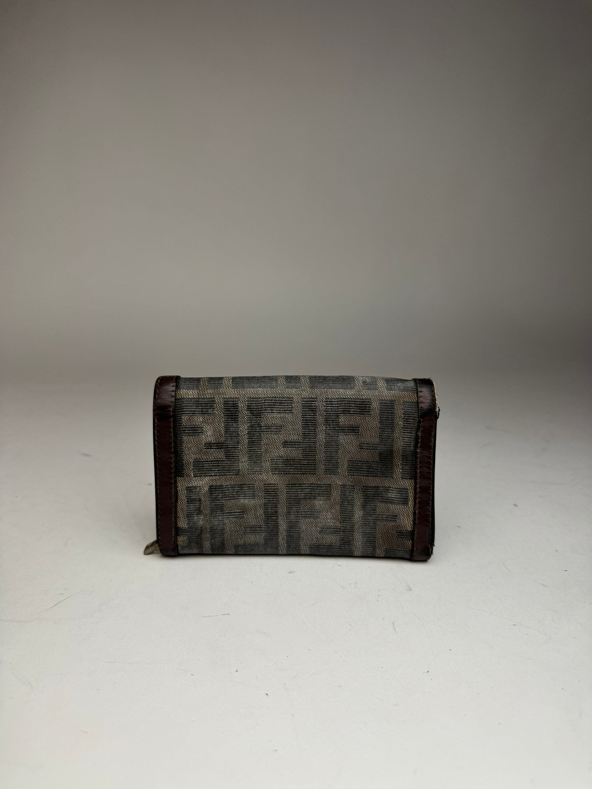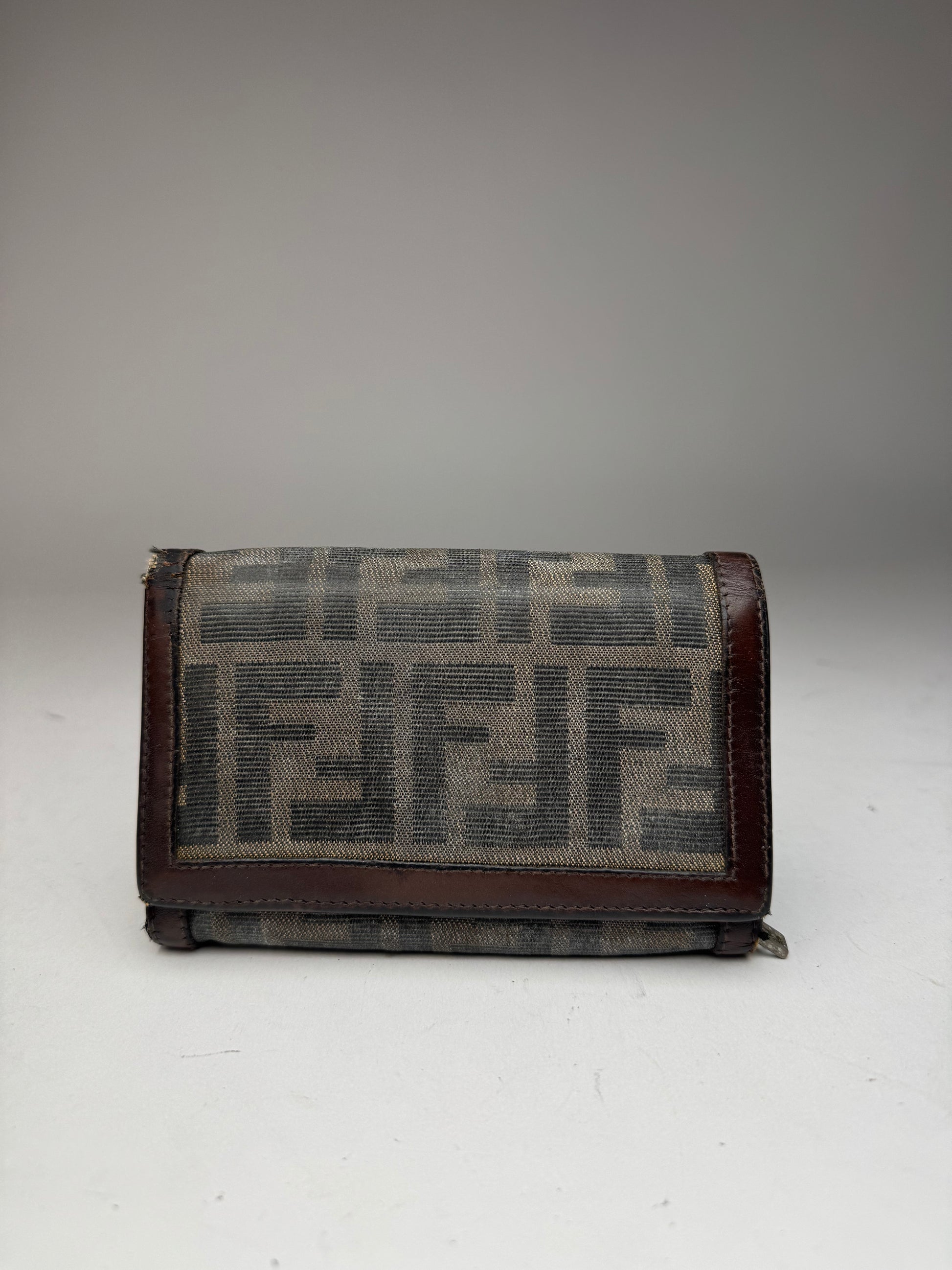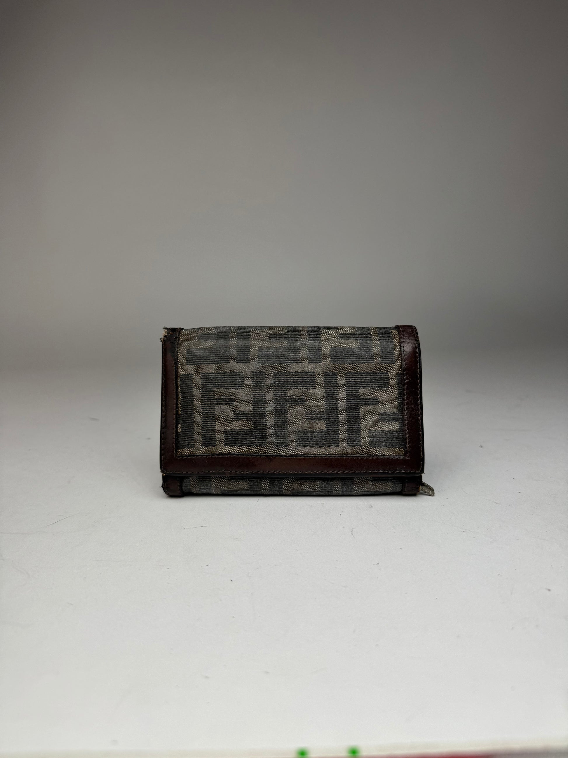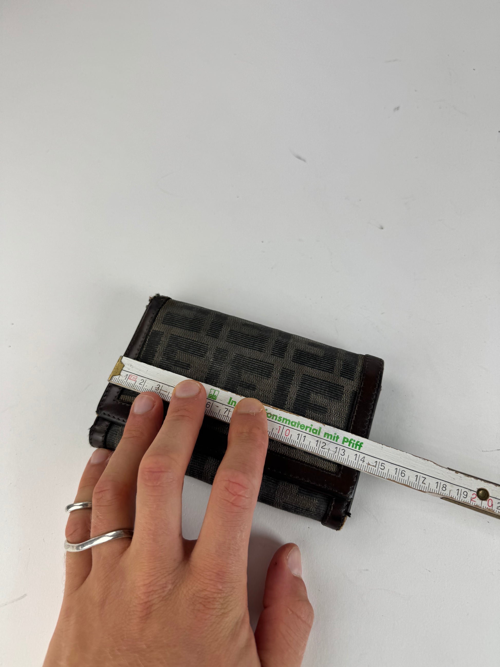 This stylish vintage wallet is finely crafted of dark brown canvas with khaki Fendi FF monogram and brown leather trim. Fendi, founded in Rome in 1925, is celebrated for its iconic FF logo, designed by Karl Lagerfeld in 1965, which has become a timeless emblem of Italian luxury. The wallet features a gold-tone snap button closure. The interior is lined with brown leather.