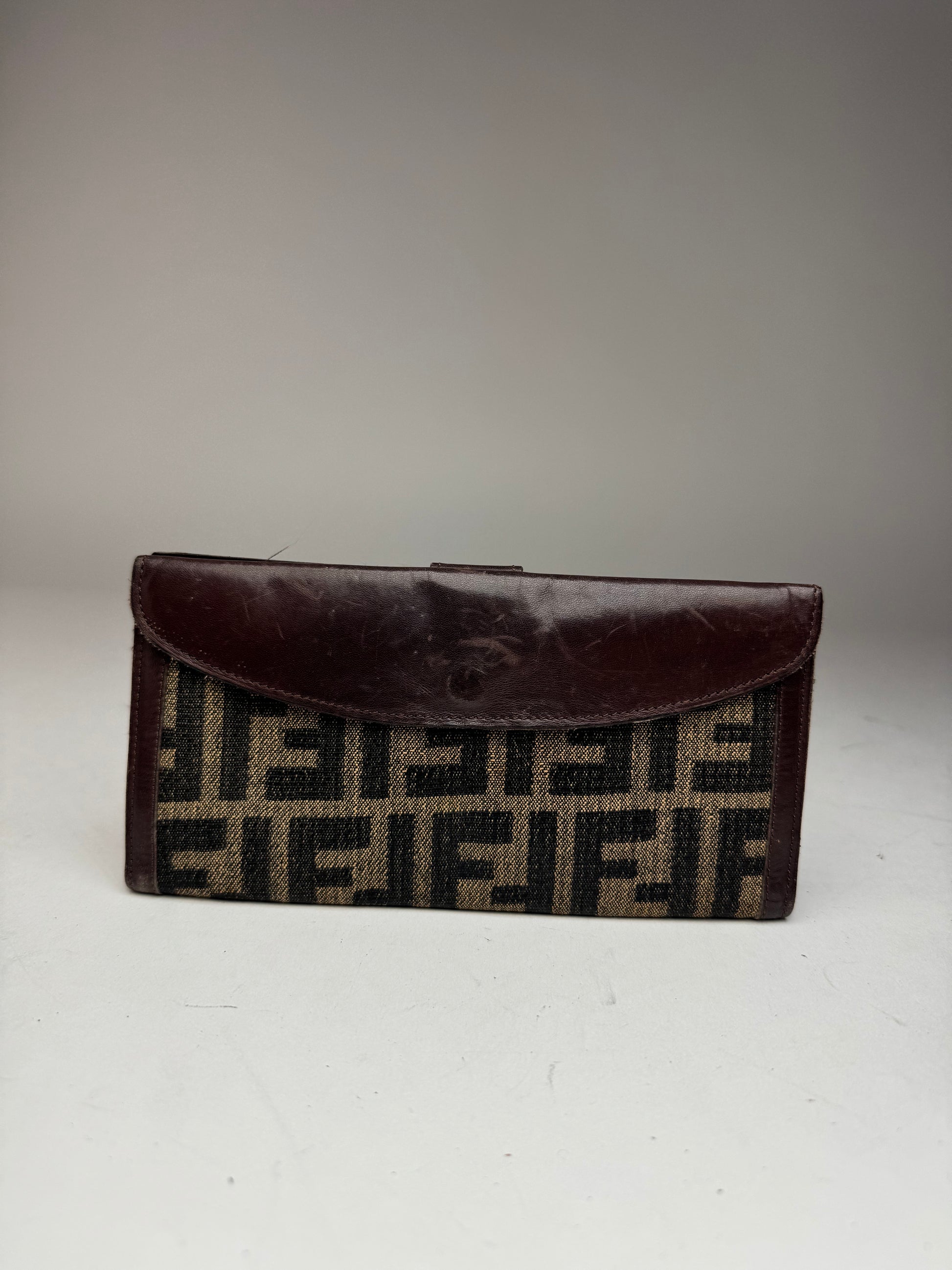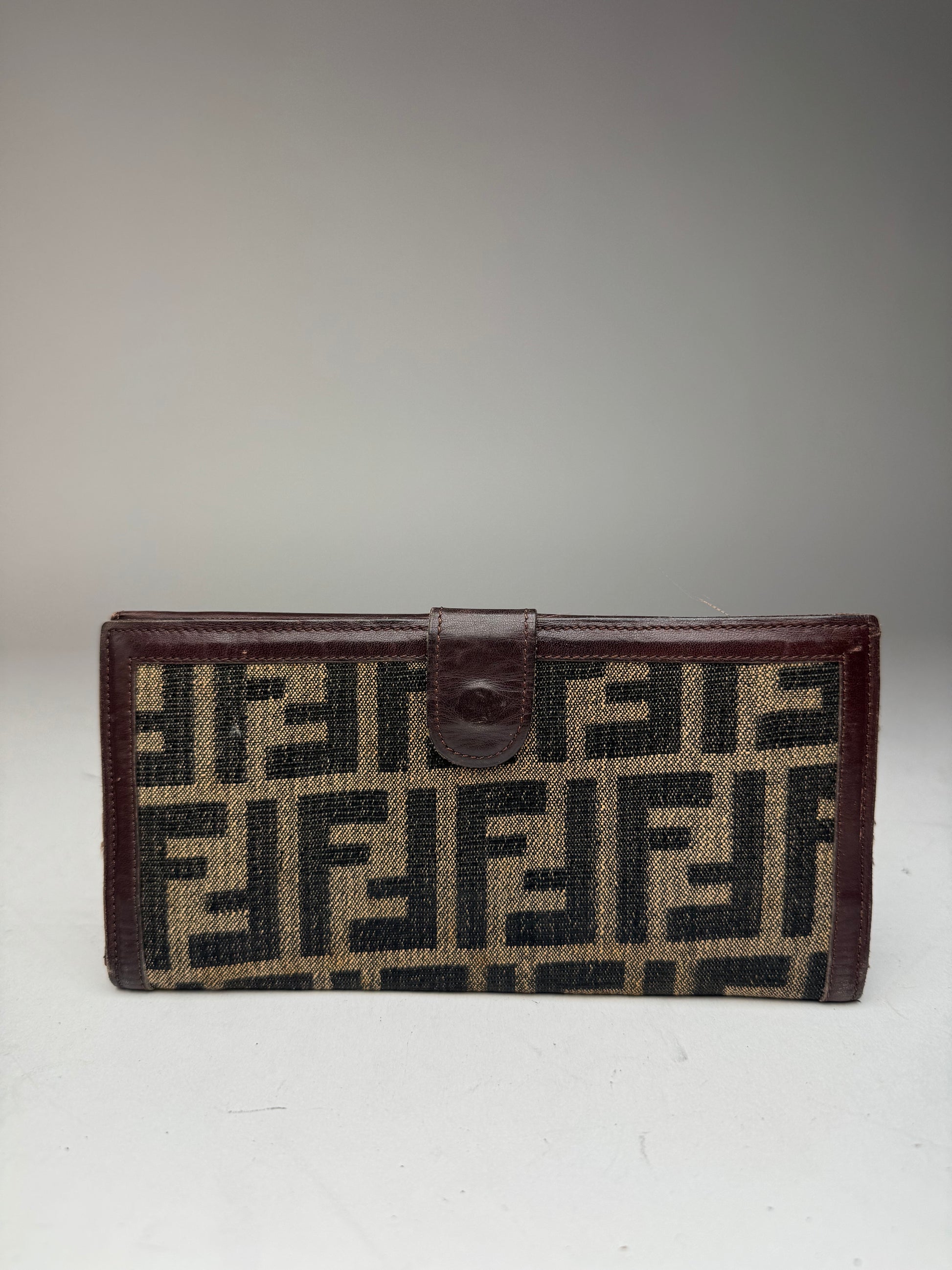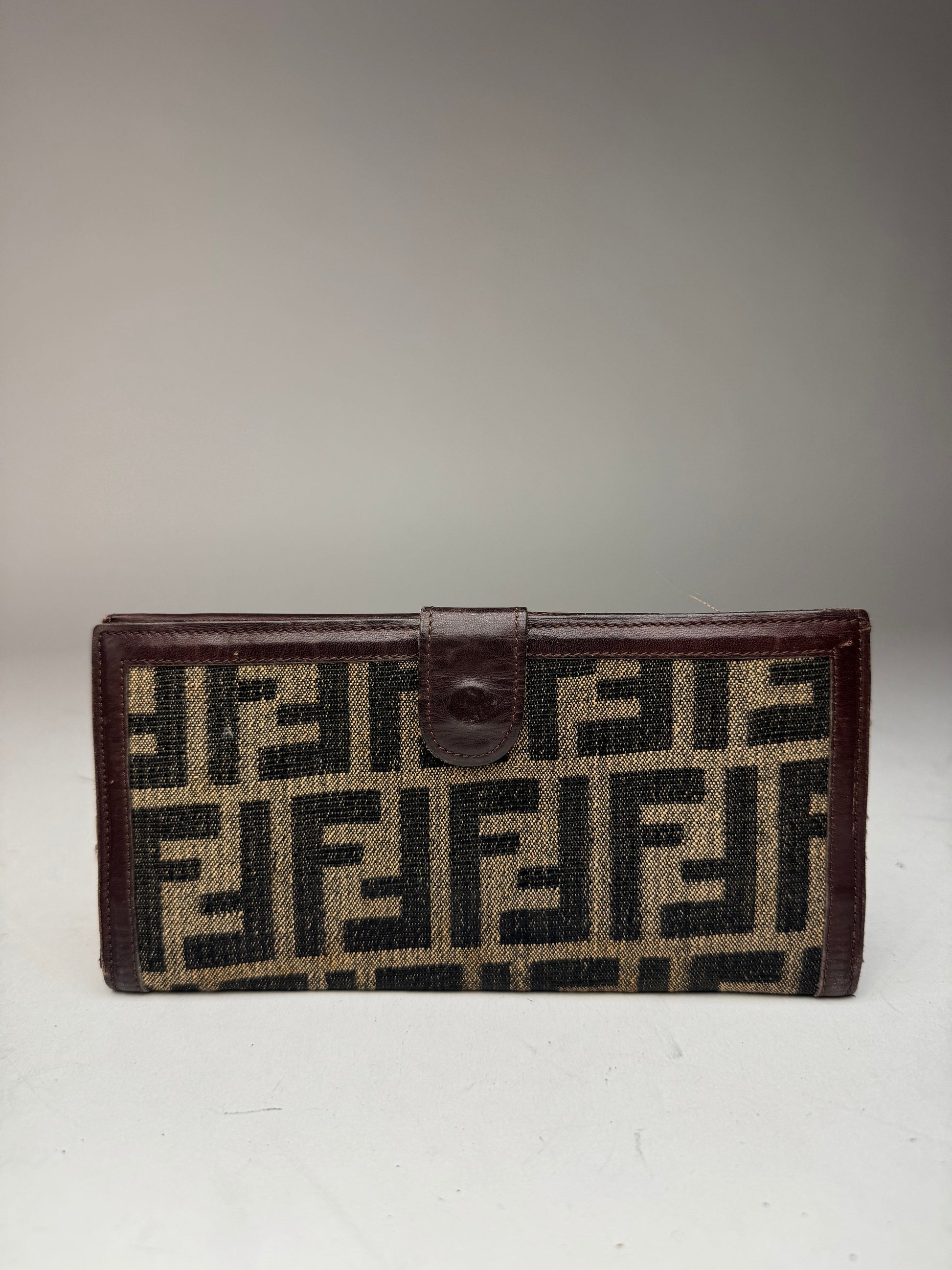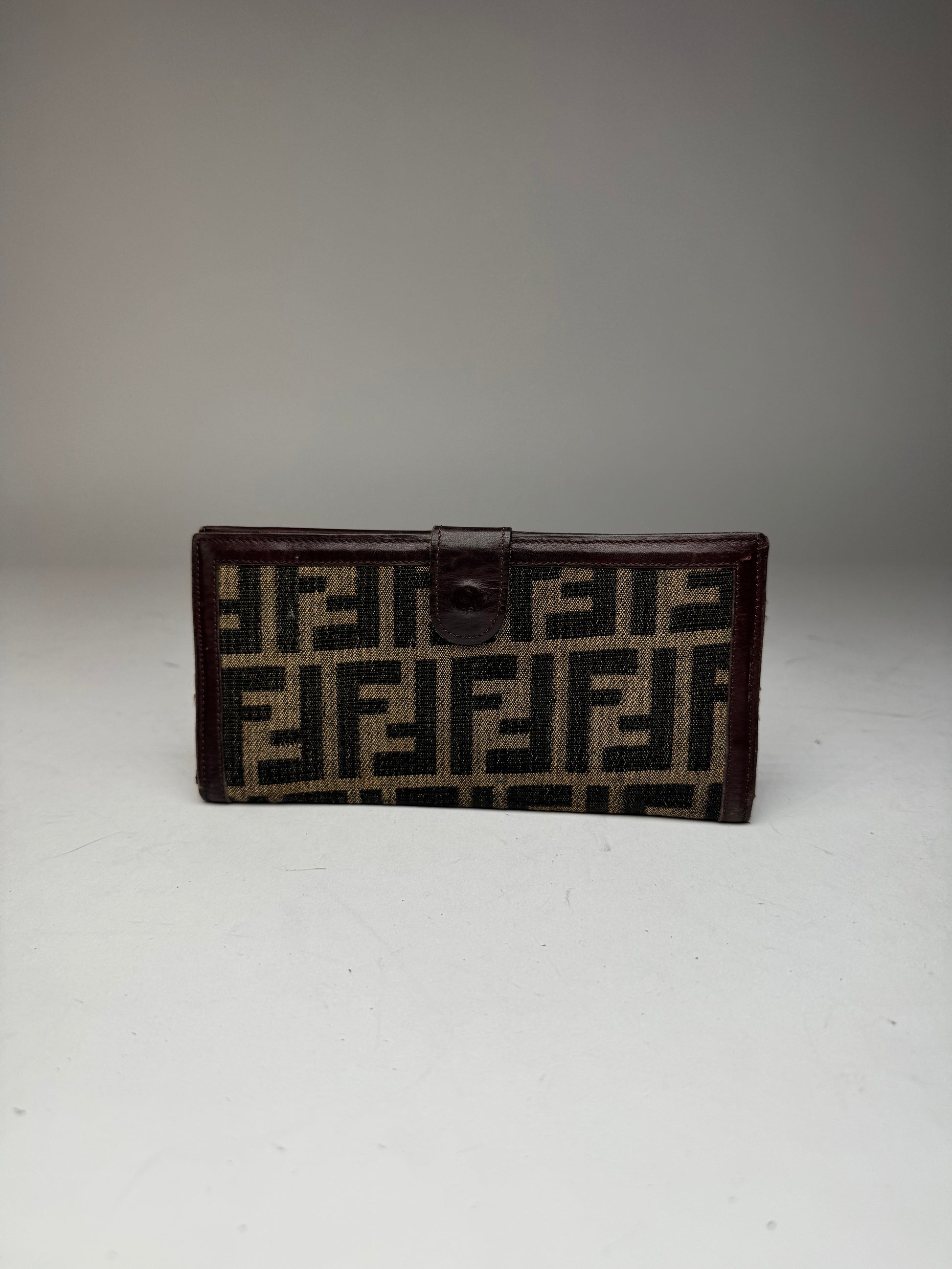 This vintage wallet is finely crafted of classic Fendi FF monogram canvas in shades of brown and dark brown, complemented by brown leather trim. Designed in 1965 by Karl Lagerfeld, the iconic FF motif — short for “Fun Fur” — has become one of the most recognizable symbols in luxury fashion. The wallet features a front flap with a snap button closure that opens to compartments for bills, ID, and cards, and a rear flap with a snap closure for coins.