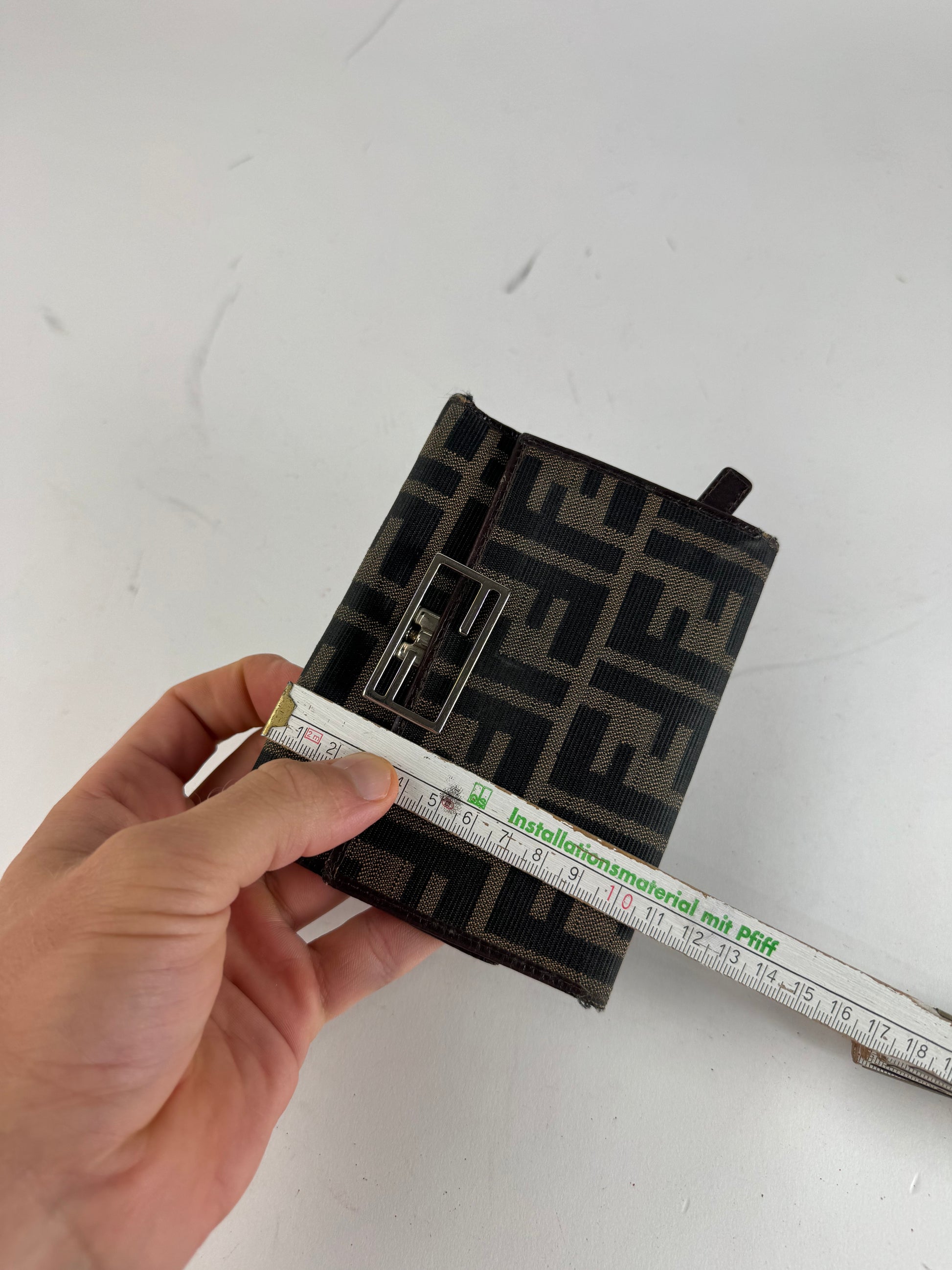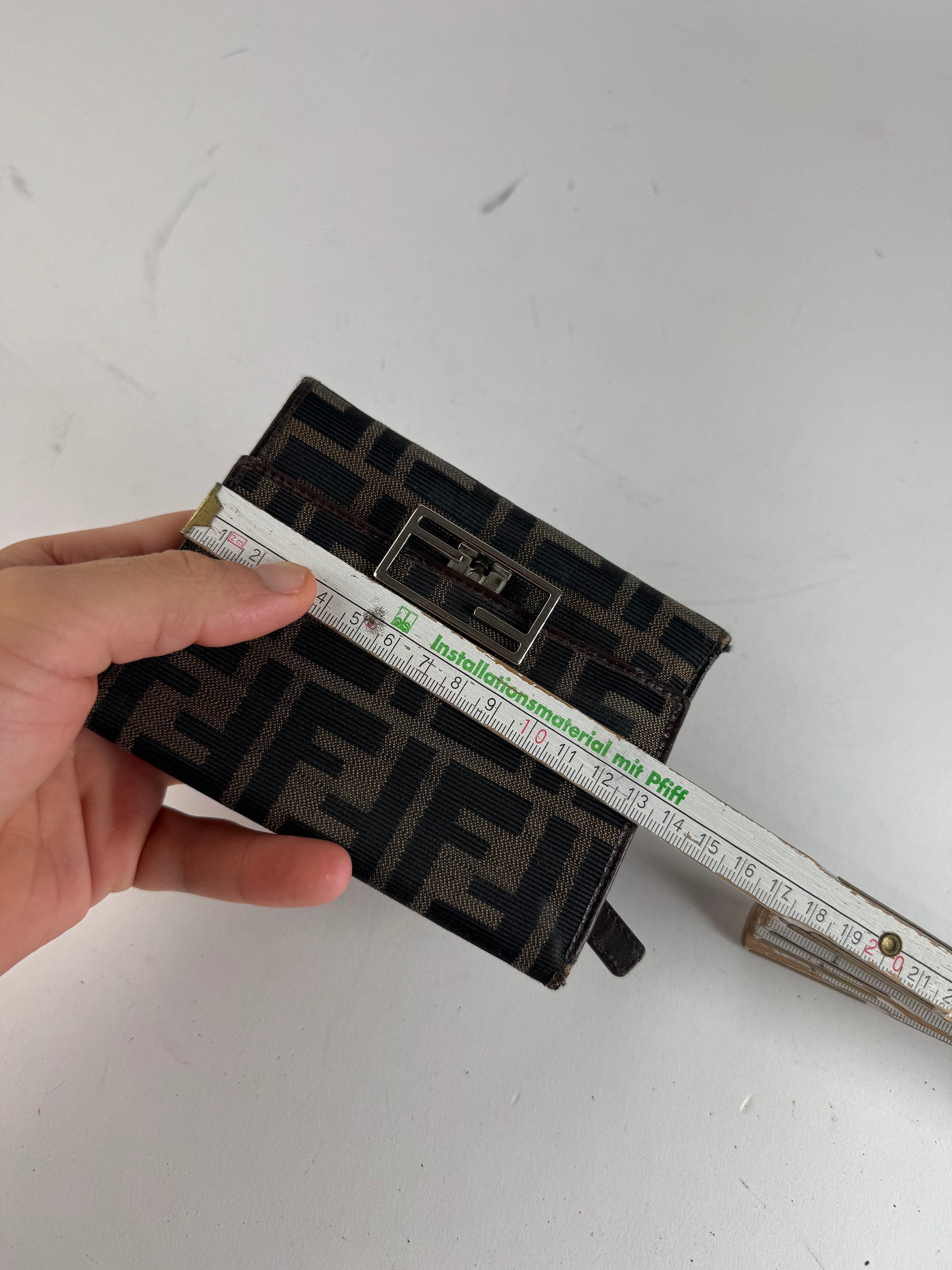 This vintage wallet is finely crafted of dark brown canvas with the black Fendi FF monogram. It features a silver-tone steel clasp in the shape of the iconic FF logo. The interior is lined with brown leather. Made in Italy, this piece reflects Fendi's timeless Roman design heritage.