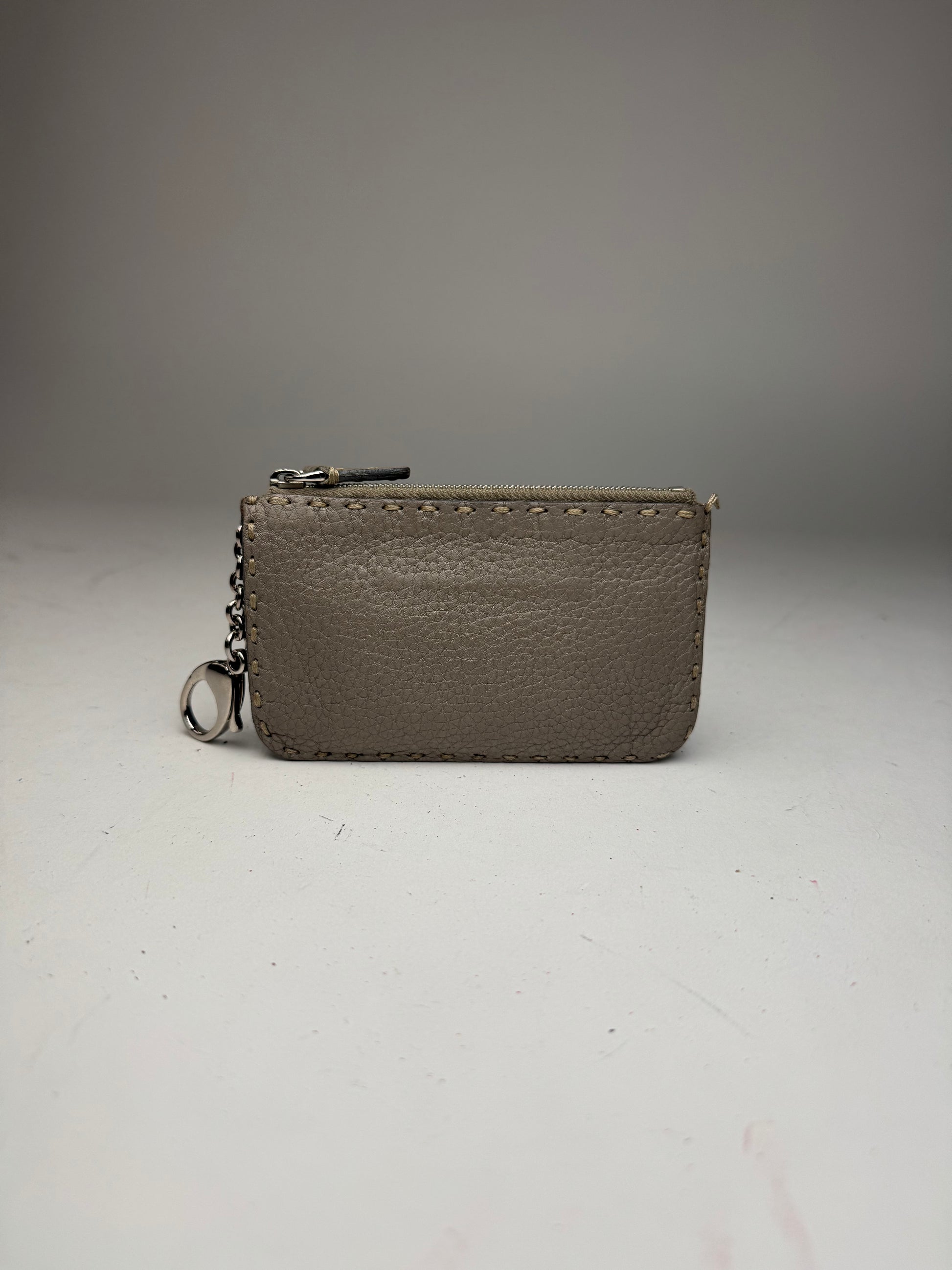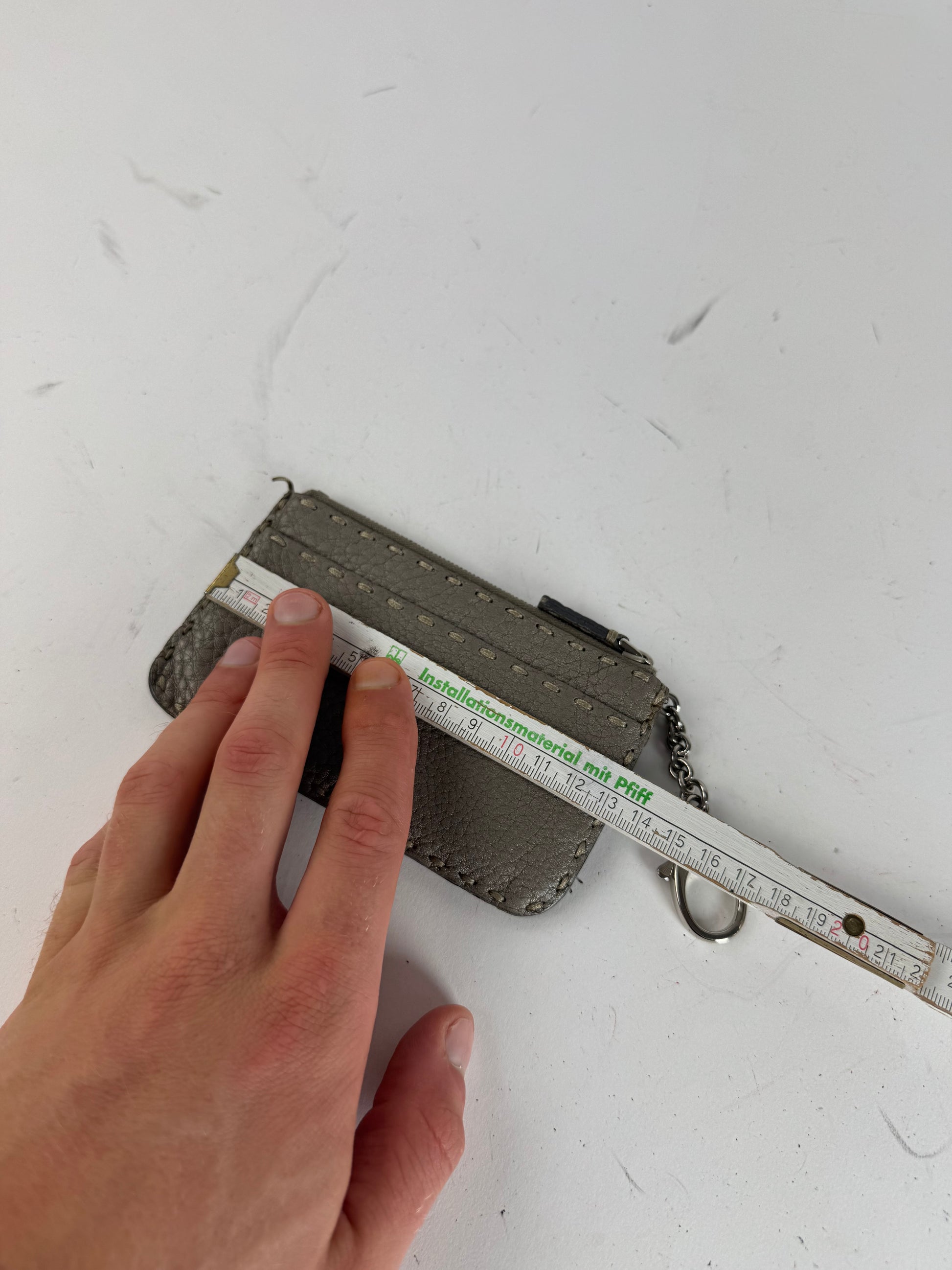 This elegant vintage card holder is finely crafted of silver leather with white stitching, reflecting the artisanal craftsmanship of FENDI’s renowned Selleria line — a collection originally inspired by the brand’s Roman saddle-making heritage and celebrated for its hand-stitched details and refined materials. Attached to the side is a silver-tone steel chain with a key ring and carabiner hook, designed for both practicality and style. The card holder also features a beige-brown canvas strap, completing its sophisticated yet functional look.