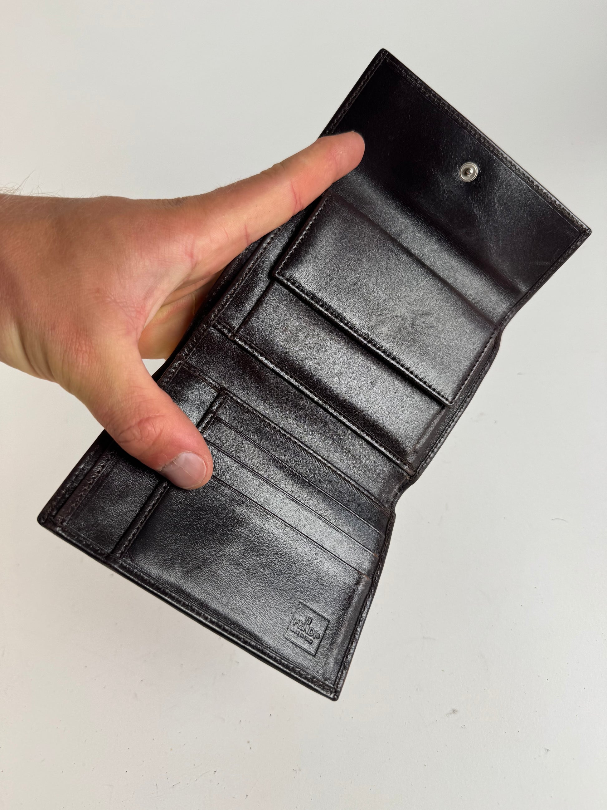 FENDI Vintage FF Monogram Wallet. This classic wallet is crafted of dark brown leather with all-over FF monogram canvas. The iconic “Zucca” FF logo was designed in 1965 by Karl Lagerfeld and has since become a symbol of Fendi's bold and instantly recognizable aesthetic. The piece features a snap button closure. The interior is lined in brown canvas with dark brown leather detailing. Made in Italy.