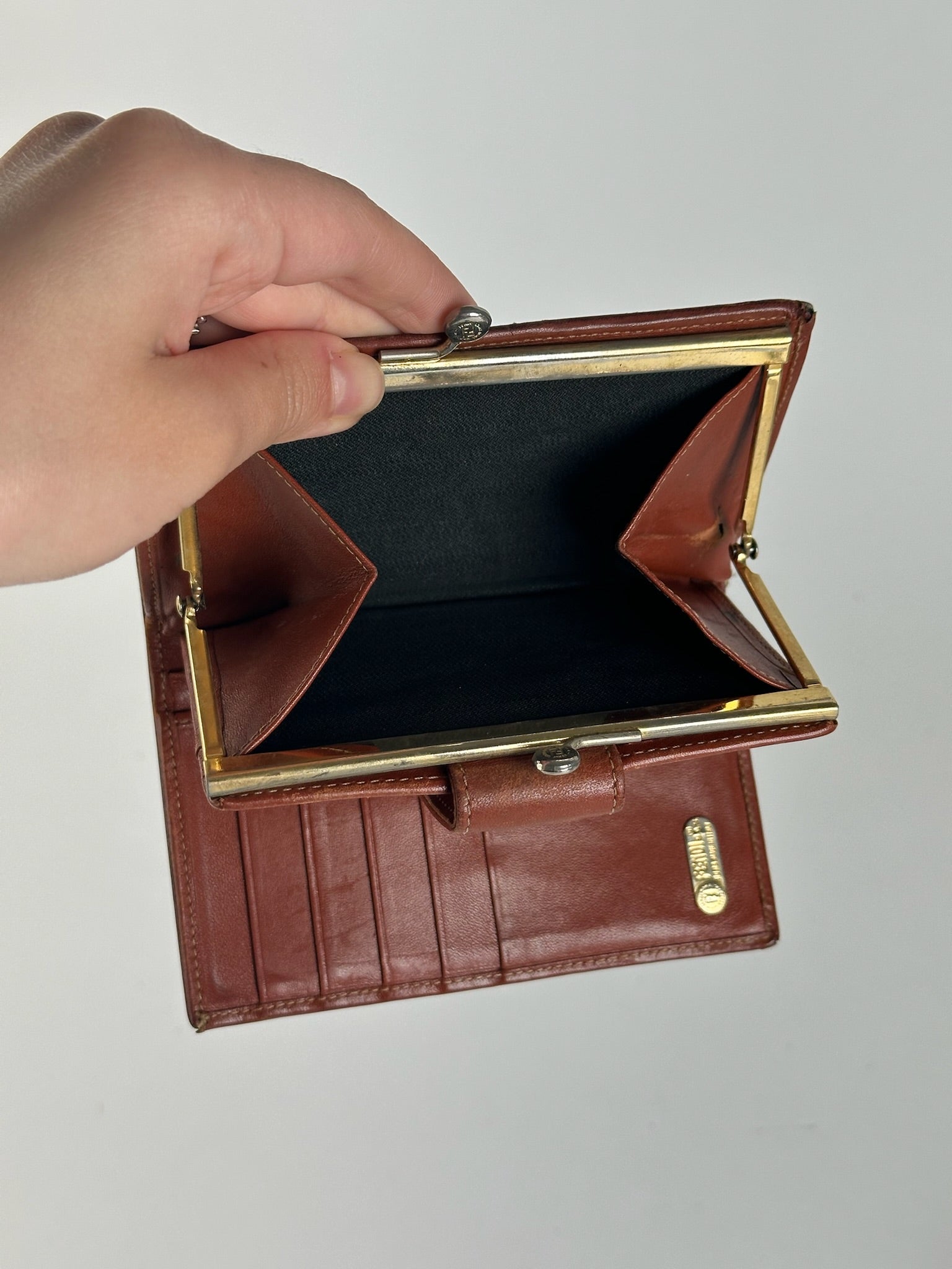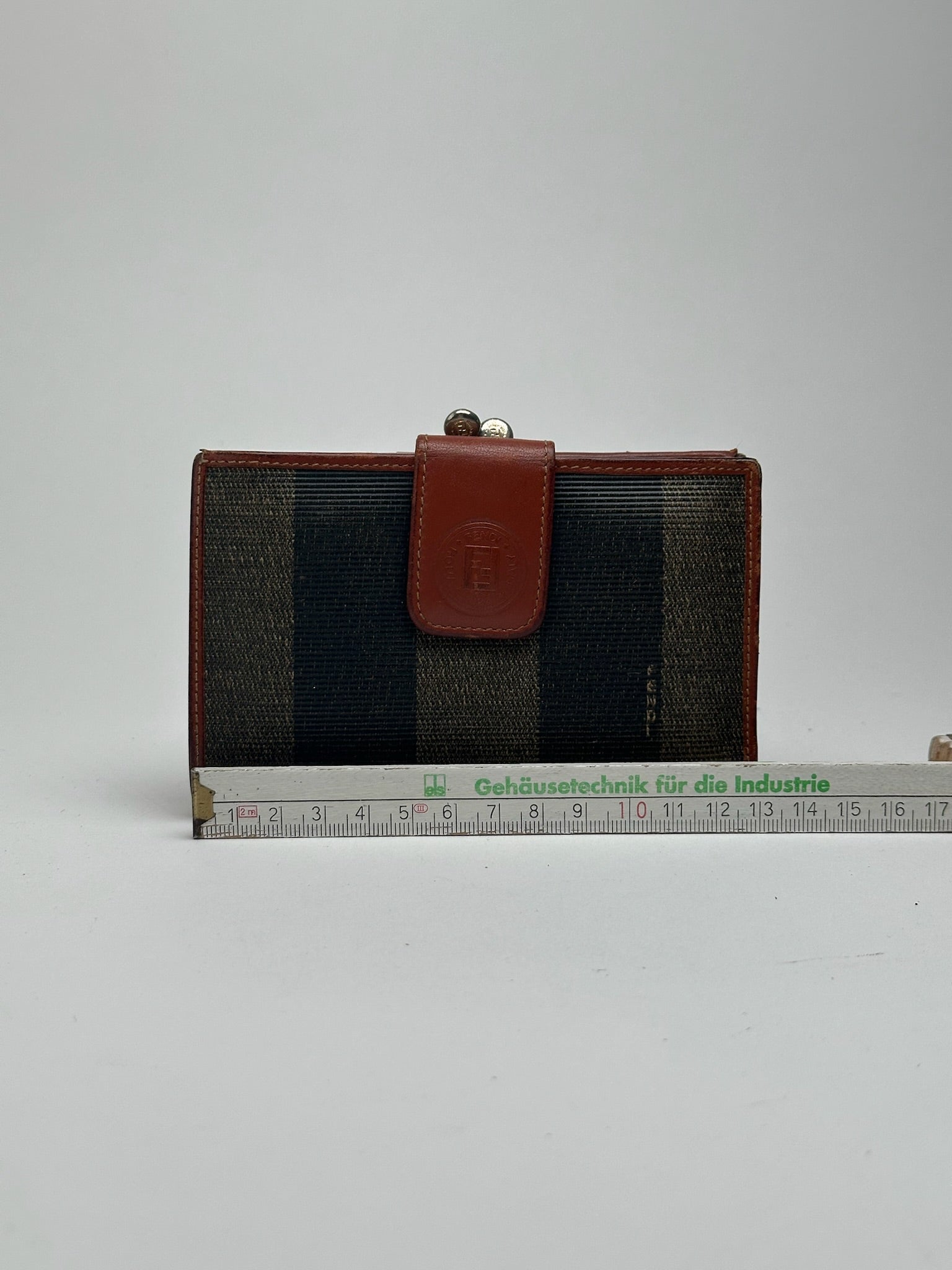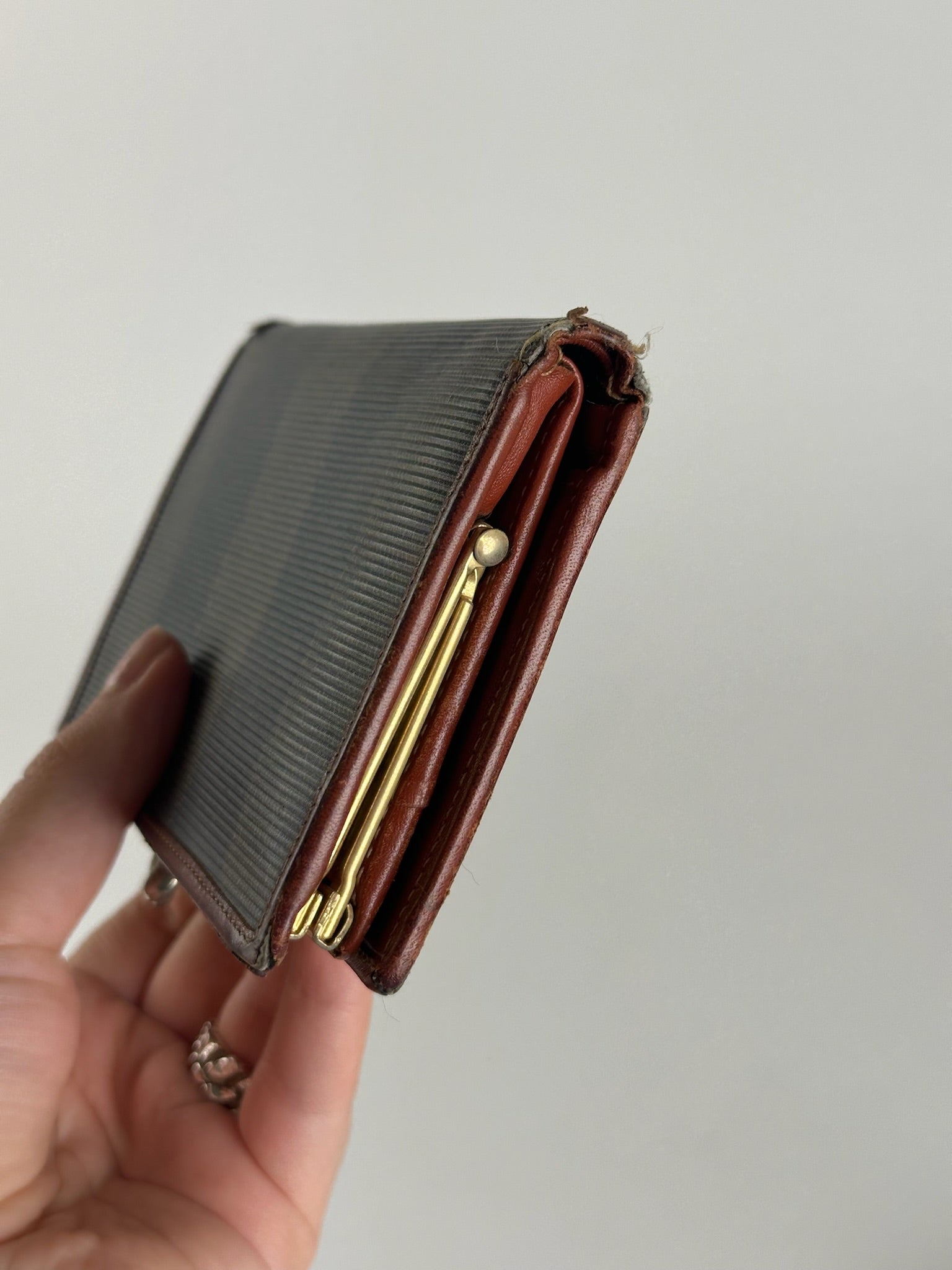 FENDI vintage wallet. This distinctive wallet is finely crafted of brown striped leather with red-brown leather accents. The front features an embossed FF logo, originally created by Karl Lagerfeld in 1965 as a bold representation of Fendi's commitment to innovation and luxury. The wallet includes both a flap closure for coins and a snap button closure for bills and cards.