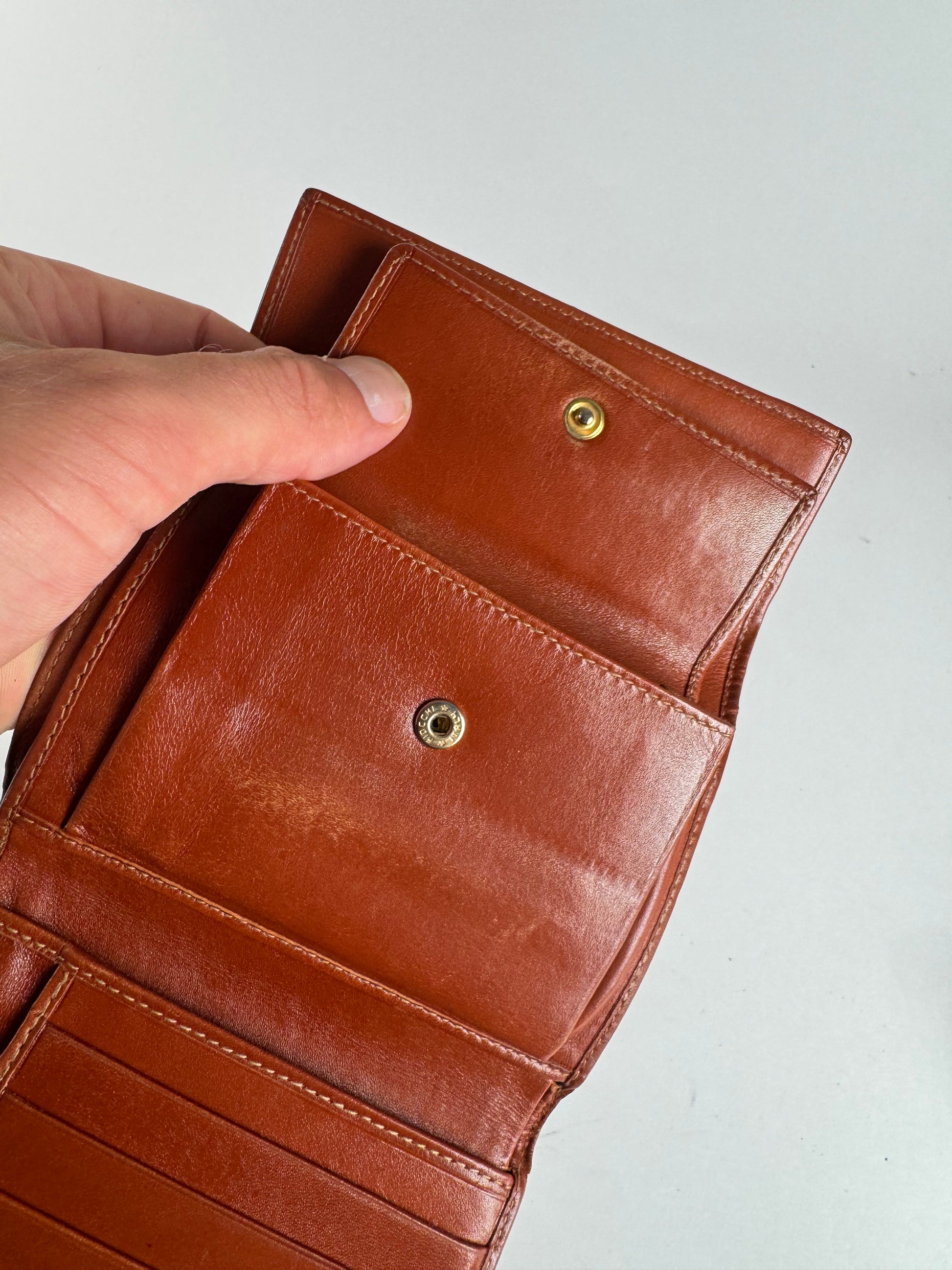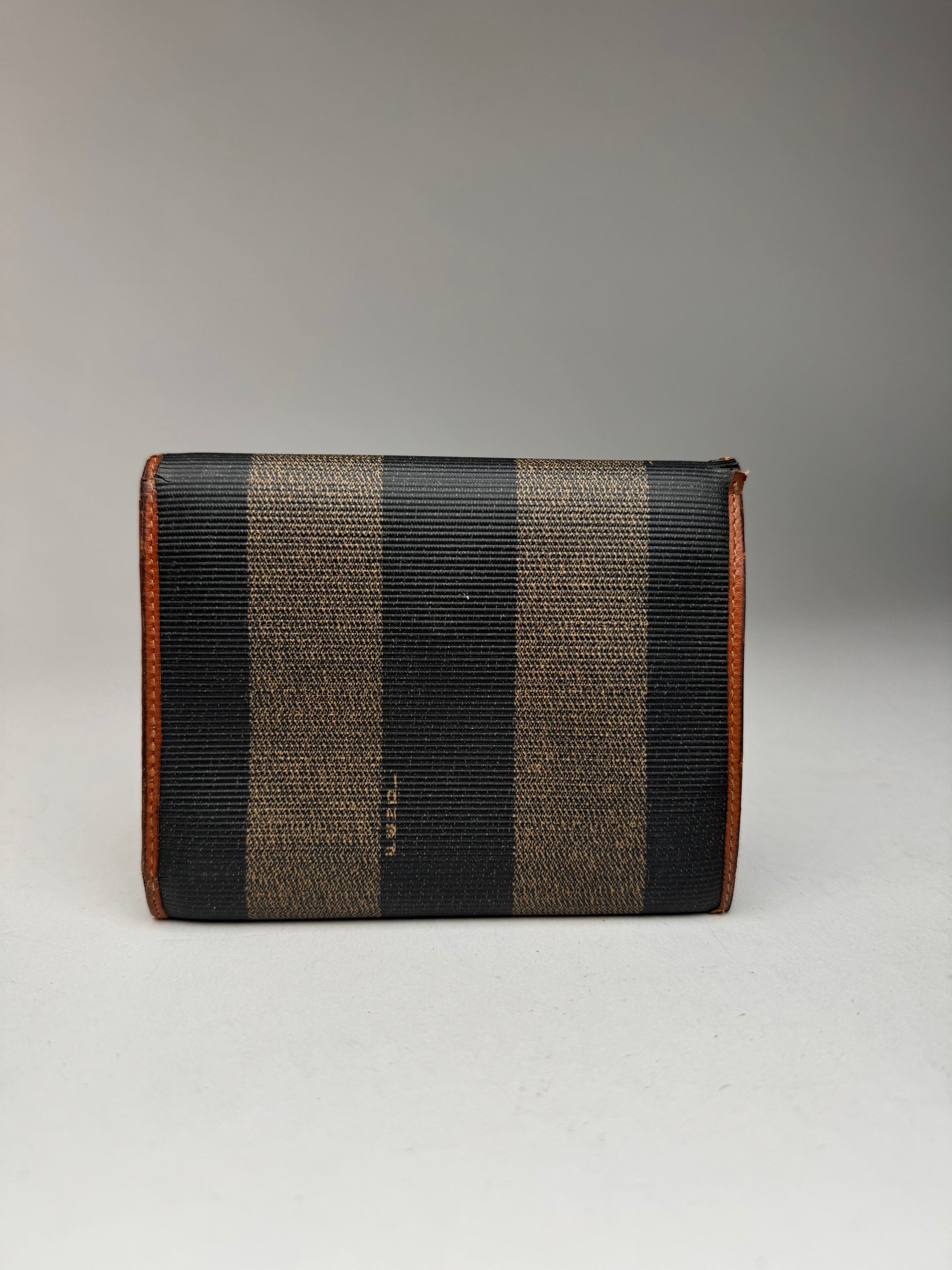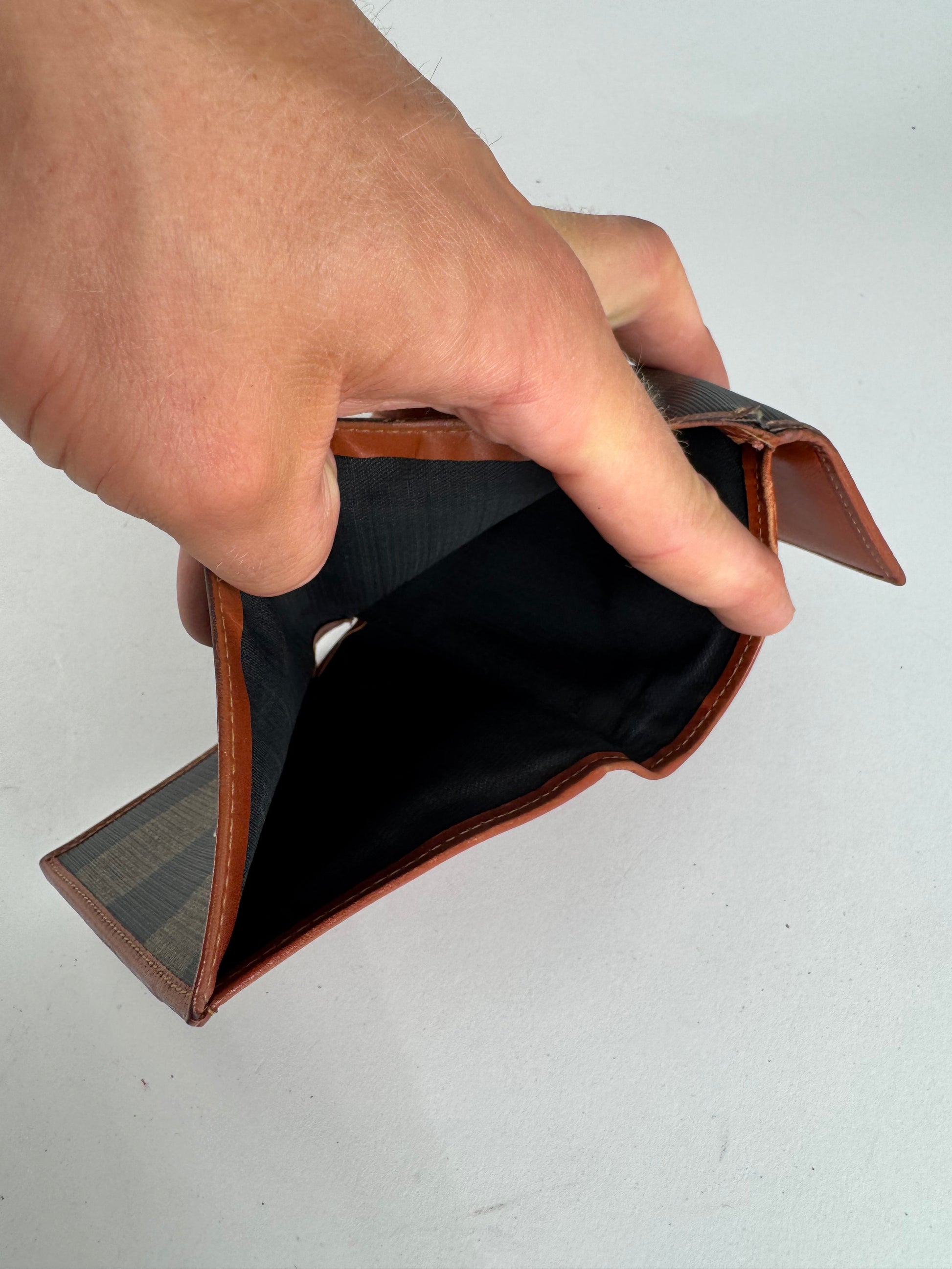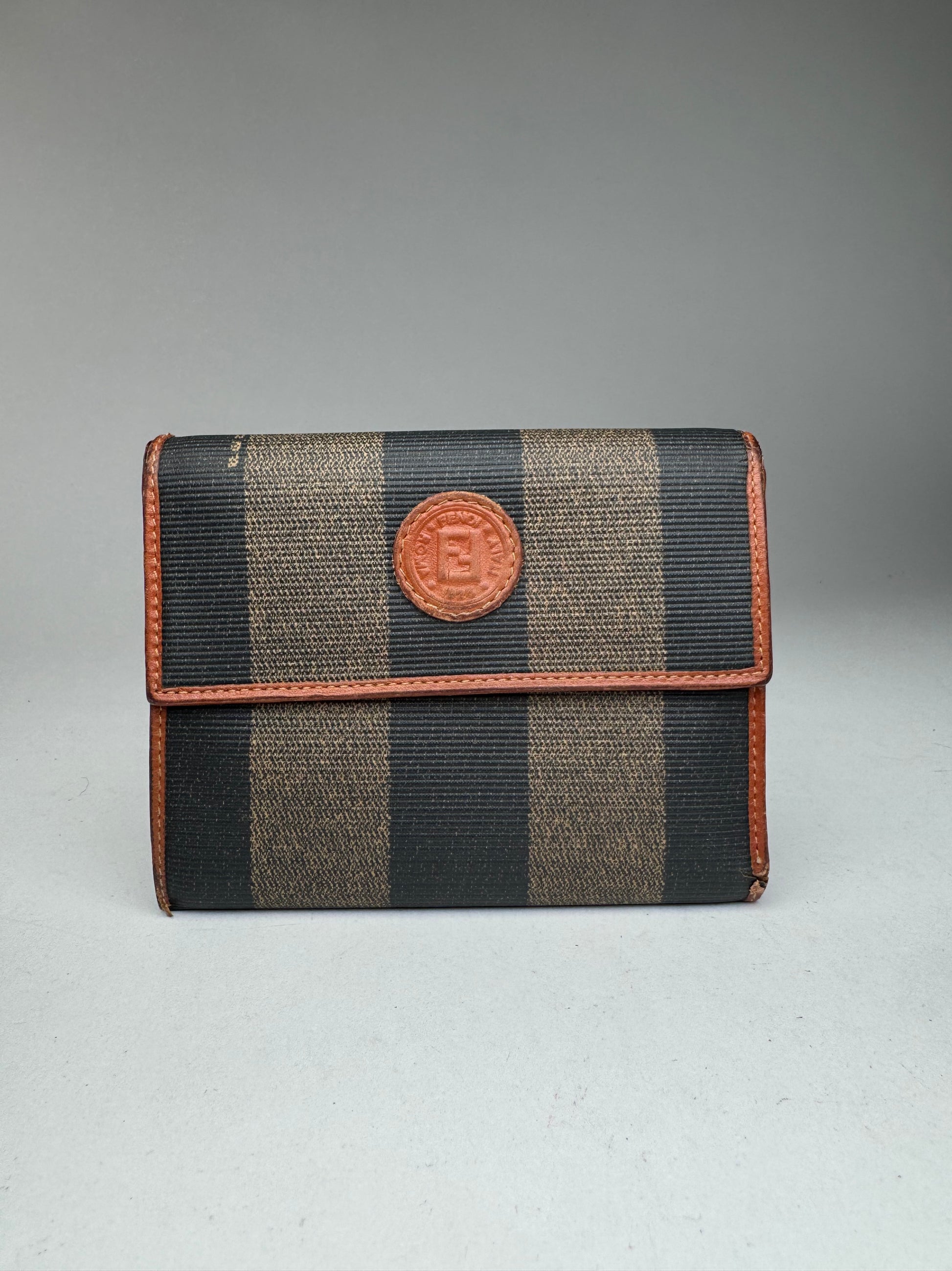 This vintage wallet is crafted in Fendi's signature horizontal striped canvas in light and dark brown tones. The front features the iconic FF logo patch in reddish-brown leather, which is also used on the interior. The piece opens to reveal a reddish-brown leather interior with black canvas lining.