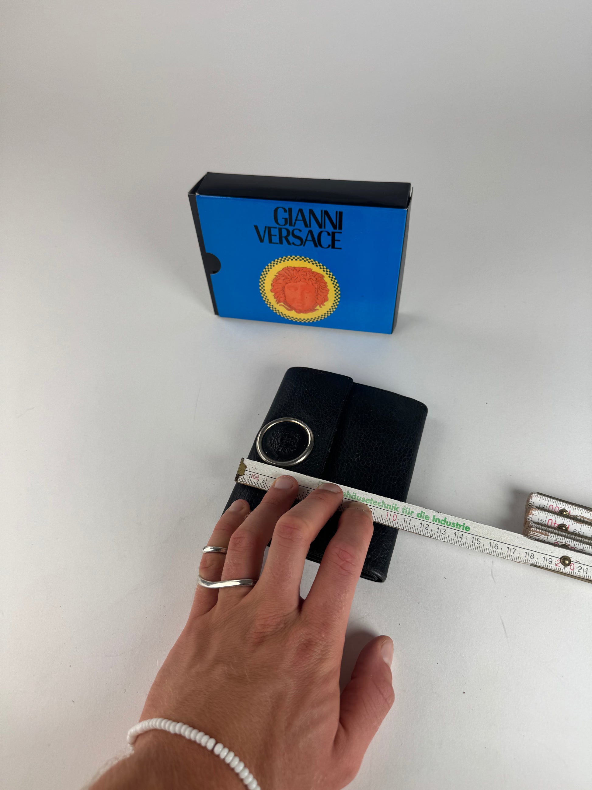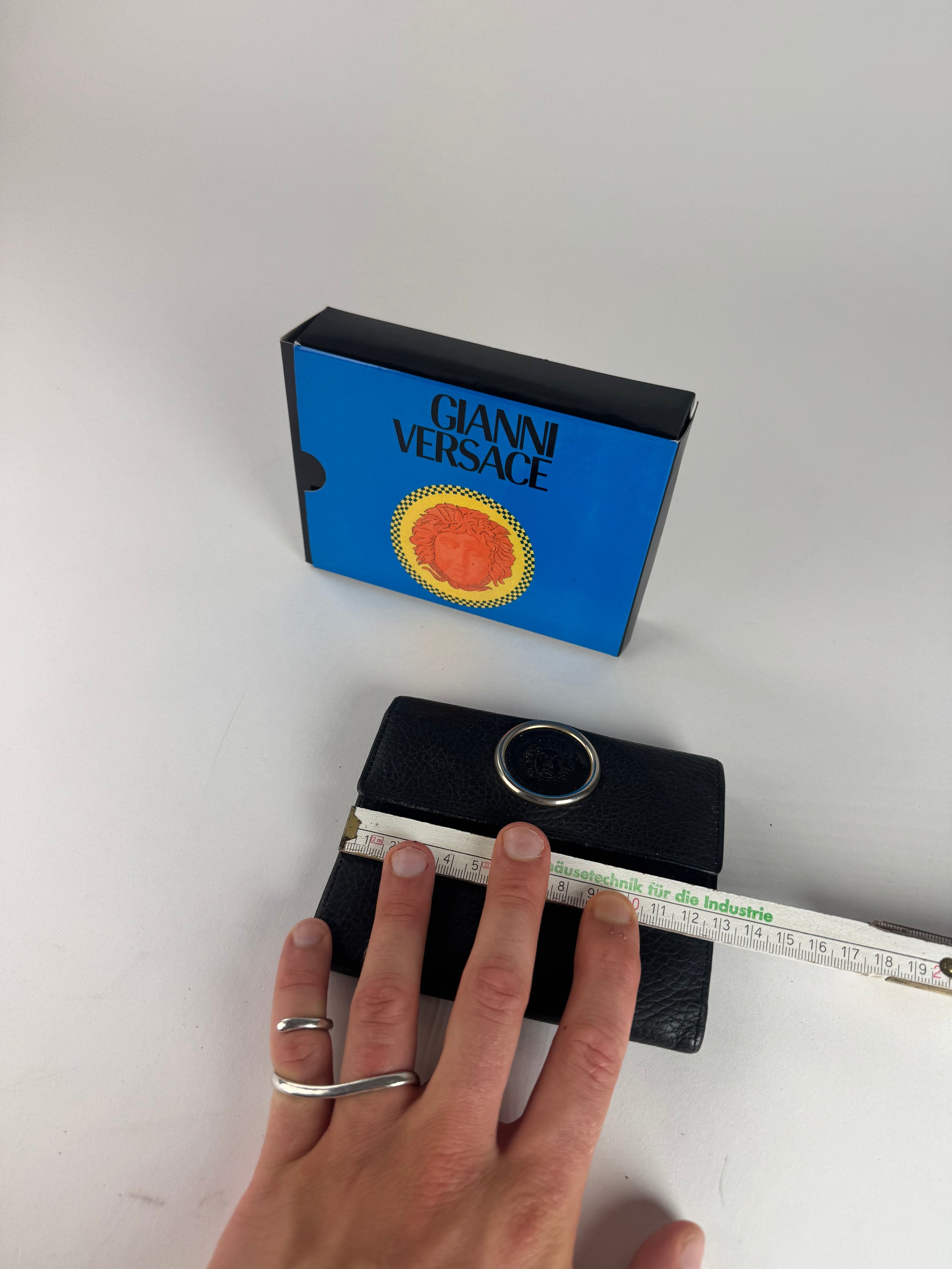 GIANNI VERSACE Black Snake-Embossed Leather Medusa Wallet. This vintage wallet is crafted from black snake-embossed leather and features the iconic Versace Medusa emblem set in a silver-tone metal circle on the front. The Medusa logo, inspired by Greek mythology, was chosen by Gianni Versace for its power to mesmerize—symbolizing allure, strength, and timeless boldness.