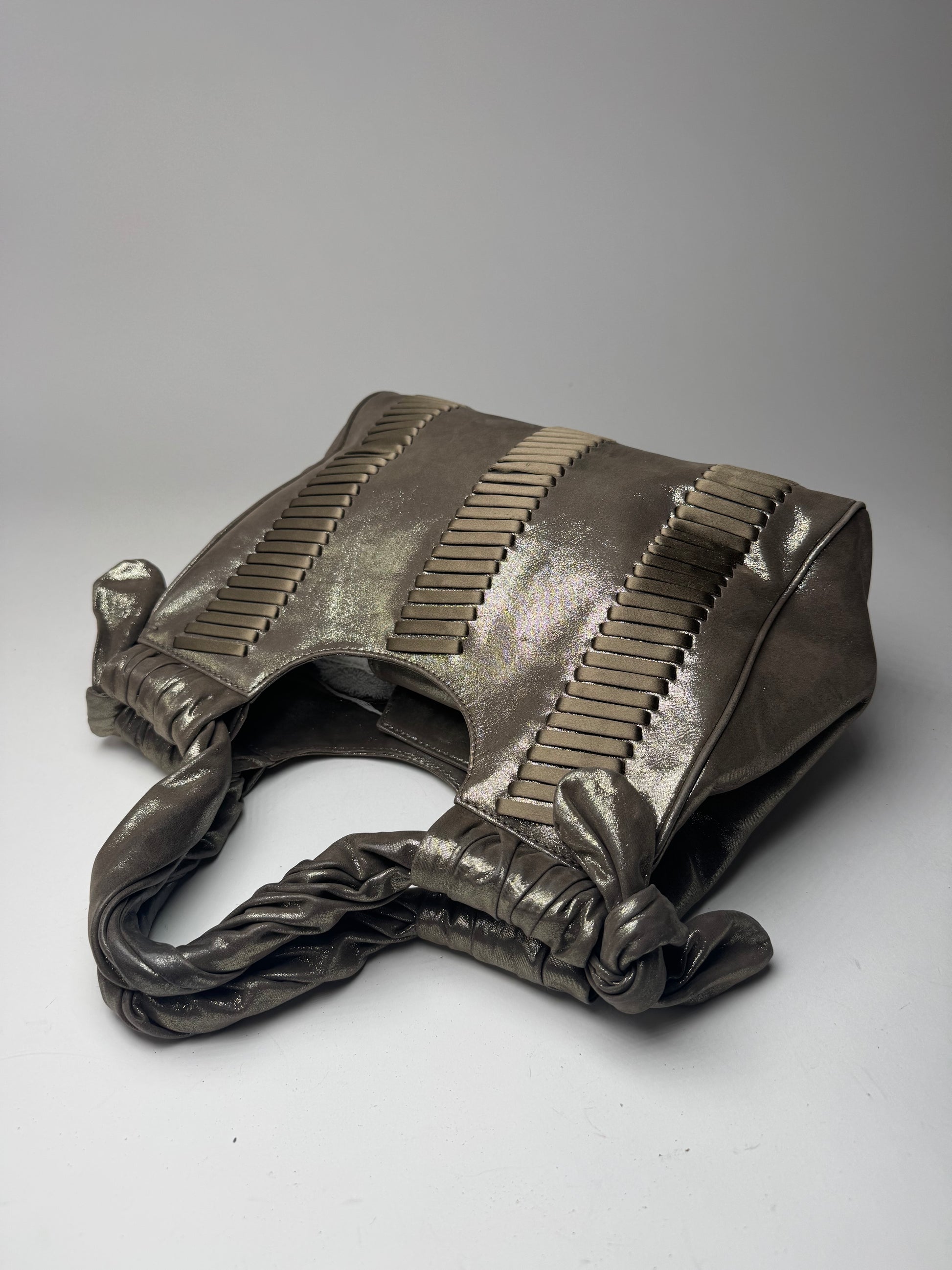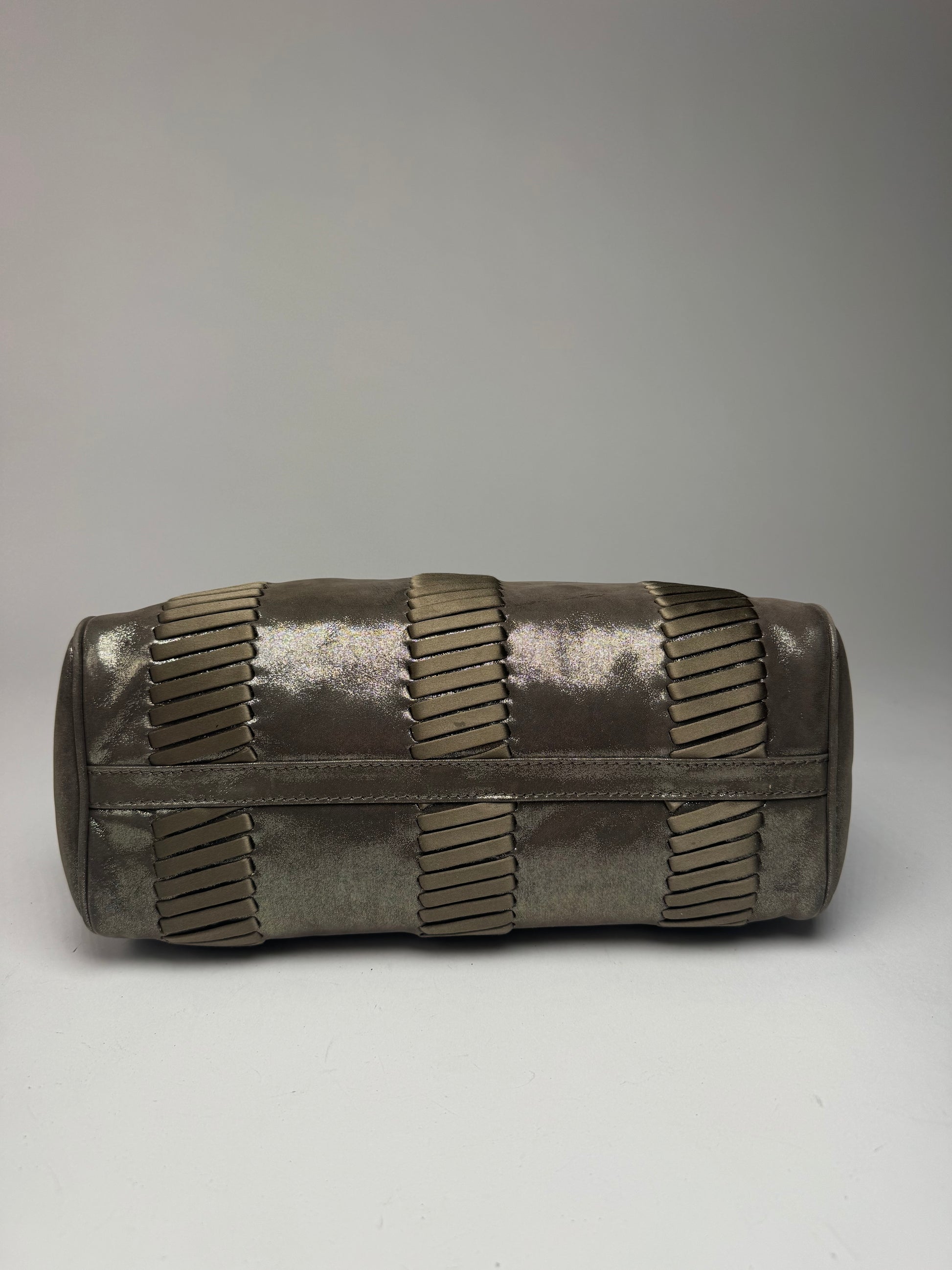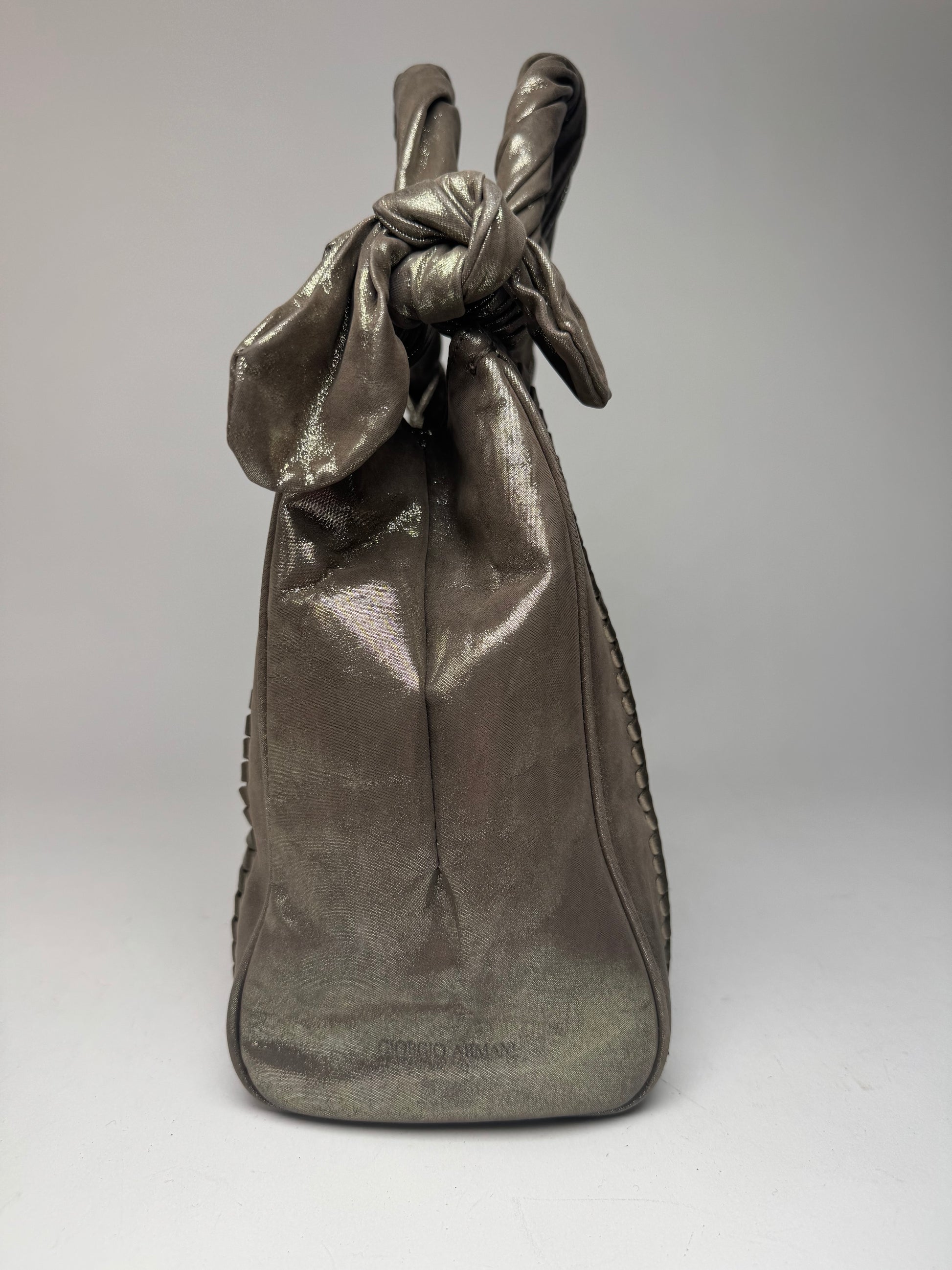 GIORGIO ARMANI vintage handbag. This vintage Giorgio Armani handbag is crafted from silver and bronze-toned metallic leather , offering a bold and elegant statement look. The interior is lined with beige leather , and the bag features a magnetic closure for convenience. Made in Italy , it remains in very good condition .