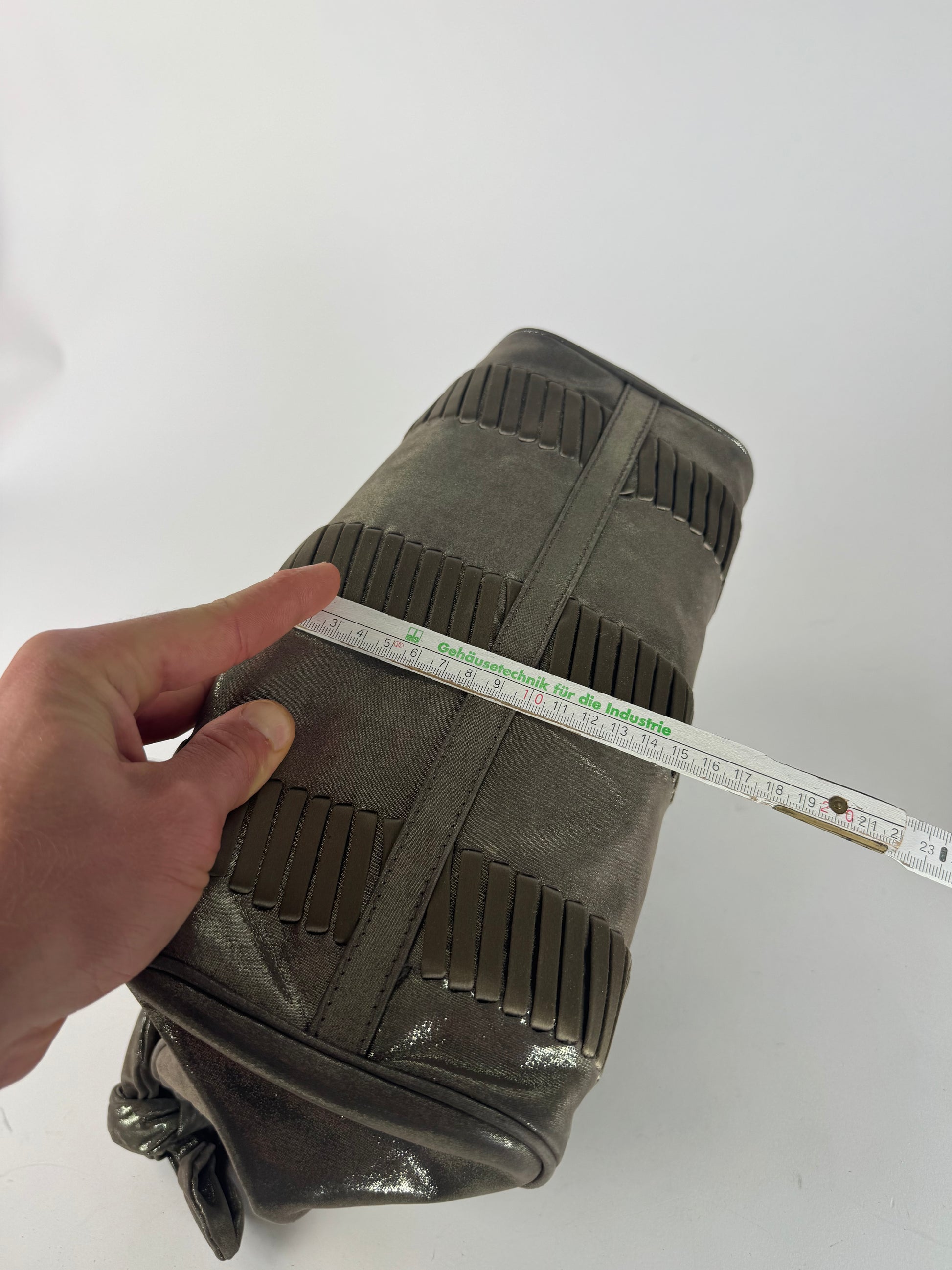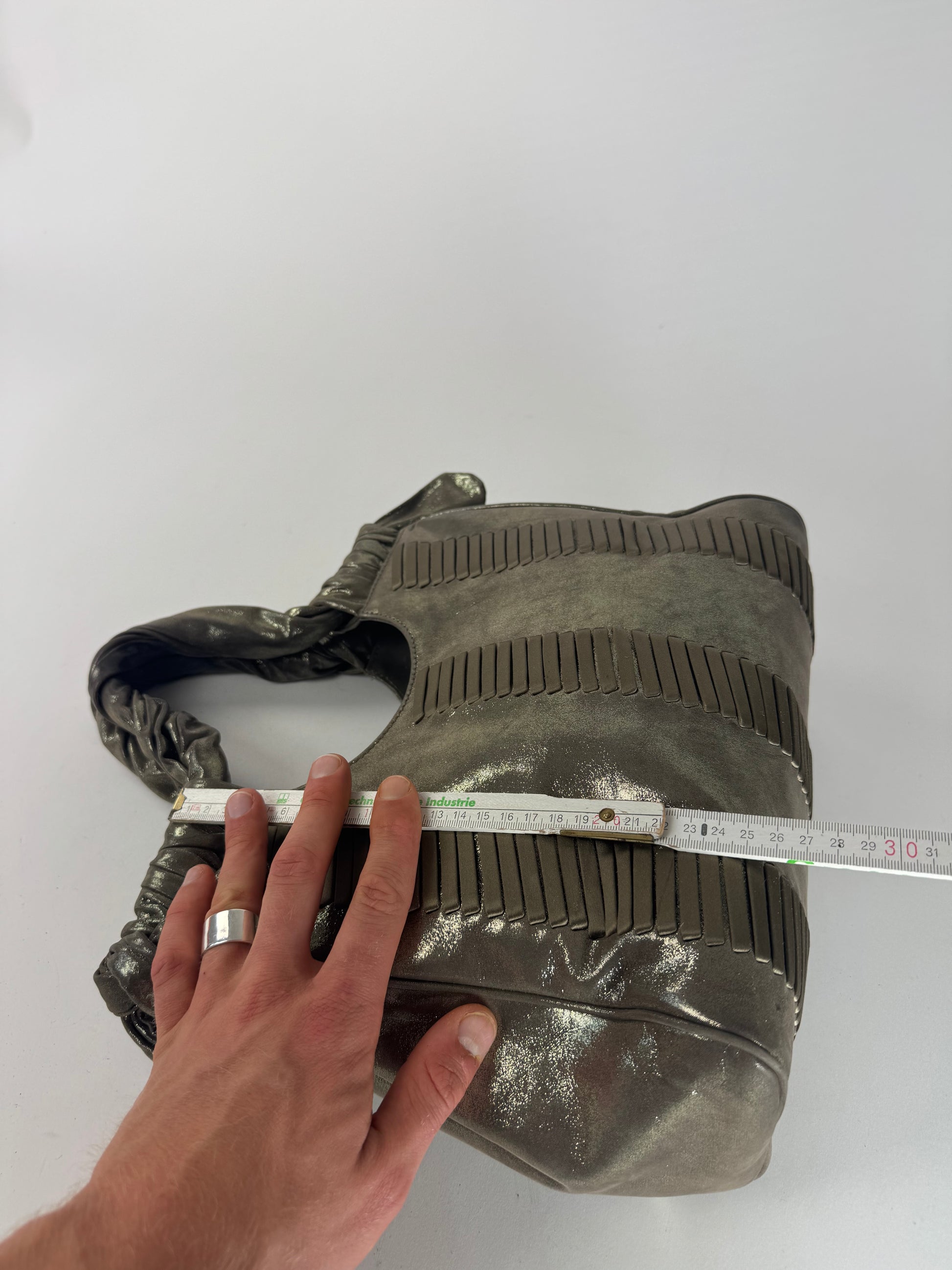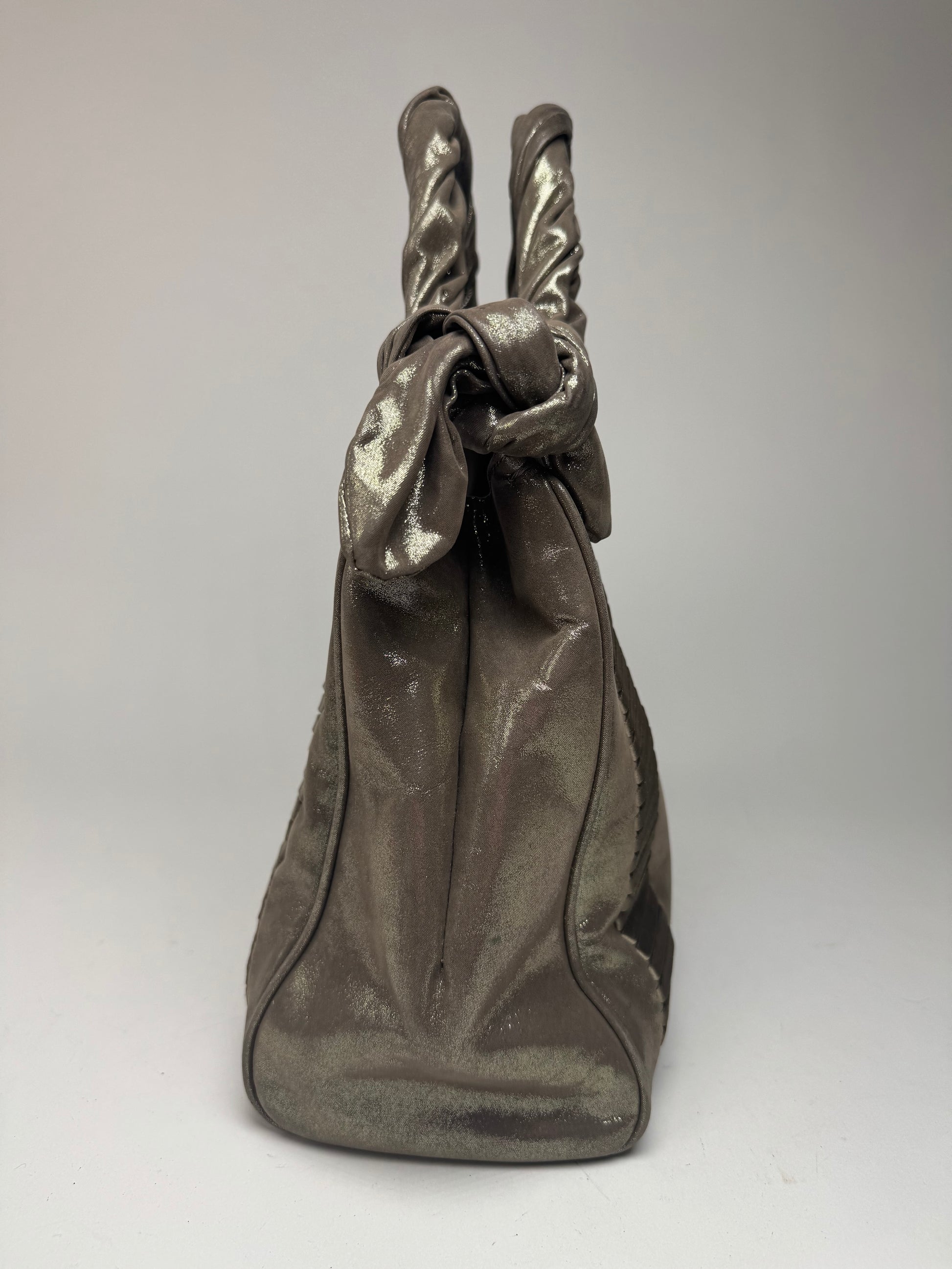 GIORGIO ARMANI vintage handbag. This vintage Giorgio Armani handbag is crafted from silver and bronze-toned metallic leather , offering a bold and elegant statement look. The interior is lined with beige leather , and the bag features a magnetic closure for convenience. Made in Italy , it remains in very good condition .