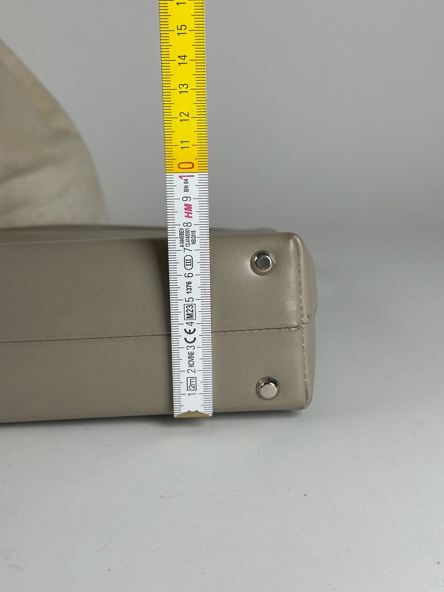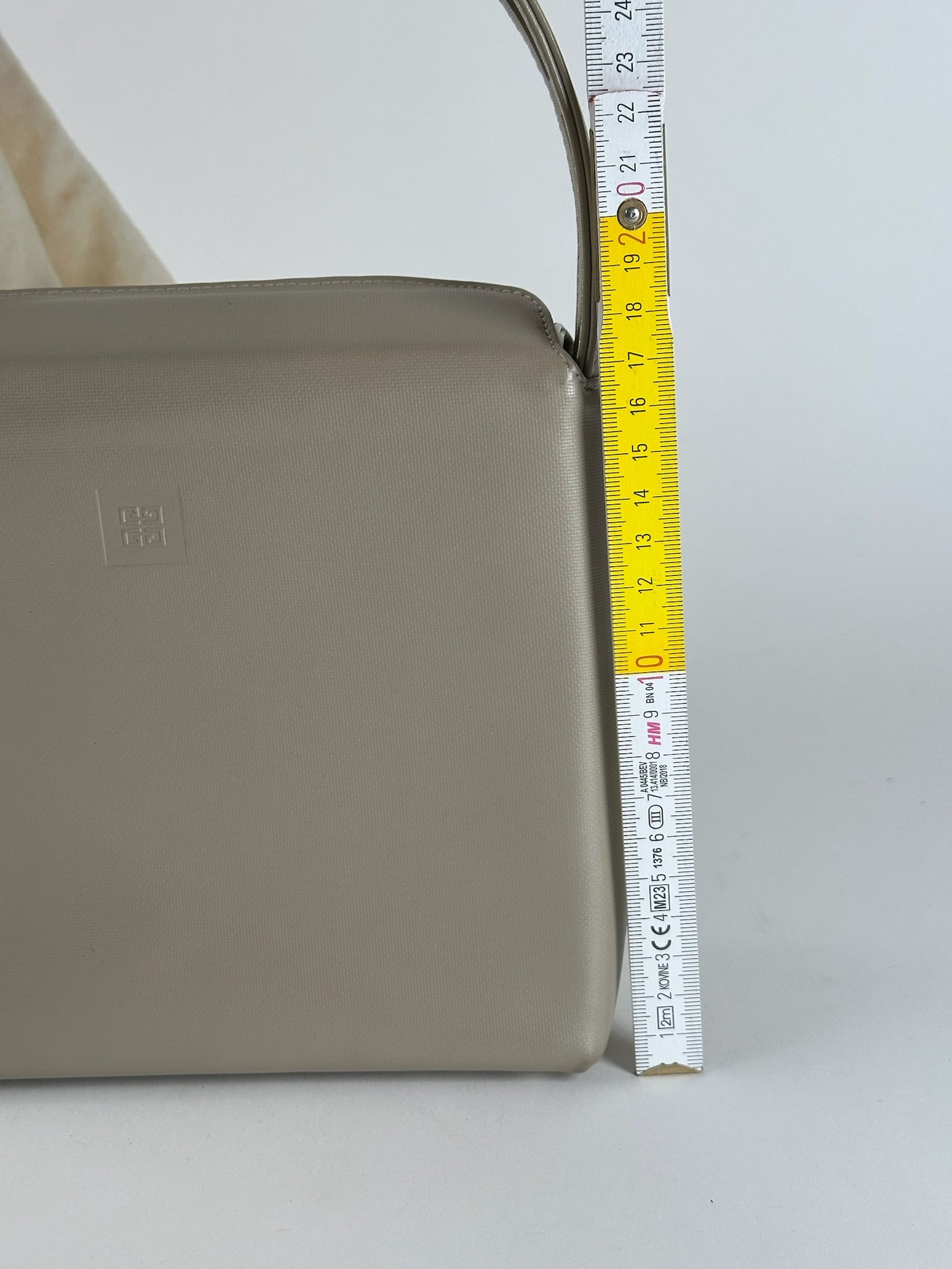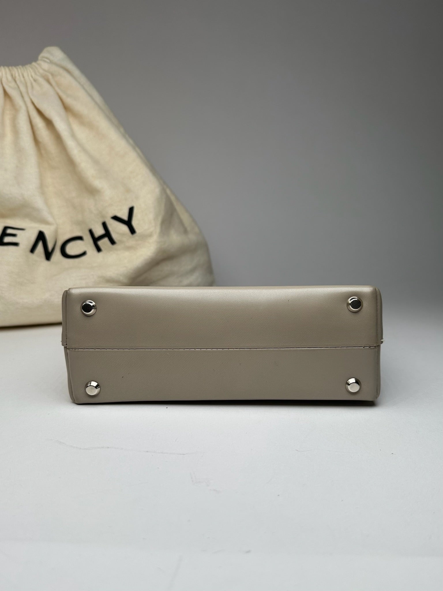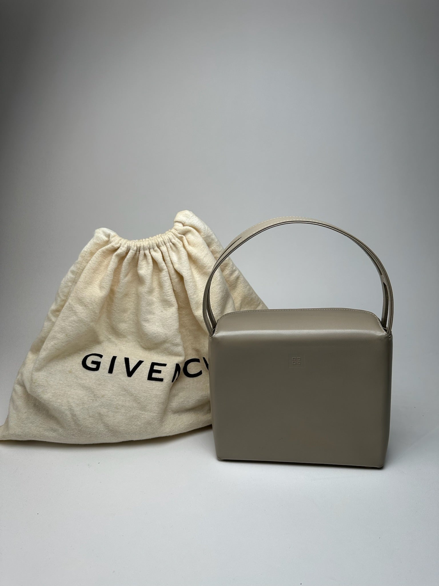 GIVENCHY Gray Patent Leather 4G Vintage Bag. This chic handbag is finely crafted of gray patent leather and features a single top handle, a front flap with magnetic closure, and silver-tone steel hardware. The flap opens to a compact interior lined in gray coated vegan leather.