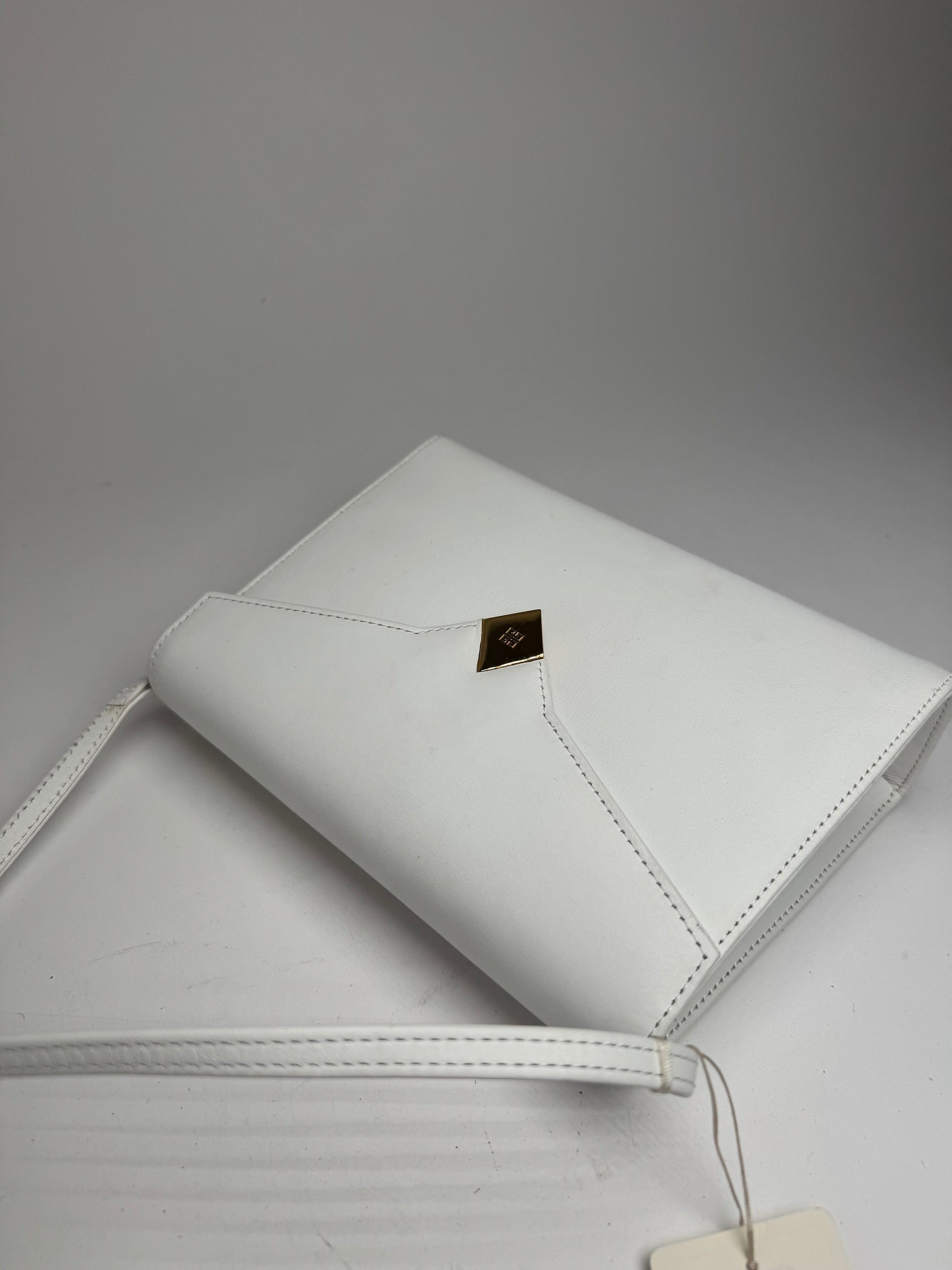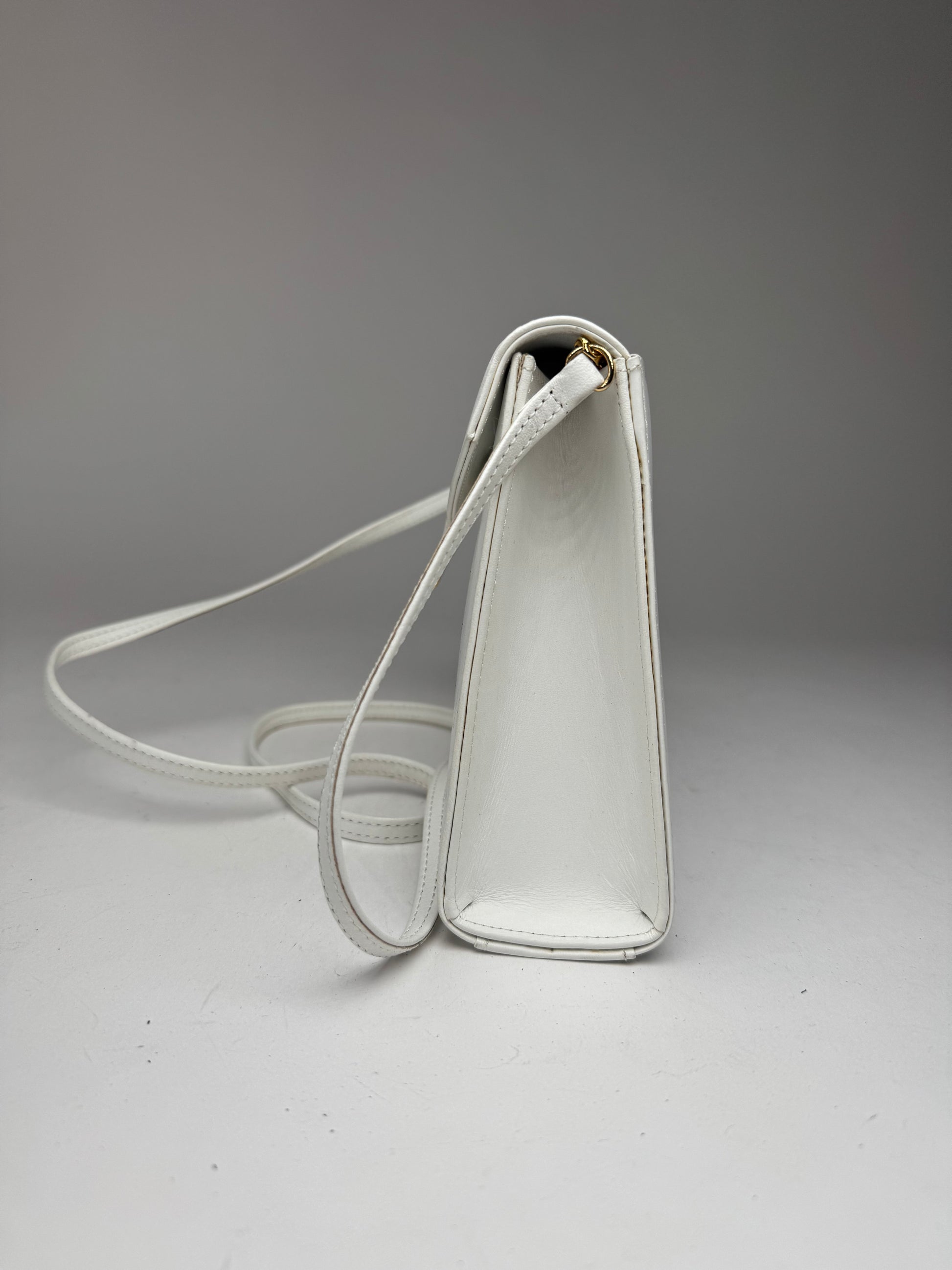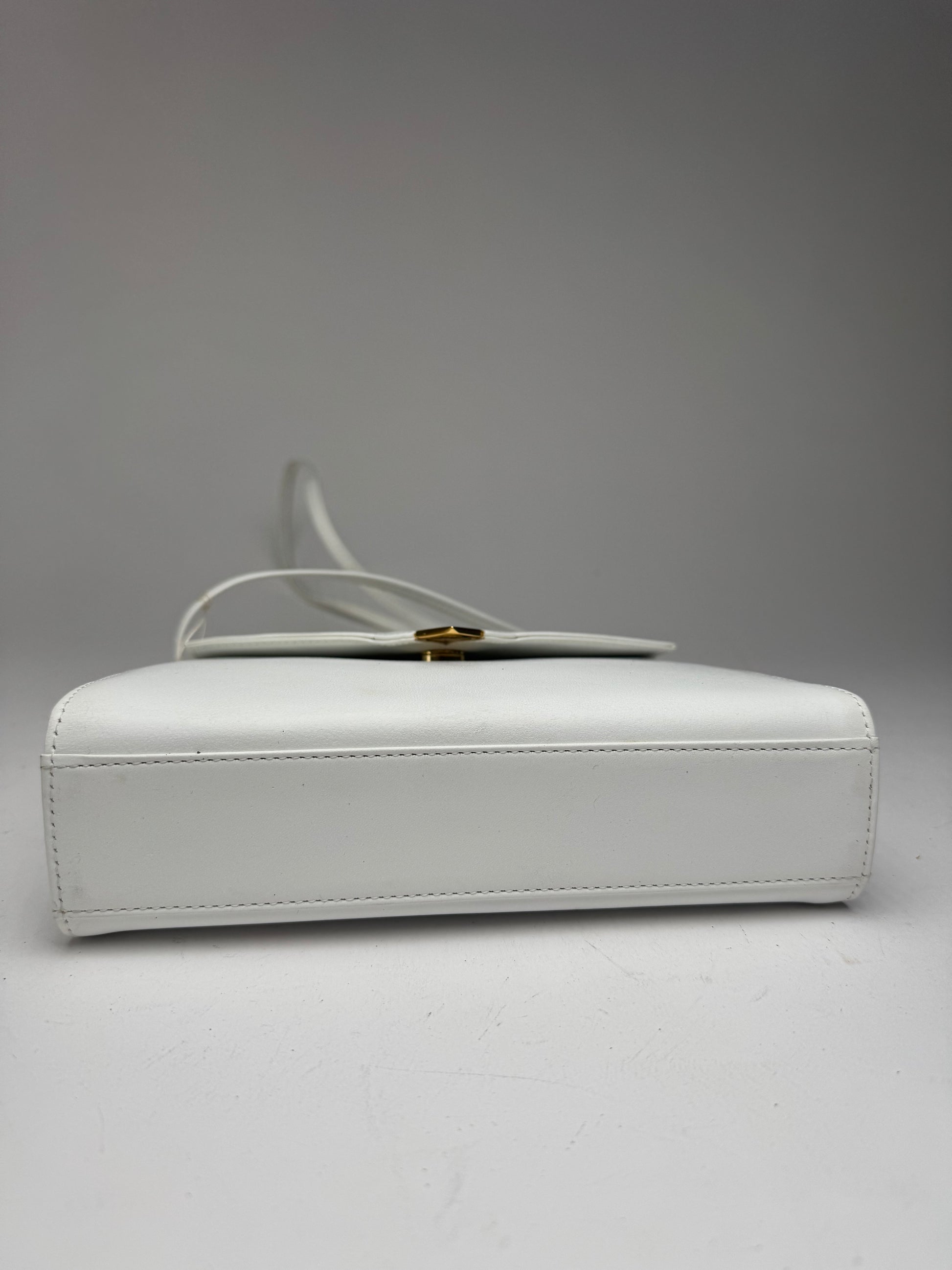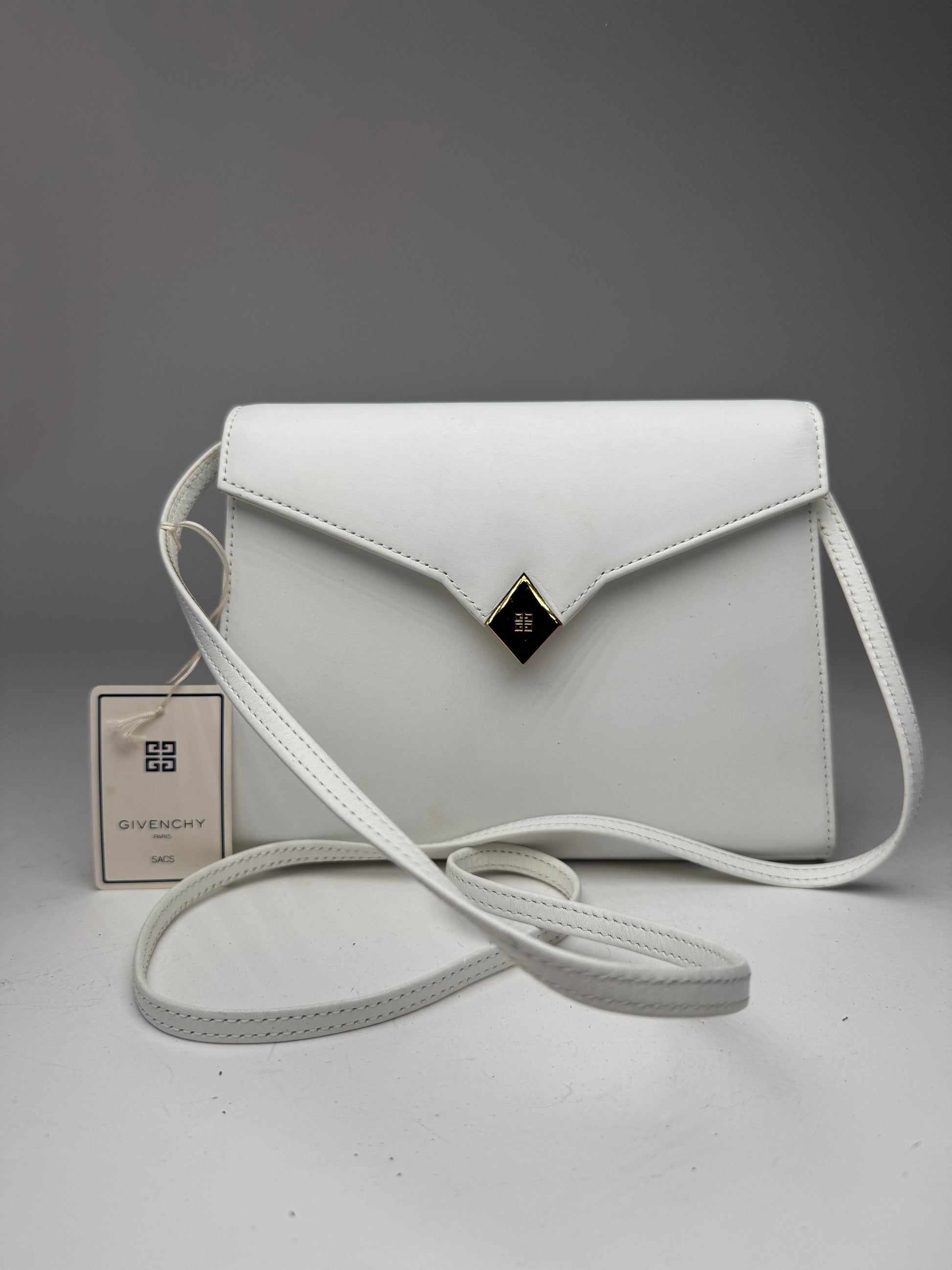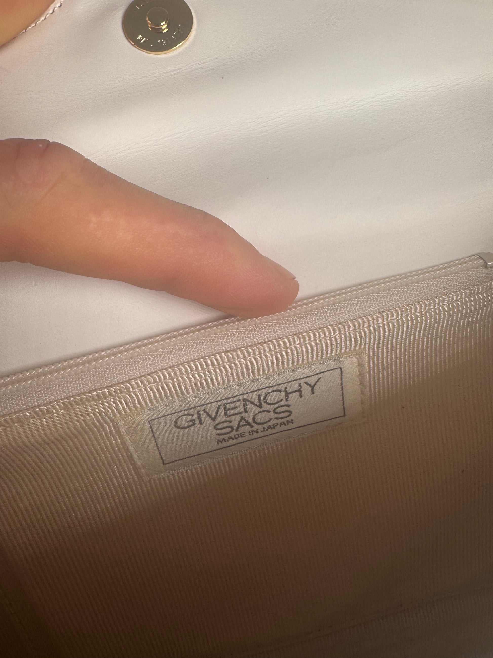 GIVENCHY 4G vintage handbag. This elegant handbag is finely crafted of white leather. Made in Japan, the unisex accessory features gold-toned hardware and a beige canvas interior.