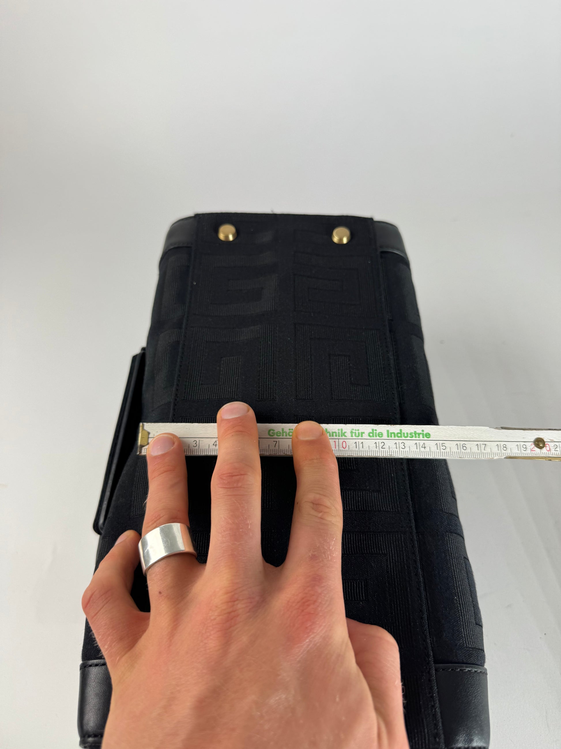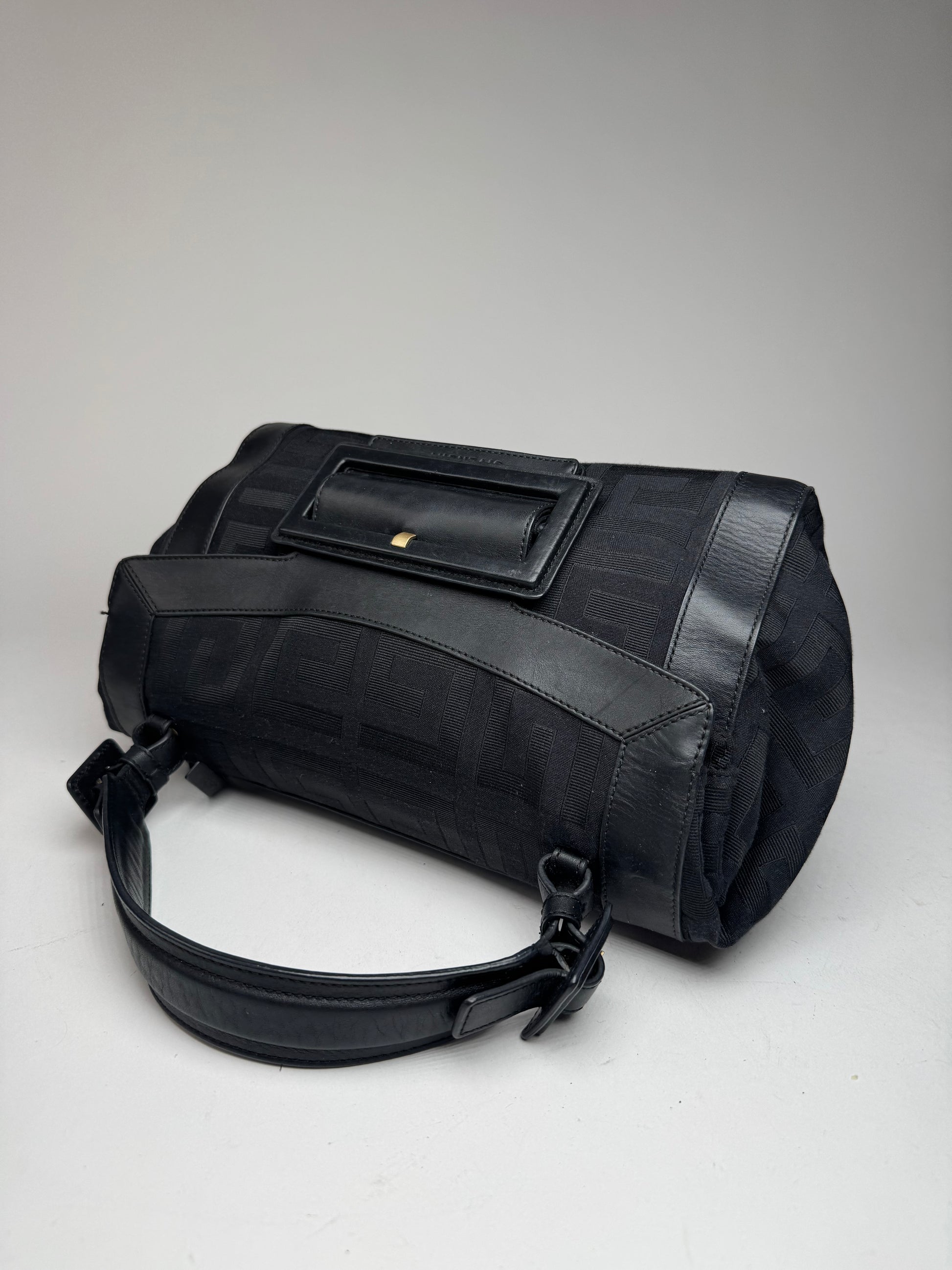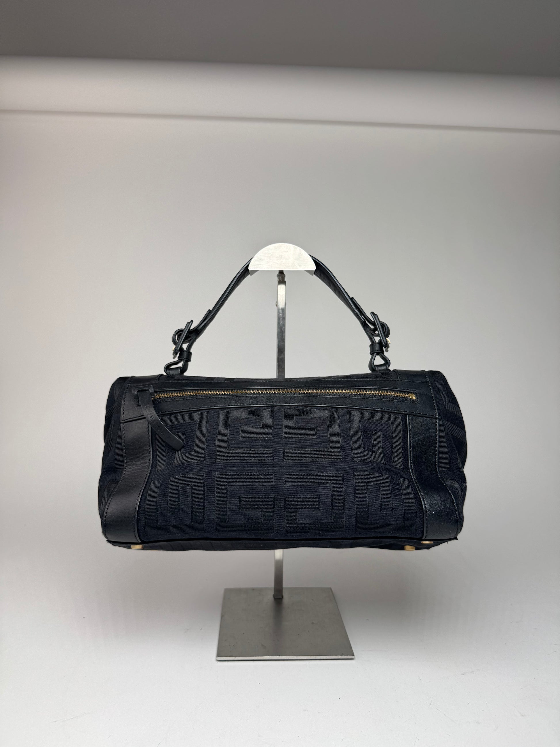 GIVENCHY vintage handbag. This chic handbag is crafted from black leather and monogram canvas featuring the iconic Givenchy pattern. It is styled with a magnetic flap closure and gold-tone stainless steel hardware. The interior is lined with black canvas printed with Givenchy logos.
