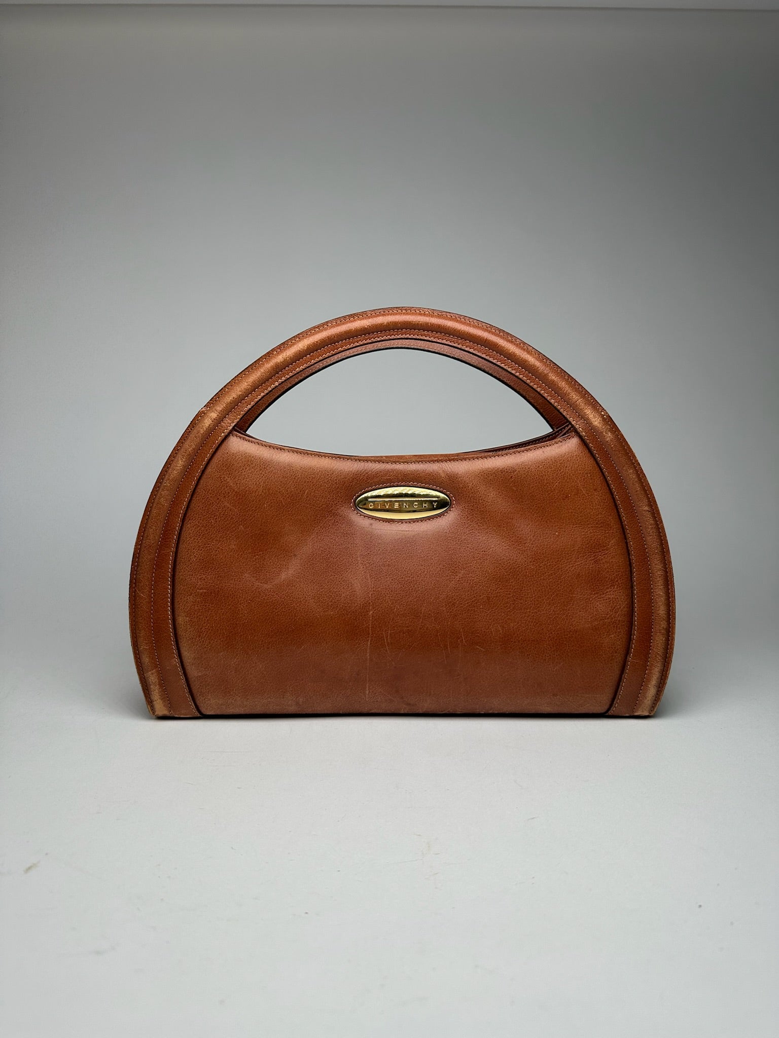 This chic handbag is crafted from brown leather in a distinctive half-moon shape, featuring a magnetic closure and gold-toned hardware. The interior is lined in brown canvas for a clean, classic finish. Made in Japan.
