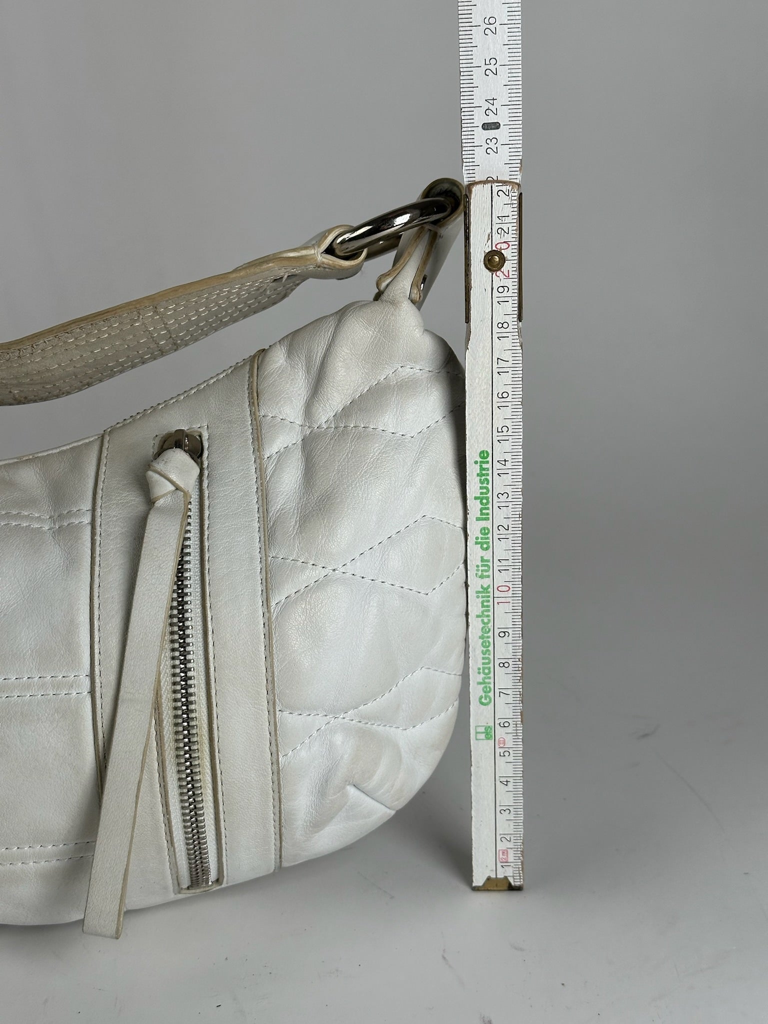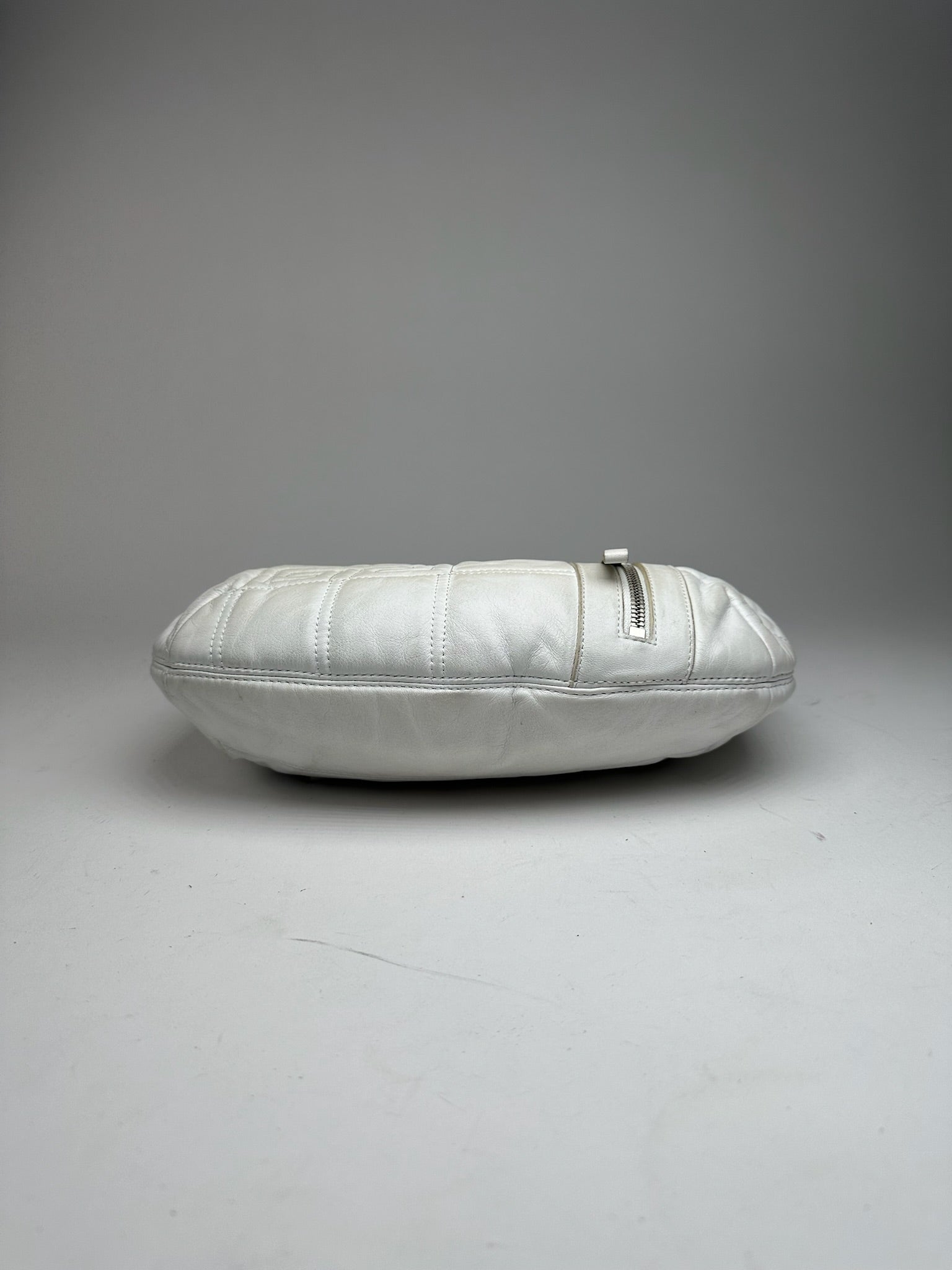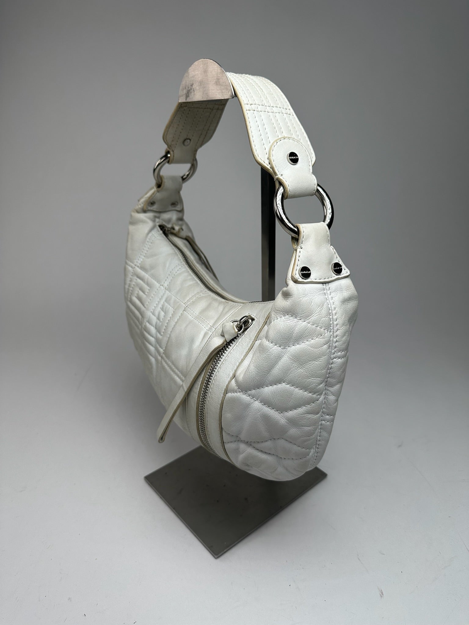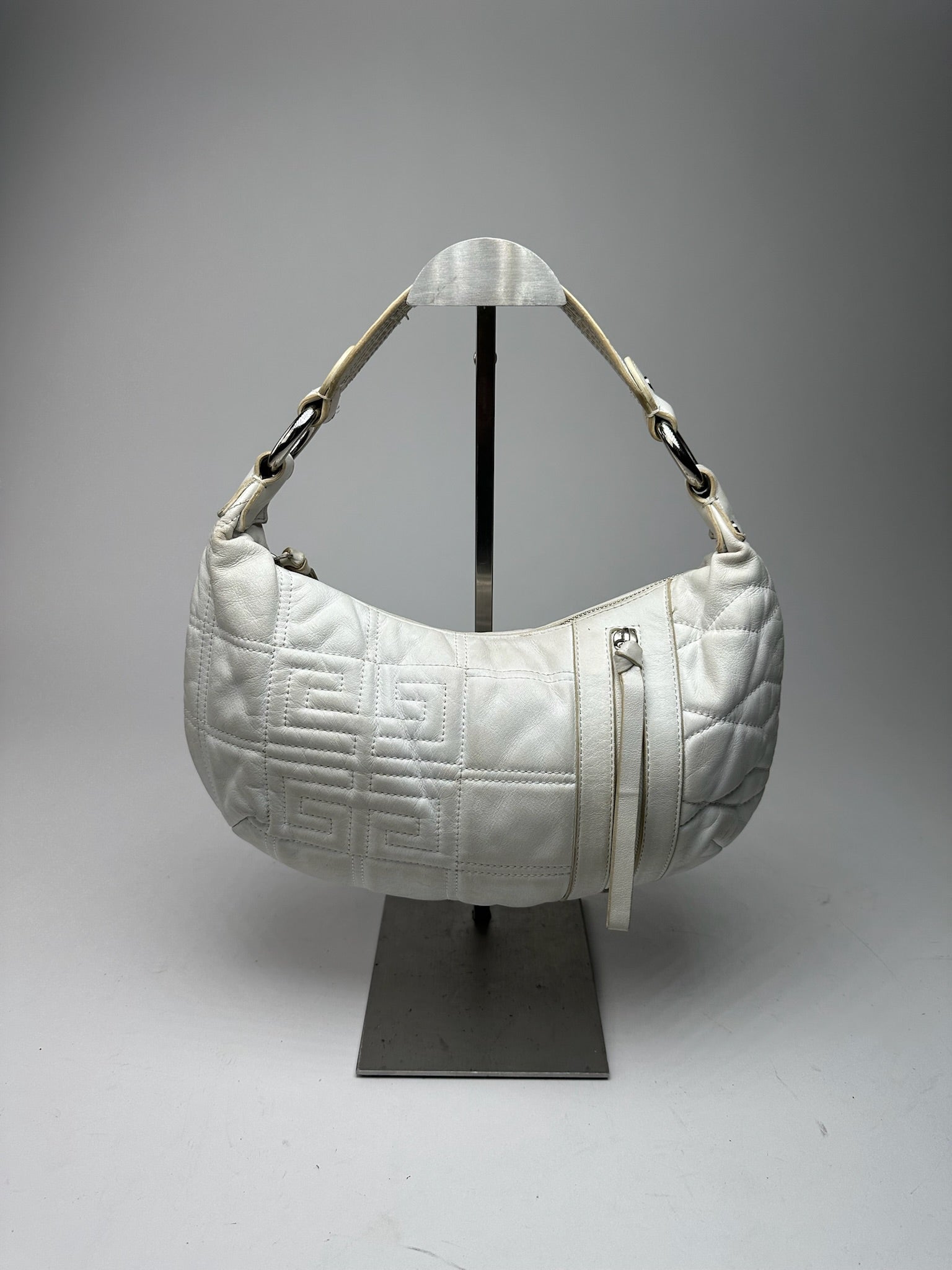 GIVENCHY vintage baguette handbag. This chic handbag is finely crafted of white canvas with white leather accents and features a slightly padded texture. The bag includes silver-tone hardware, multiple zipper closures with leather pulls, and a Givenchy logo on the front. The interior is lined with gray canvas.