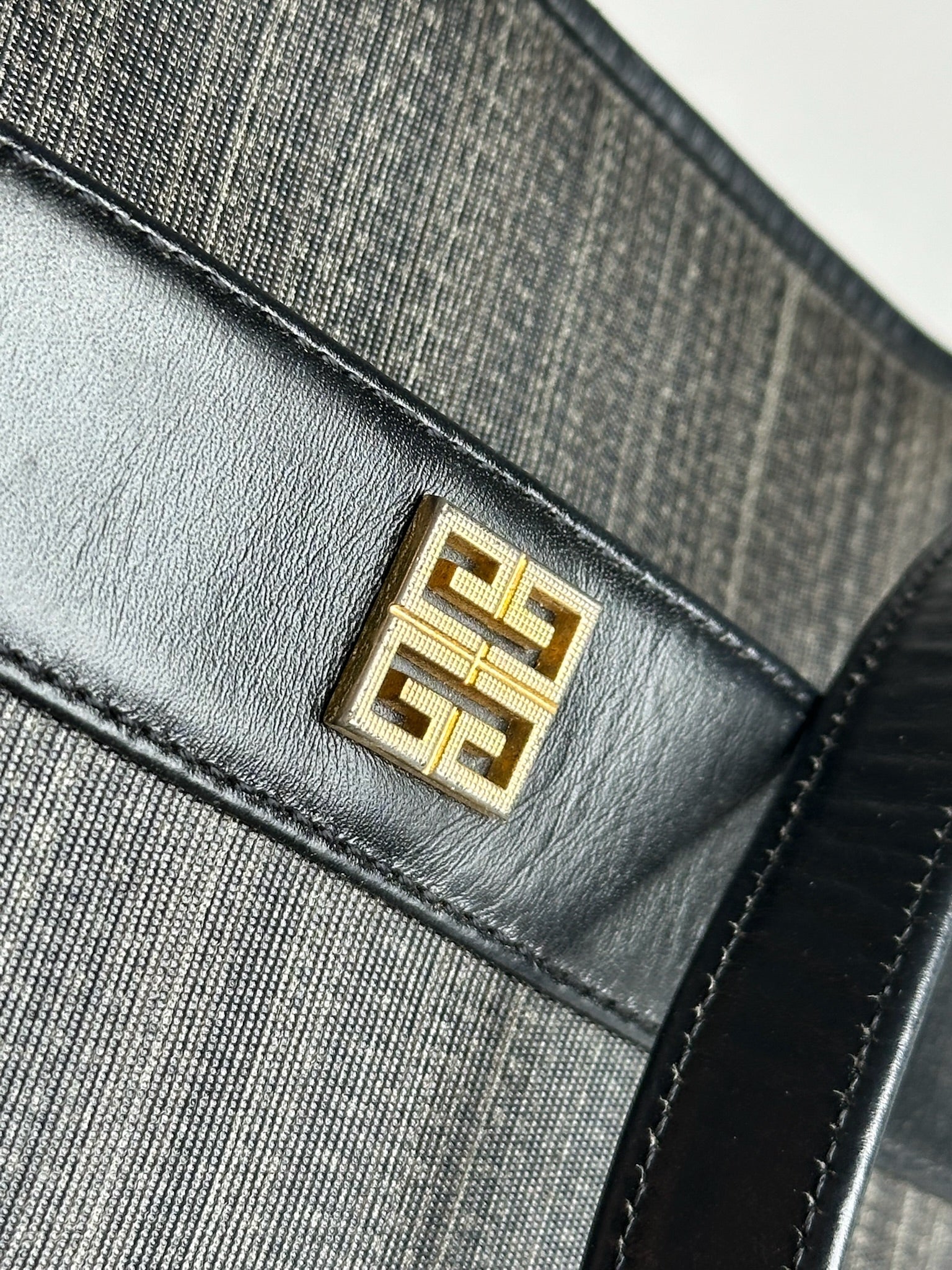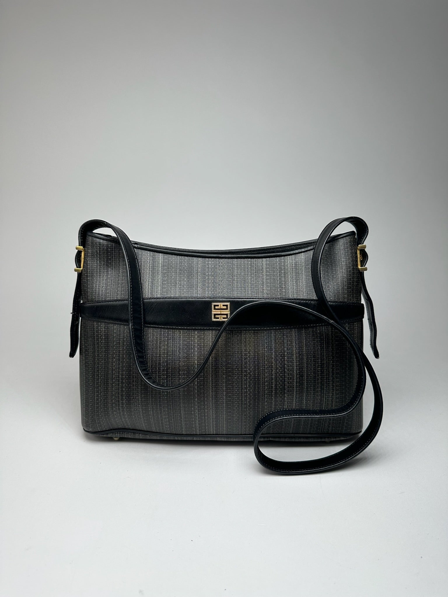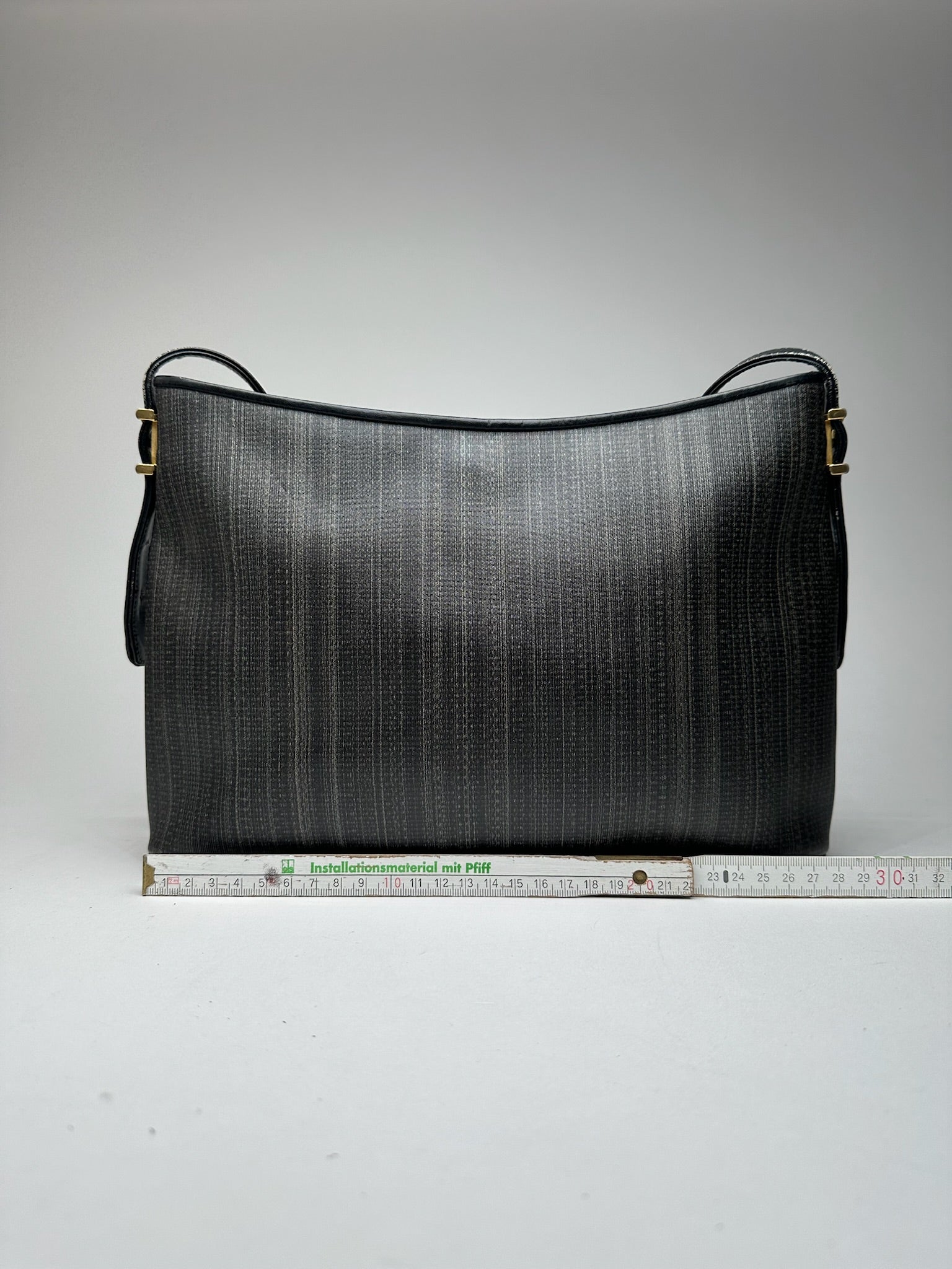 This sophisticated handbag is finely crafted of black leather combined with gray patterned leather. It features gold-tone steel hardware and a top zipper closure.