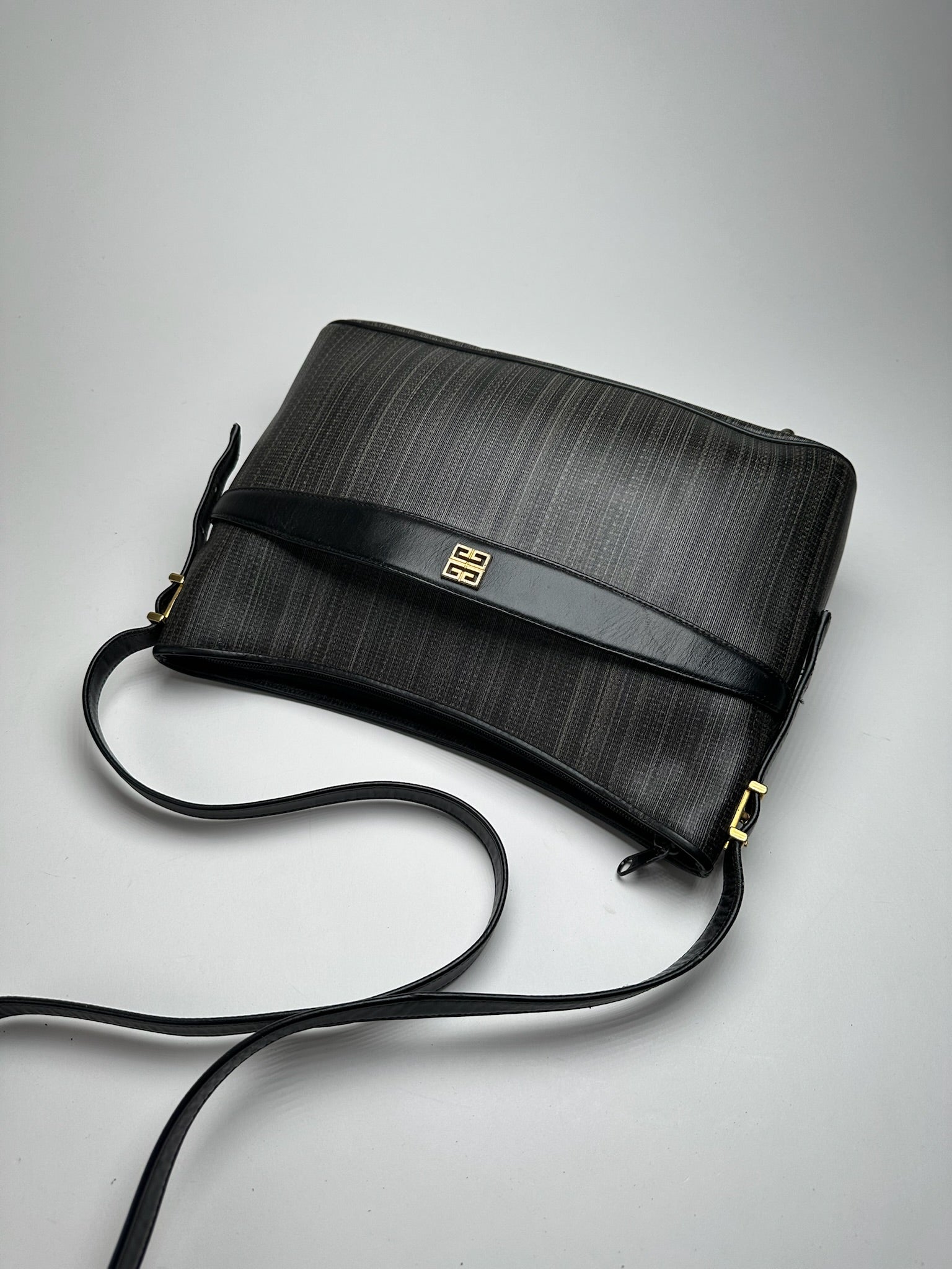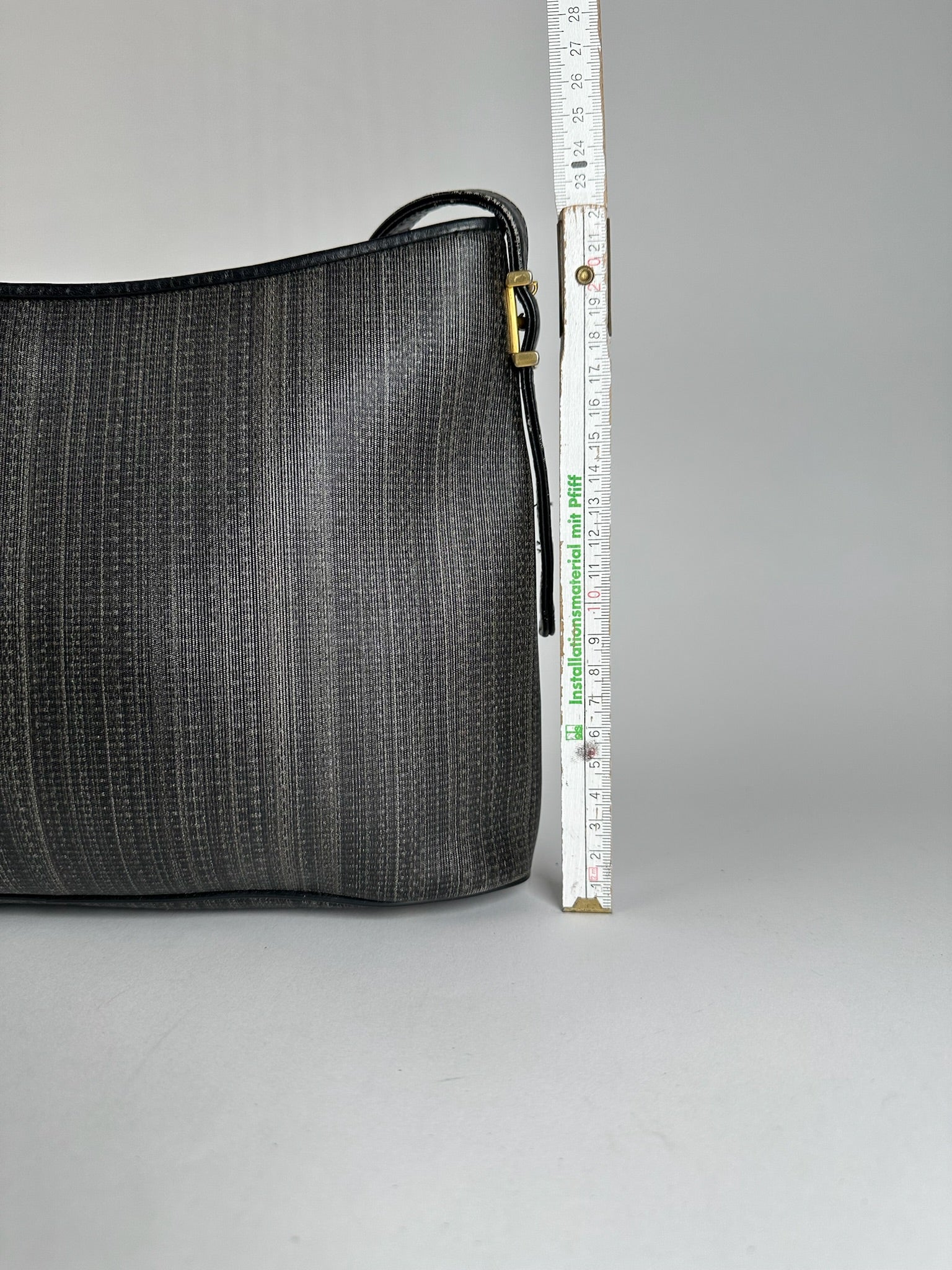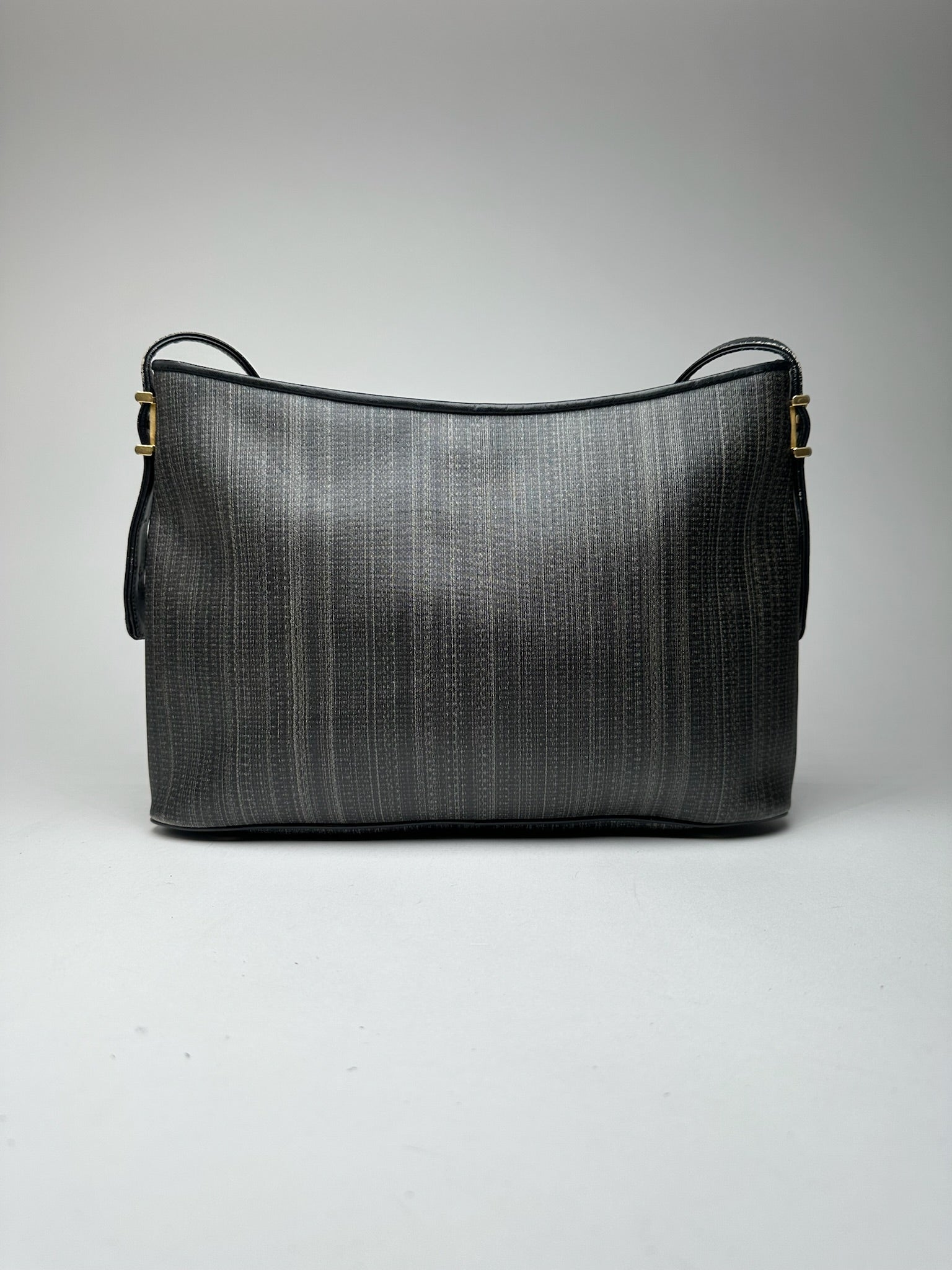 This sophisticated handbag is finely crafted of black leather combined with gray patterned leather. It features gold-tone steel hardware and a top zipper closure.