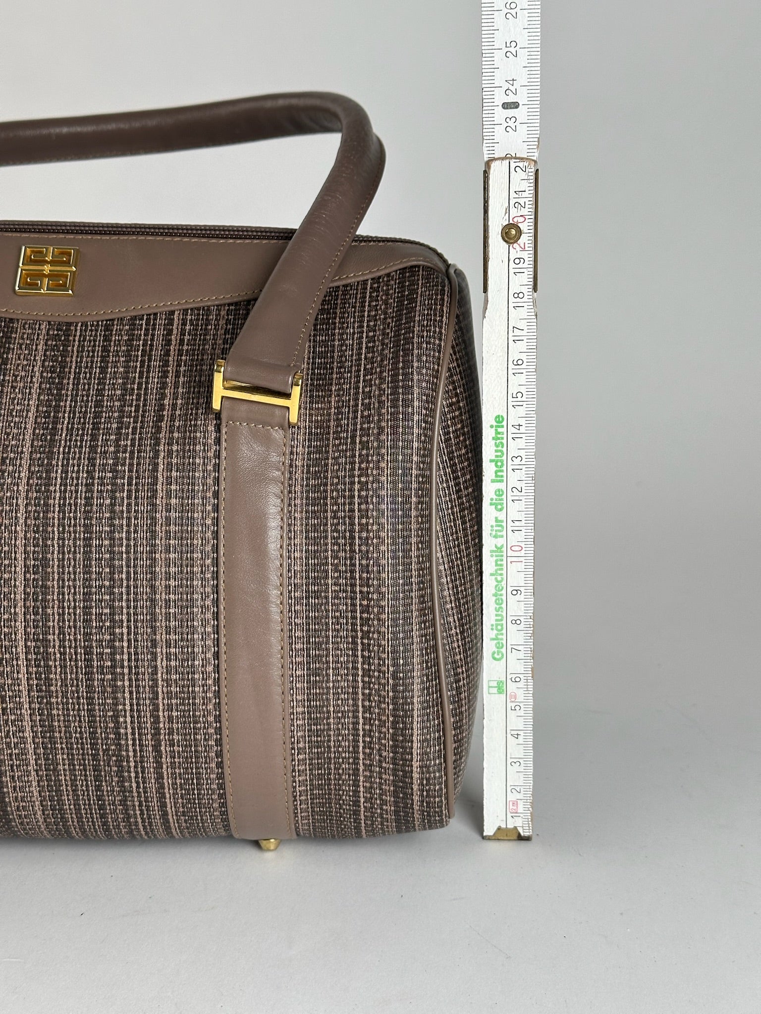 GIVENCHY vintage handbag. This classic handbag is finely crafted of brown leather with contrasting brown-black textured leather panels. The bag features two sturdy top handles, gold-tone steel hardware, and a chain-attached leather cardholder. The interior offers ample space for daily essentials.
