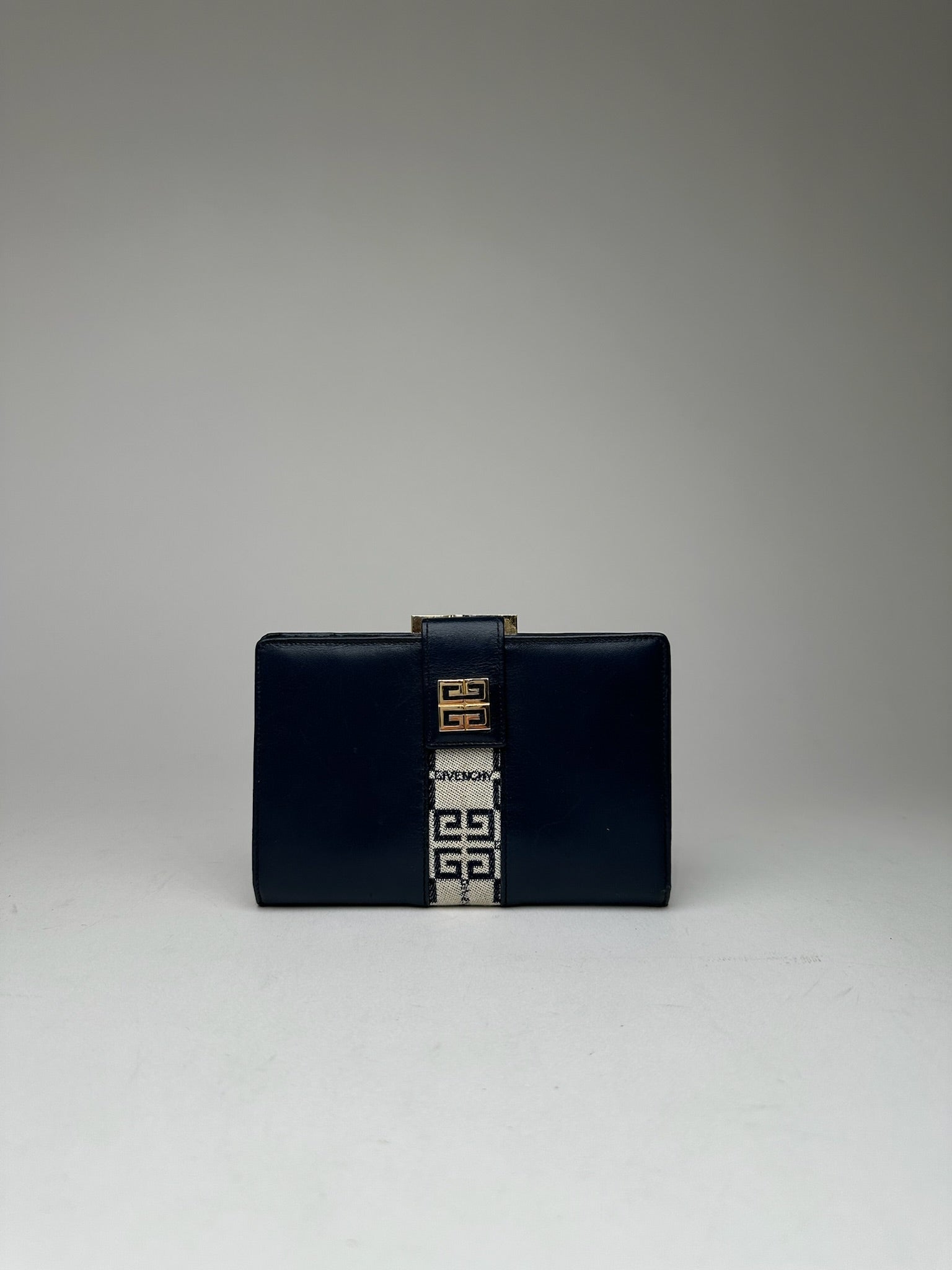 This chic wallet is crafted from navy leather with gray and black leather panels featuring the classic Givenchy monogram. Finished with gold-toned steel hardware, it combines elegant detailing with everyday functionality. Designed as a versatile unisex accessory.
