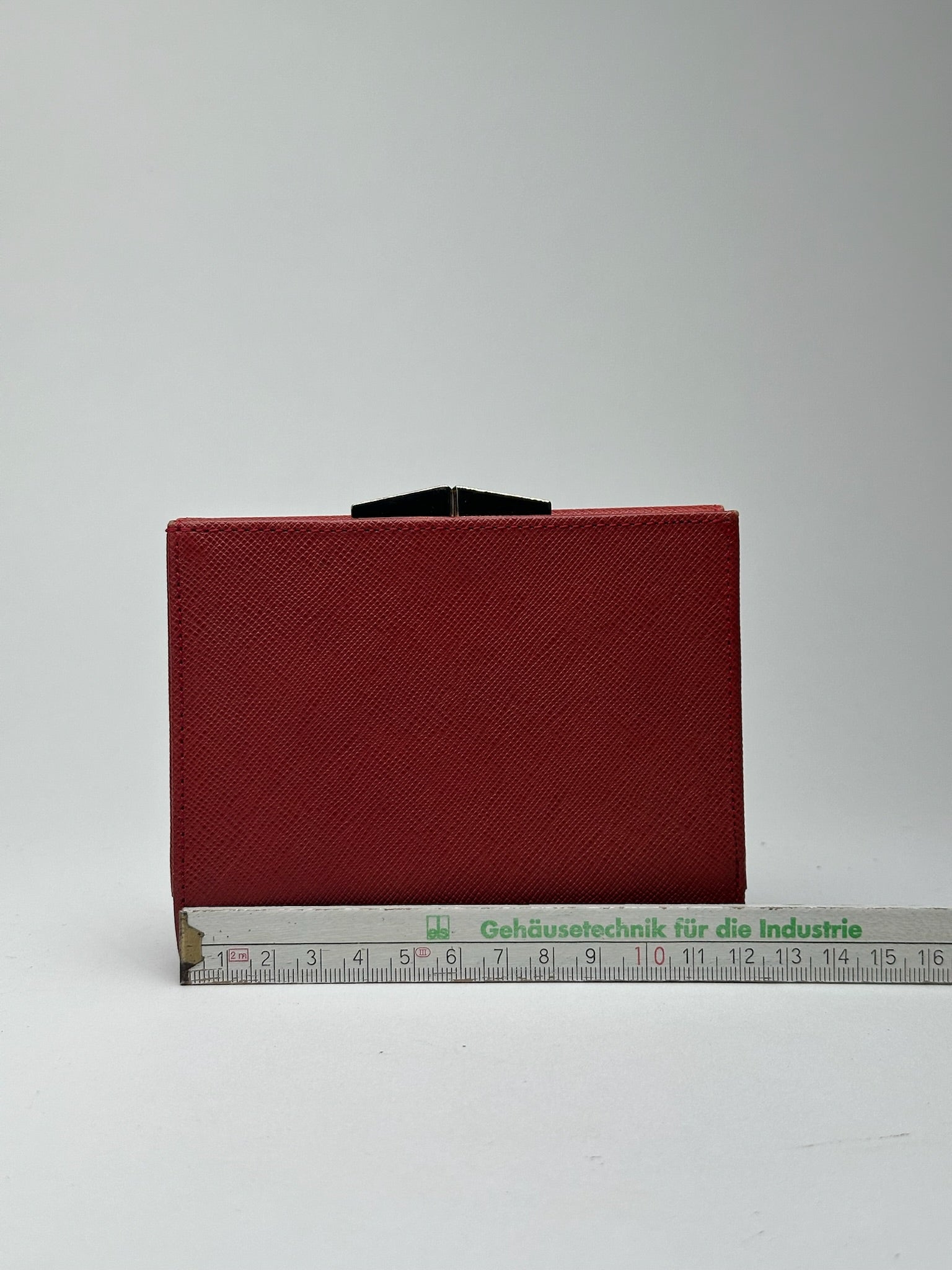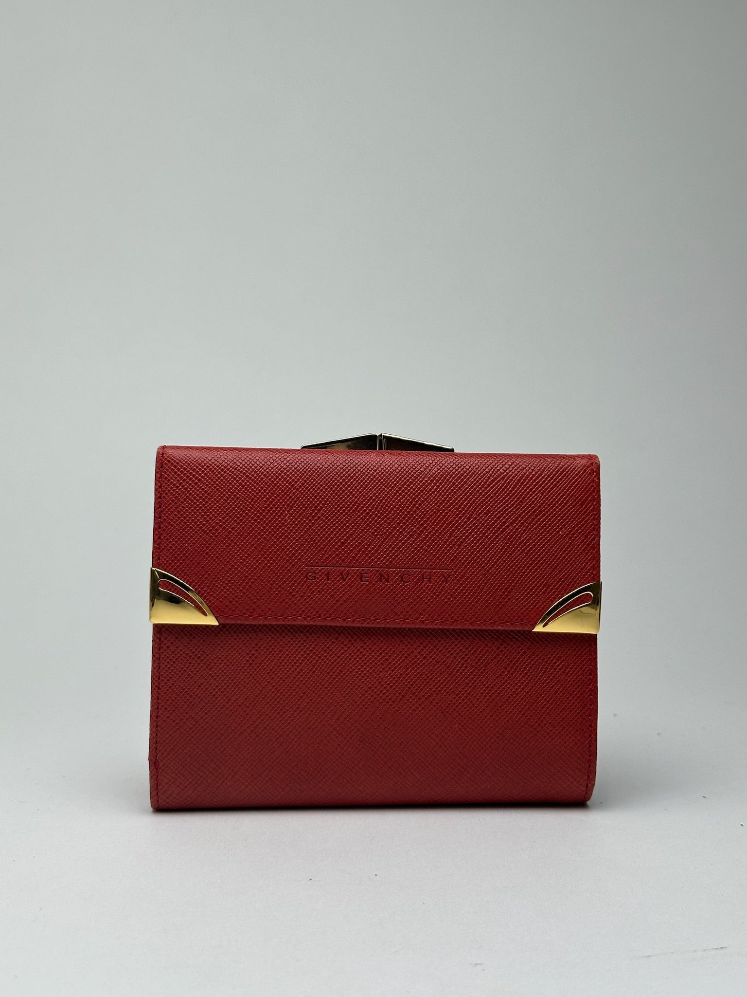 GIVENCHY vintage wallet. This elegant wallet is finely crafted of red leather with a subtle textured finish. The piece features a gold-tone steel hardware and an embossed GIVENCHY logo on the front. It includes a flap closure for the coin compartment and a snap button closure for bills and cards.