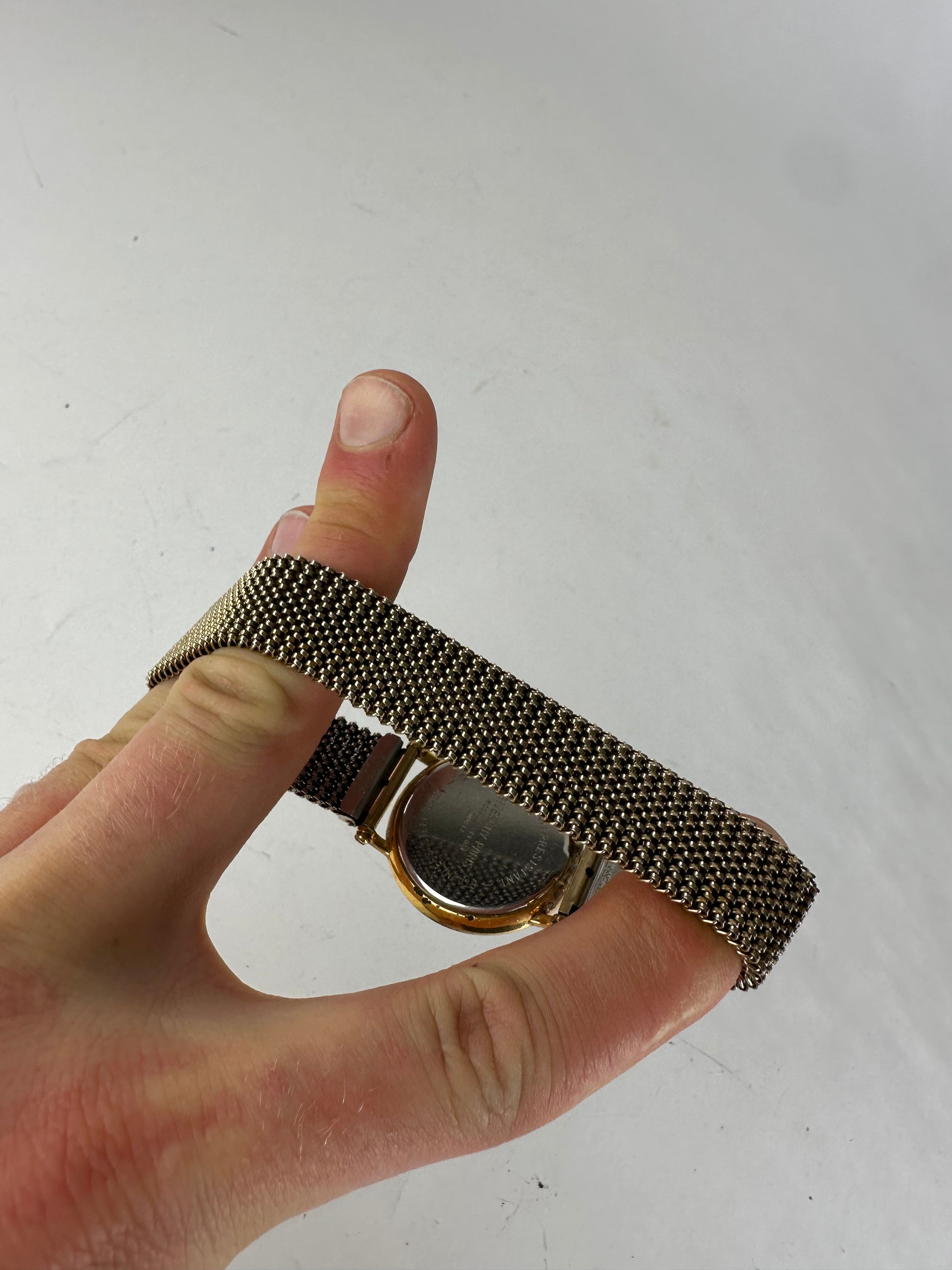 Condition Details: The gold-tone steel case shows light scratches and small rust marks. The bracelet remains functional and secure. The dial is clean and well preserved. The movement is fully functional with a recently replaced battery.