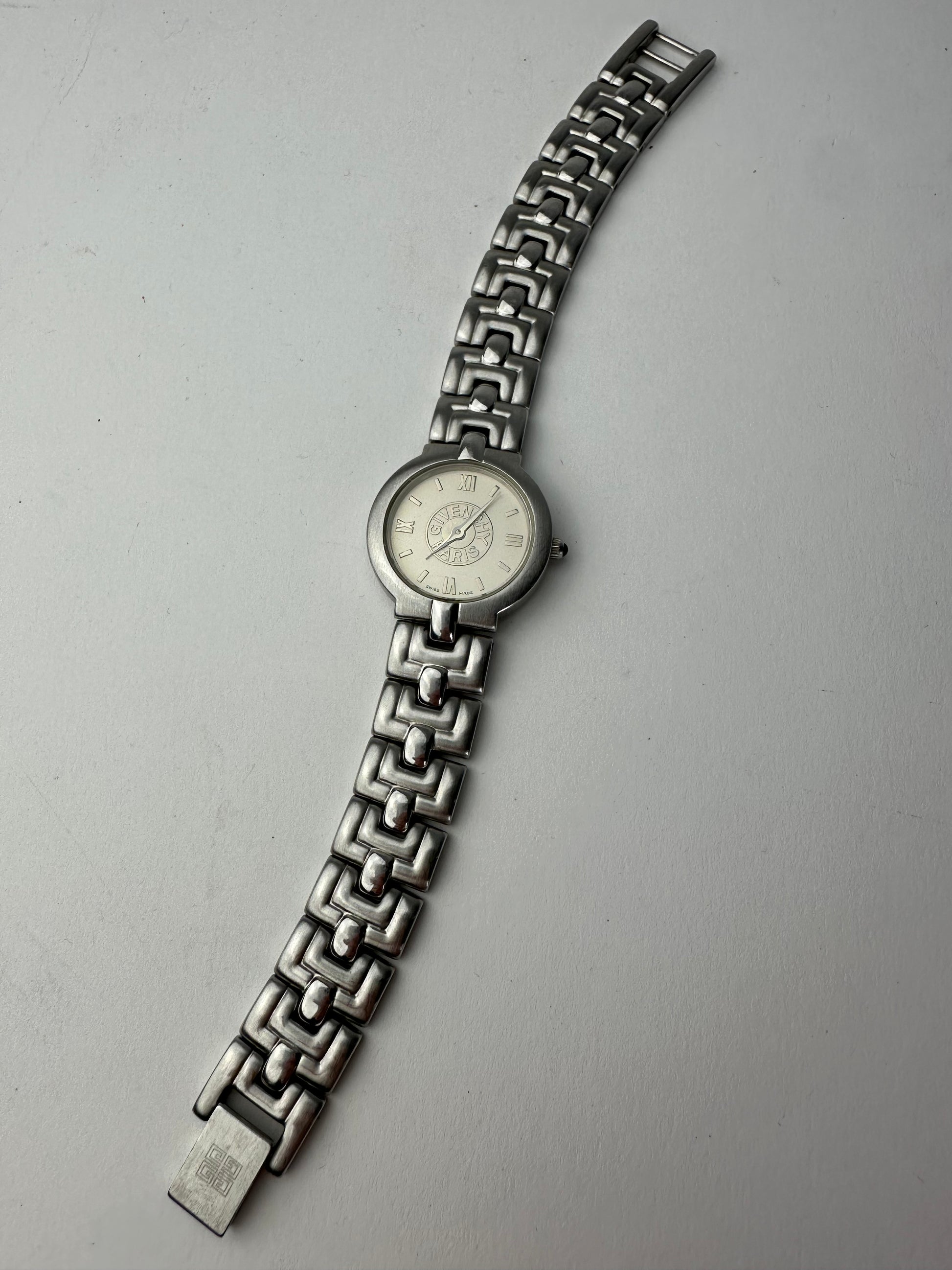 GIVENCHY Vintage Stainless Steel Watch. This elegant vintage watch is crafted of silver-tone stainless steel and features a matching chain-style steel bracelet. The watch showcases an abstract white dial with a minimalist aesthetic. It is quartz powered, and the battery has been recently replaced. The design is suitable for unisex wear. Swiss Made and water resistant.