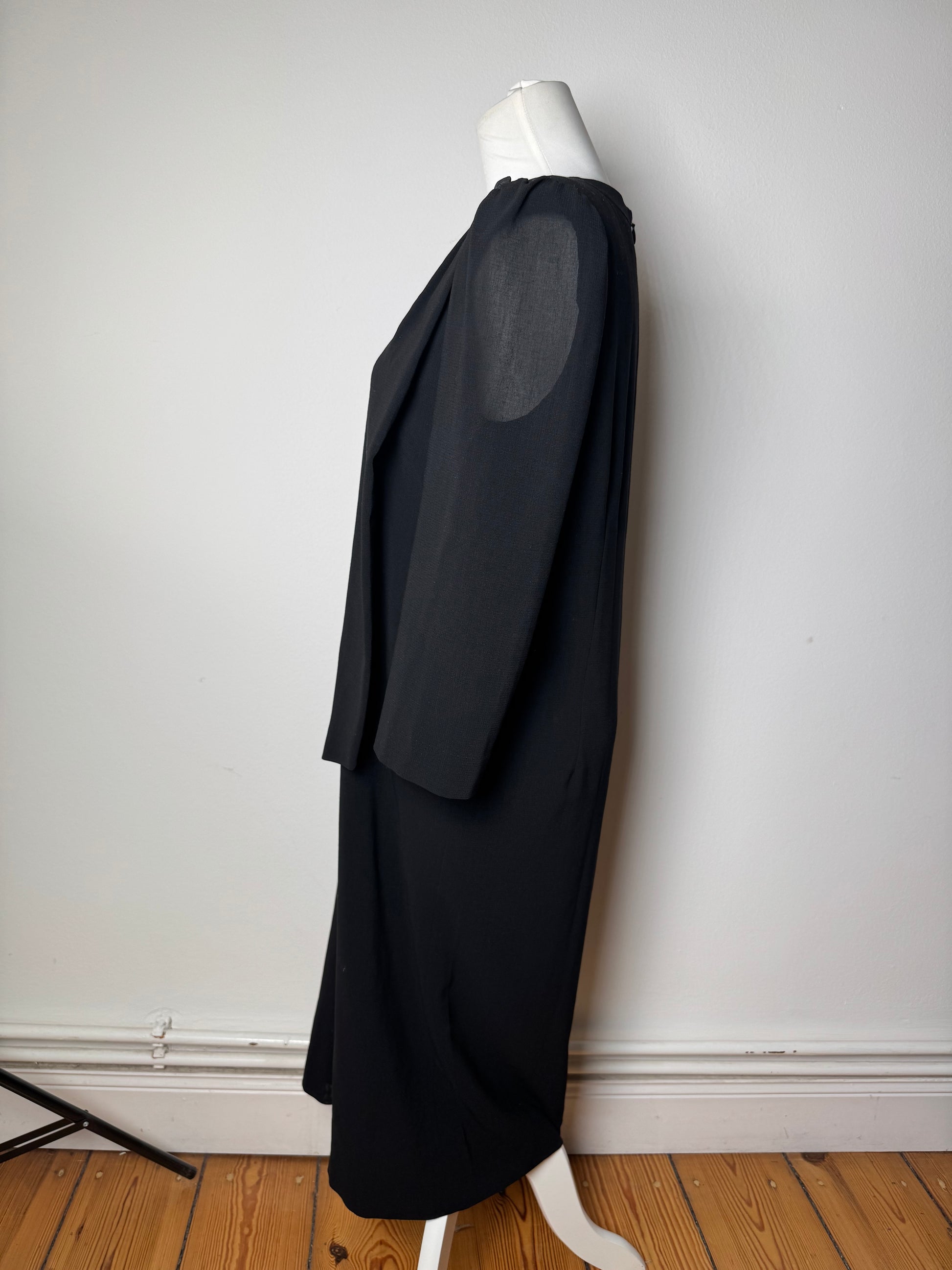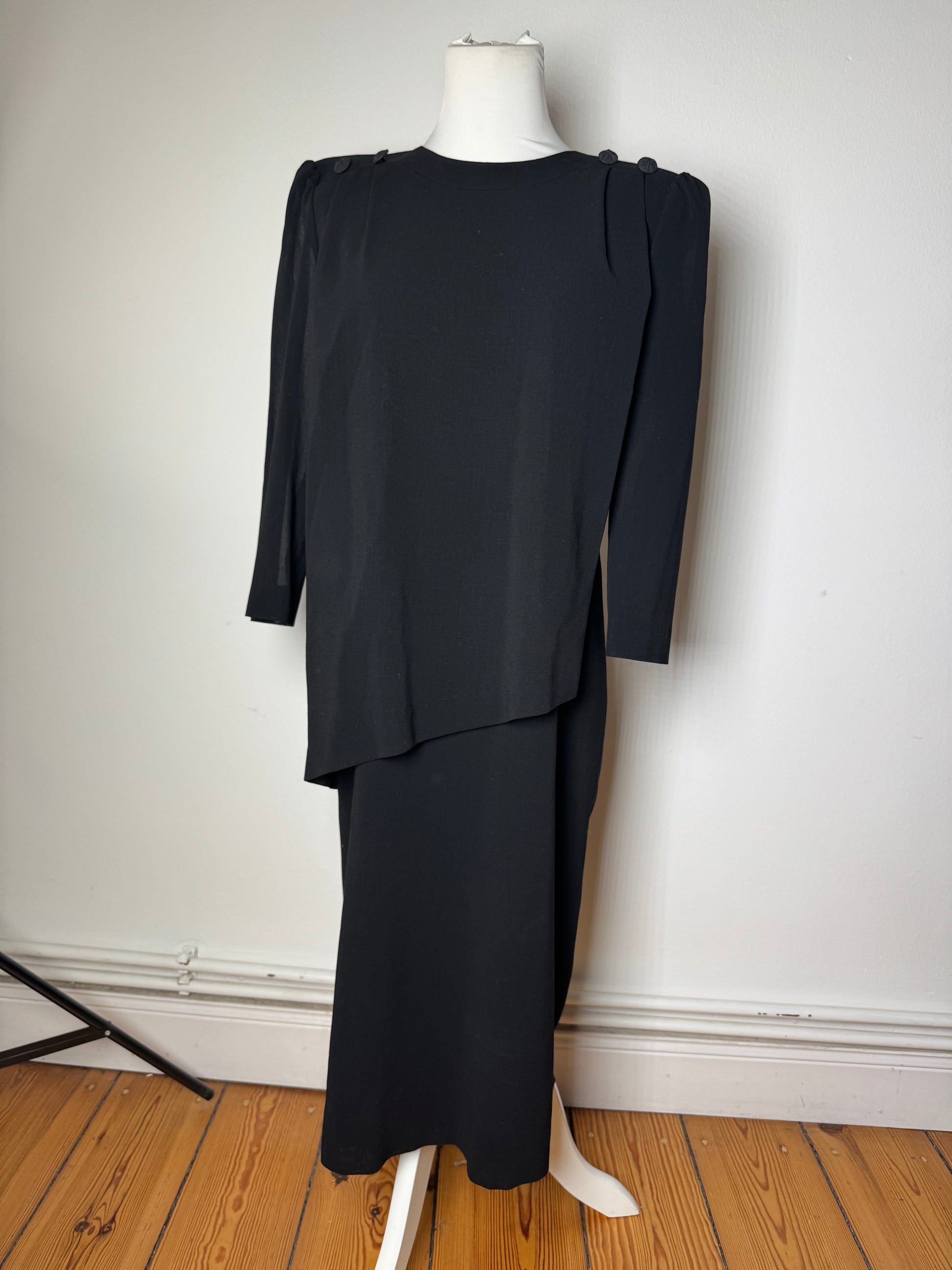 This elegant vintage dress is crafted from black 100% lana wool and features a sophisticated multi-layered design with subtle shoulder pads, creating a timeless and refined silhouette. The dress is finished with a smooth viscose lining, ensuring comfort and structure.