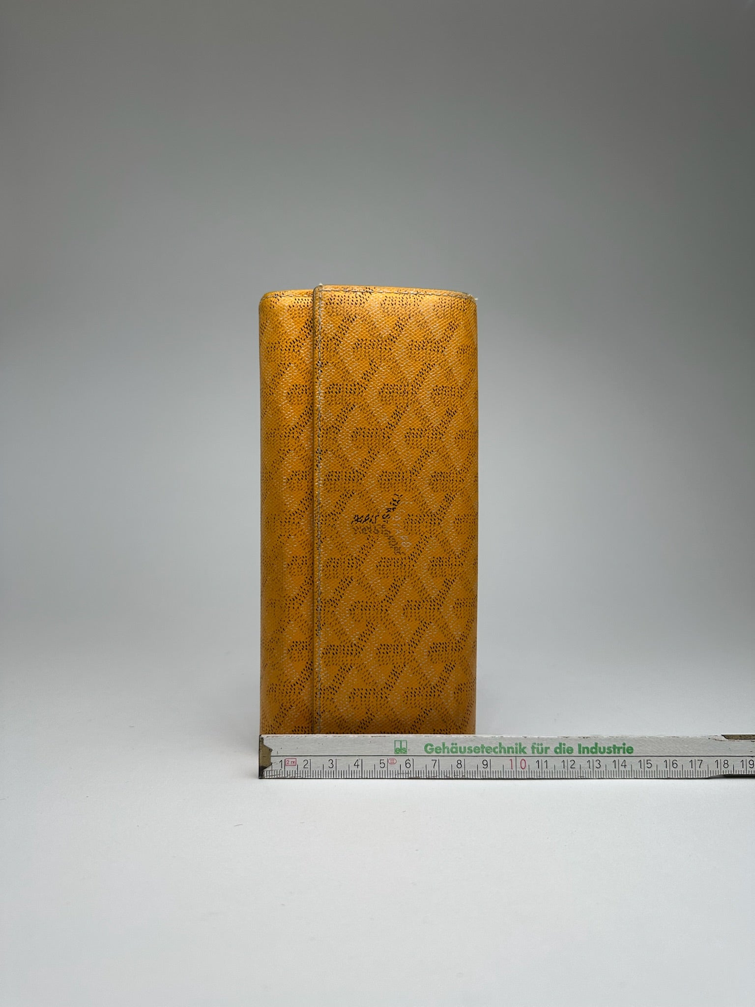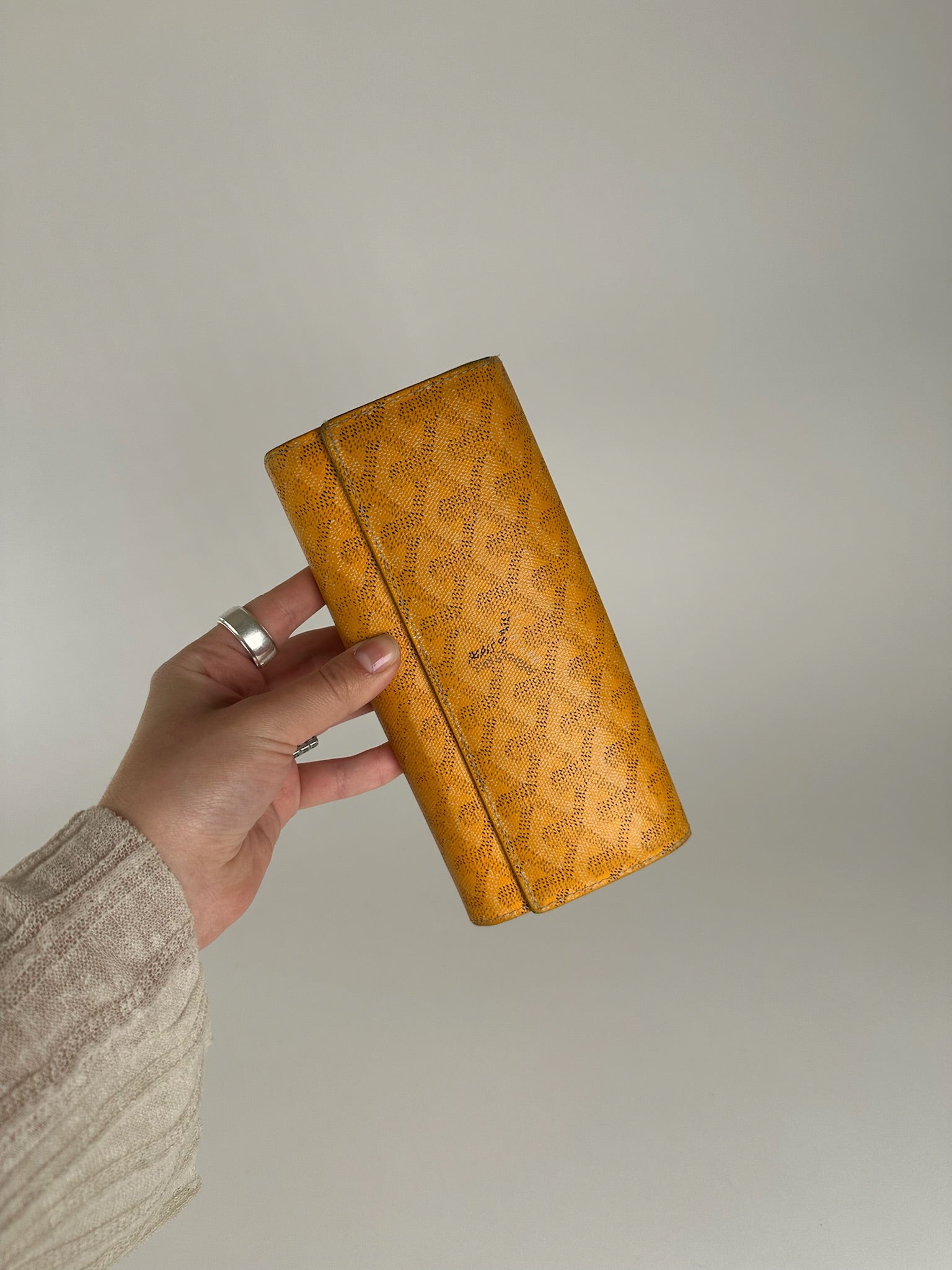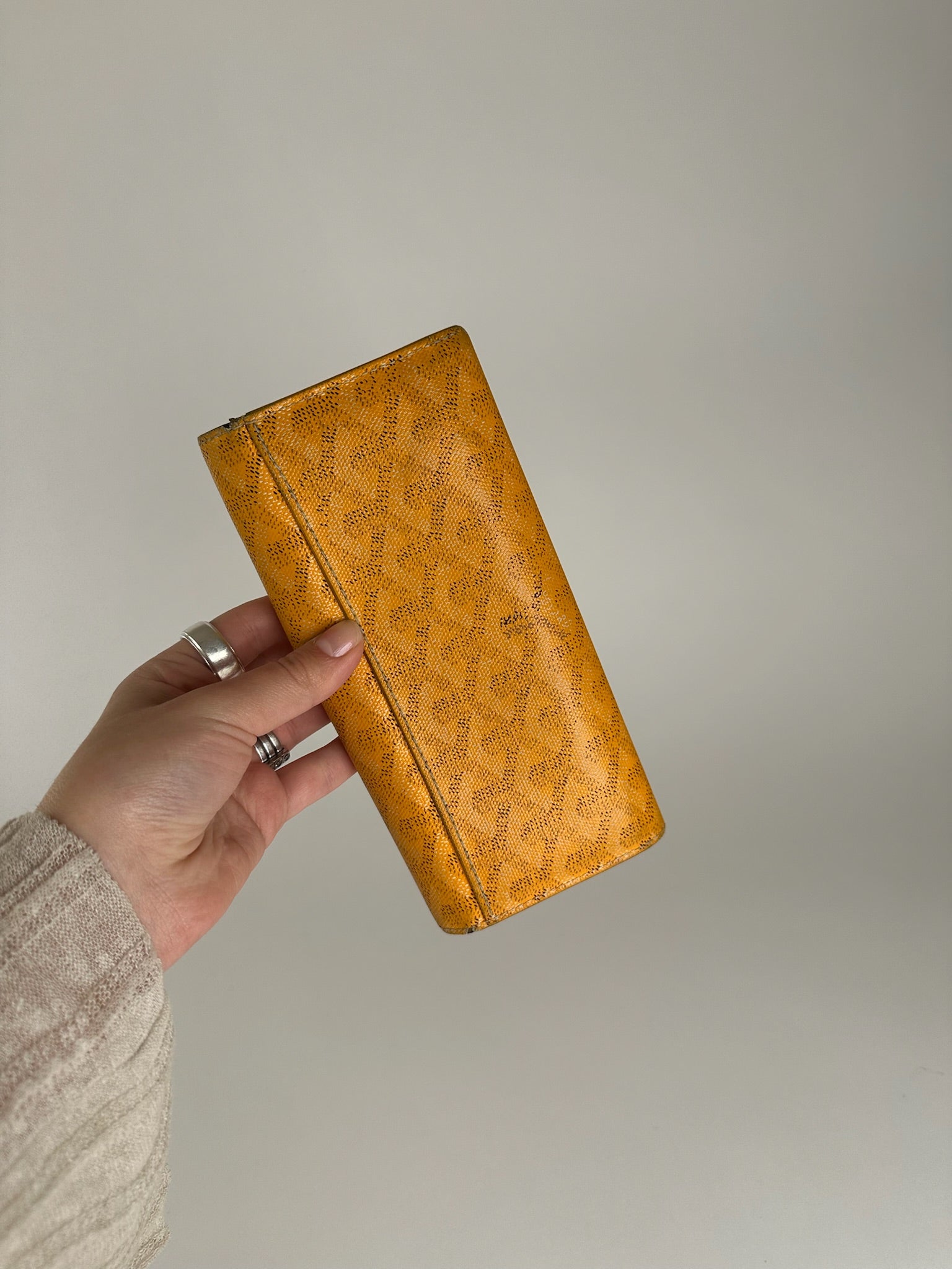 GOYARD Vintage Monogram Wallet. This chic wallet is finely crafted of mango-colored Goyard monogram leather. The wallet features a snap button closure and a zip compartment inside. The flap opens to an interior lined in plain mango-colored leather.