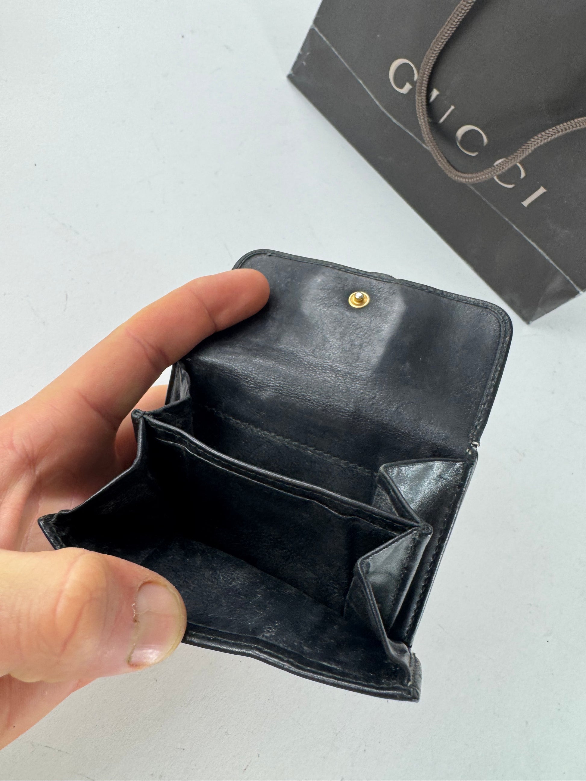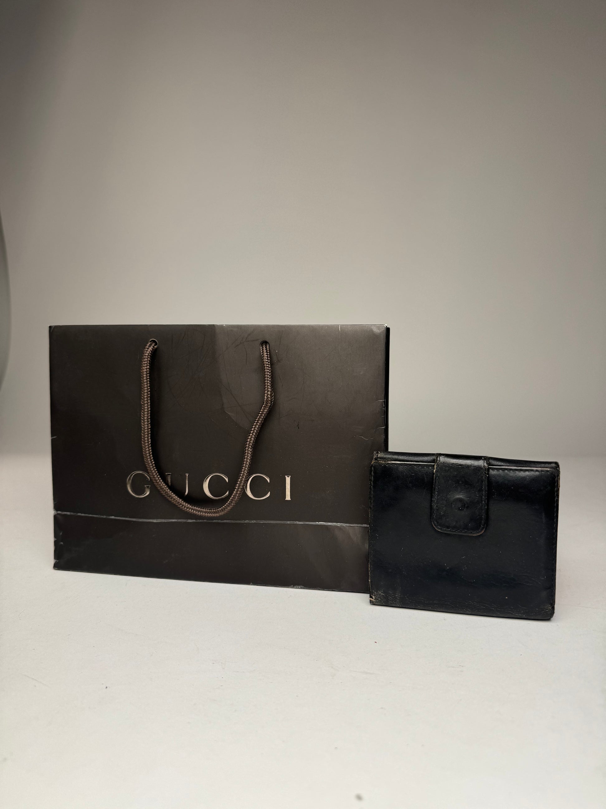 GUCCI Vintage Wallet. This elegant vintage wallet is finely crafted of smooth black leather and features a signature bamboo appliqué on the front, a hallmark Gucci detail introduced in the 1940s as a creative solution during material shortages and now a timeless symbol of the house’s craftsmanship. The wallet features snap-button closures on both the front and back and opens to a practical interior layout. Made in Italy.