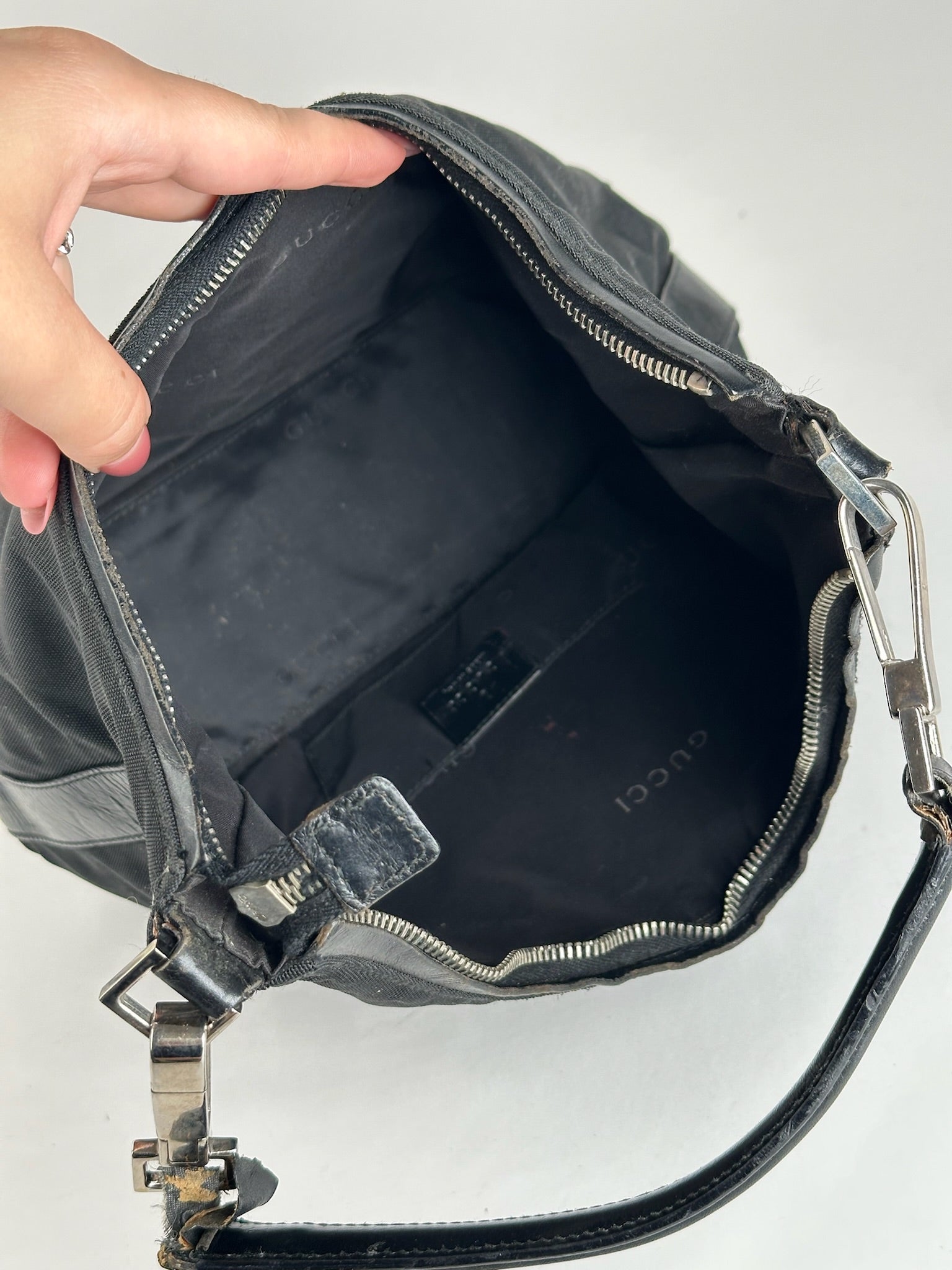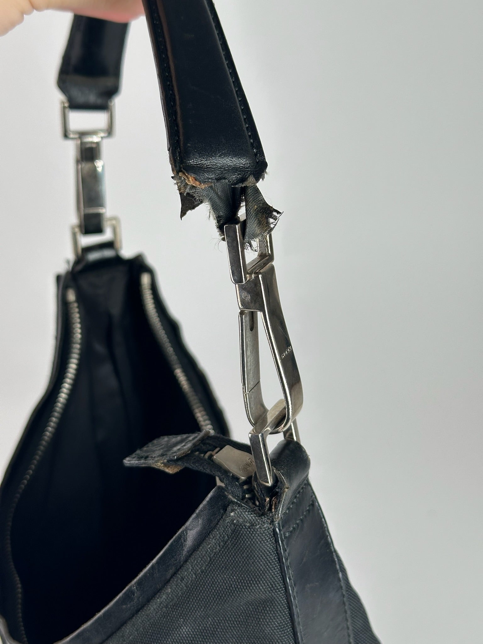 GUCCI Vintage Black Canvas Handbag. This chic handbag is finely crafted of black Gucci canvas. The shoulder bag features black leather top handles and trim. The top opens to a black polyester interior with Gucci logos.