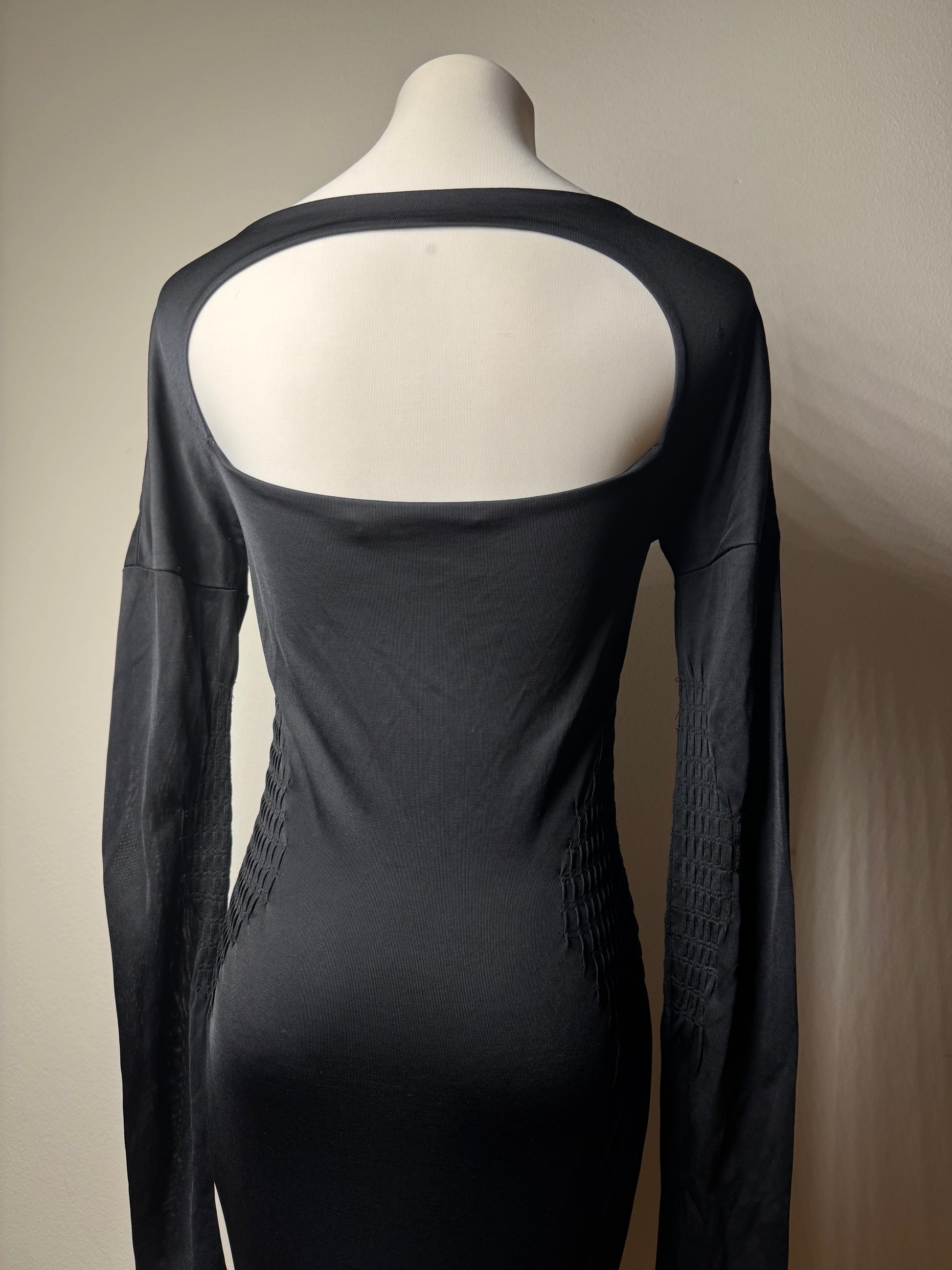 GUCCI Vintage Dress. This exceptional vintage dress features a unique and eye-catching design, reflecting Gucci’s distinctive aesthetic. It is crafted from synthetic material with a slightly stretchy feel, ensuring a flattering and comfortable fit.