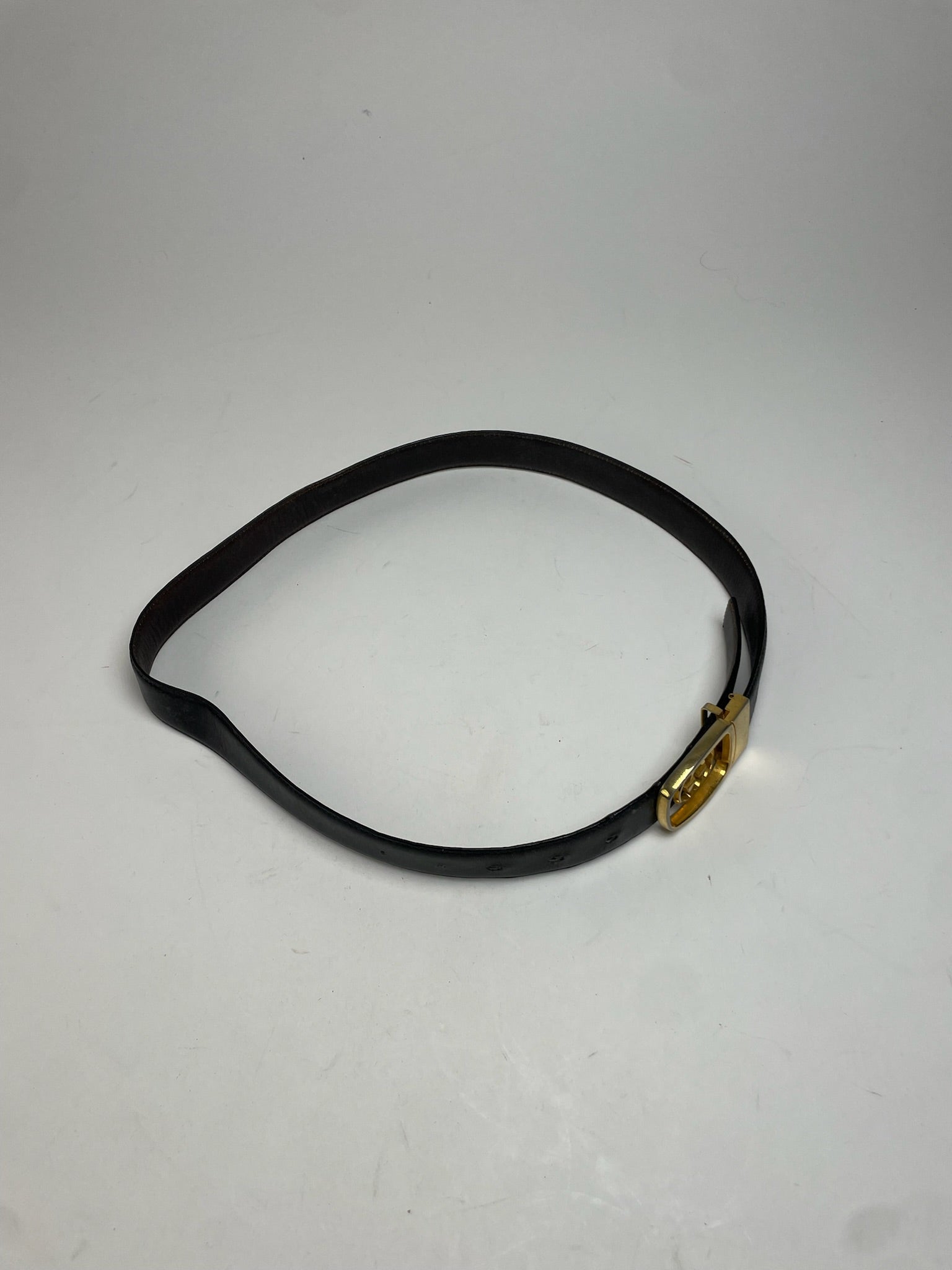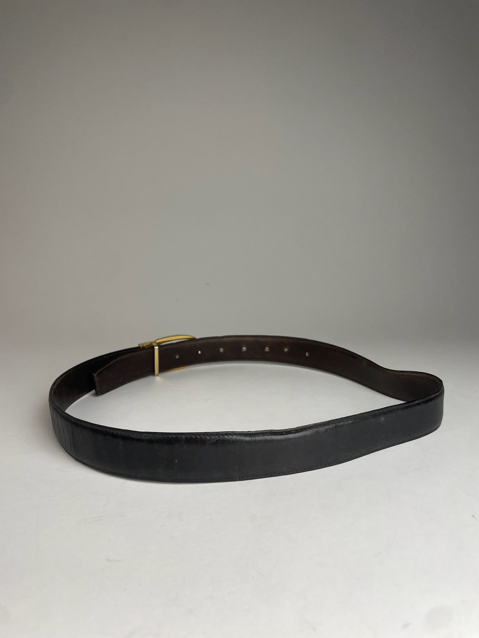 GUCCI Vintage Belt. This classic vintage belt is crafted of dark brown leather and features a gold-tone steel buckle in the iconic Gucci GG logo shape. The GG logo was introduced in the 1960s as a tribute to Guccio Gucci, the founder of the house, and has since become one of the most recognizable symbols of Italian luxury and craftsmanship.