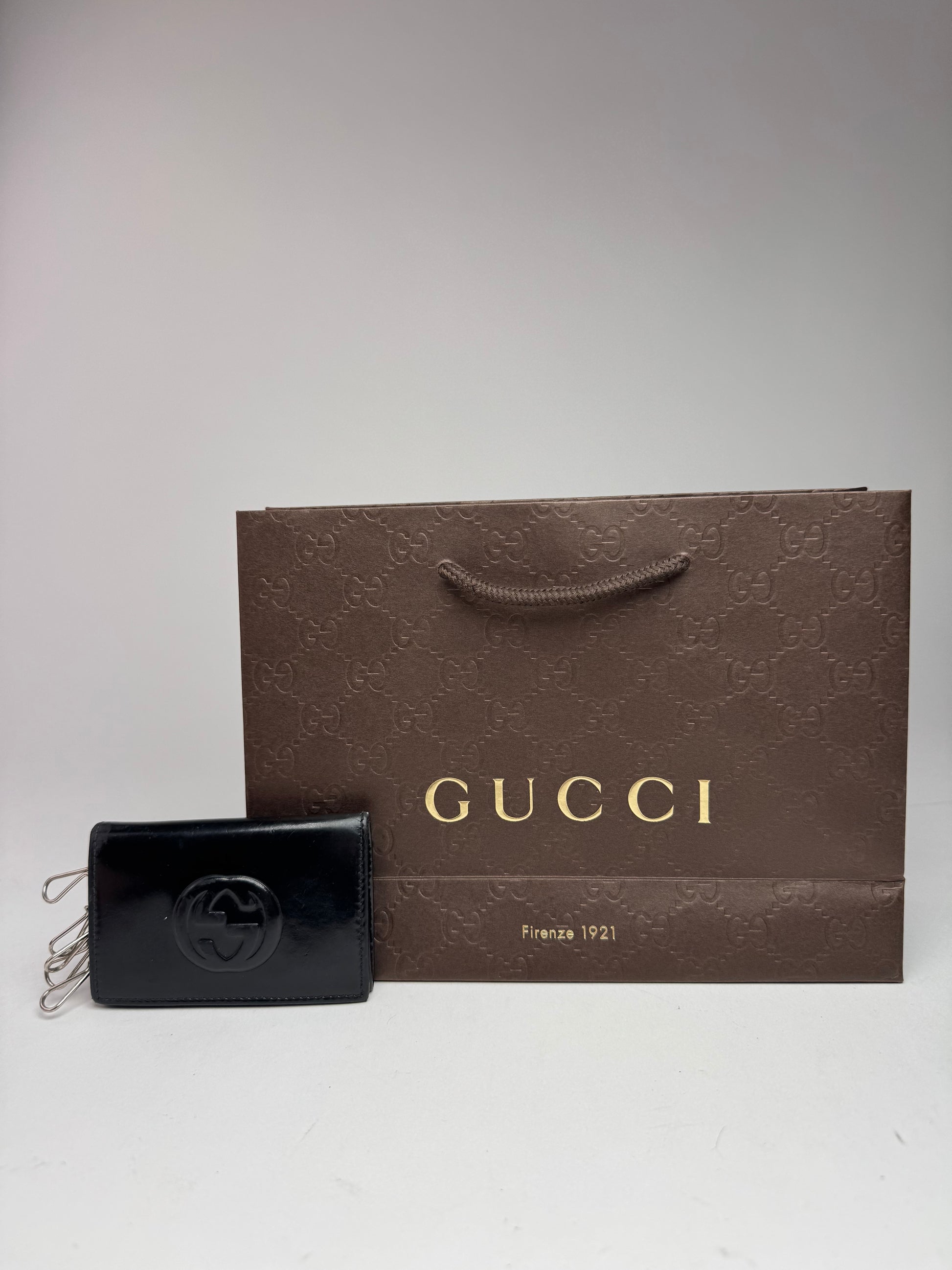 GUCCI Vintage Black Leather Keyholder. This classic unisex keyholder is crafted from black smooth leather and features the iconic GG logo on the front. It is made in Italy and offers space for at least five keys. One of six original key hooks is missing. The interlocking GG logo was introduced in the early 1960s as a tribute to Guccio Gucci, the brand's founder, and has since become a universal symbol of refined Italian luxury.