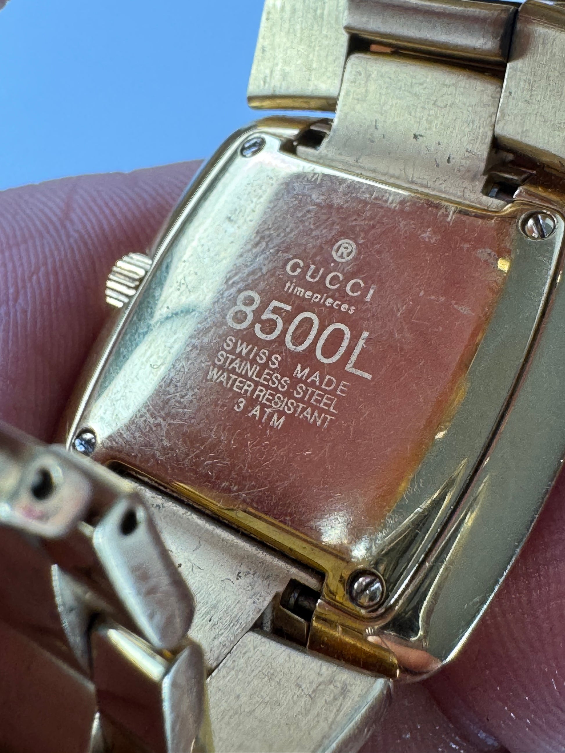 The engraving “8500L” on the back refers to Gucci’s internal model reference number within the 8500 series, with the “L” indicating the ladies’ version of the design.