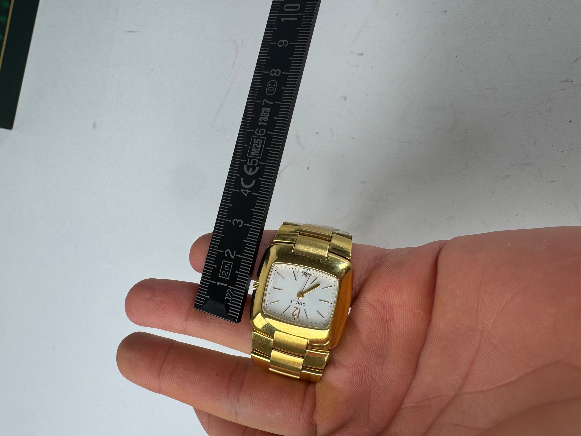 GUCCI Vintage 8500L Watch. This elegant vintage wristwatch is crafted of gold-plated stainless steel, including the case and matching bracelet. The watch features a white dial with gold-tone hands and a Gucci lettering logo, reflecting a timeless and refined aesthetic. It is Swiss Made, quartz operated, and the battery has been recently replaced.