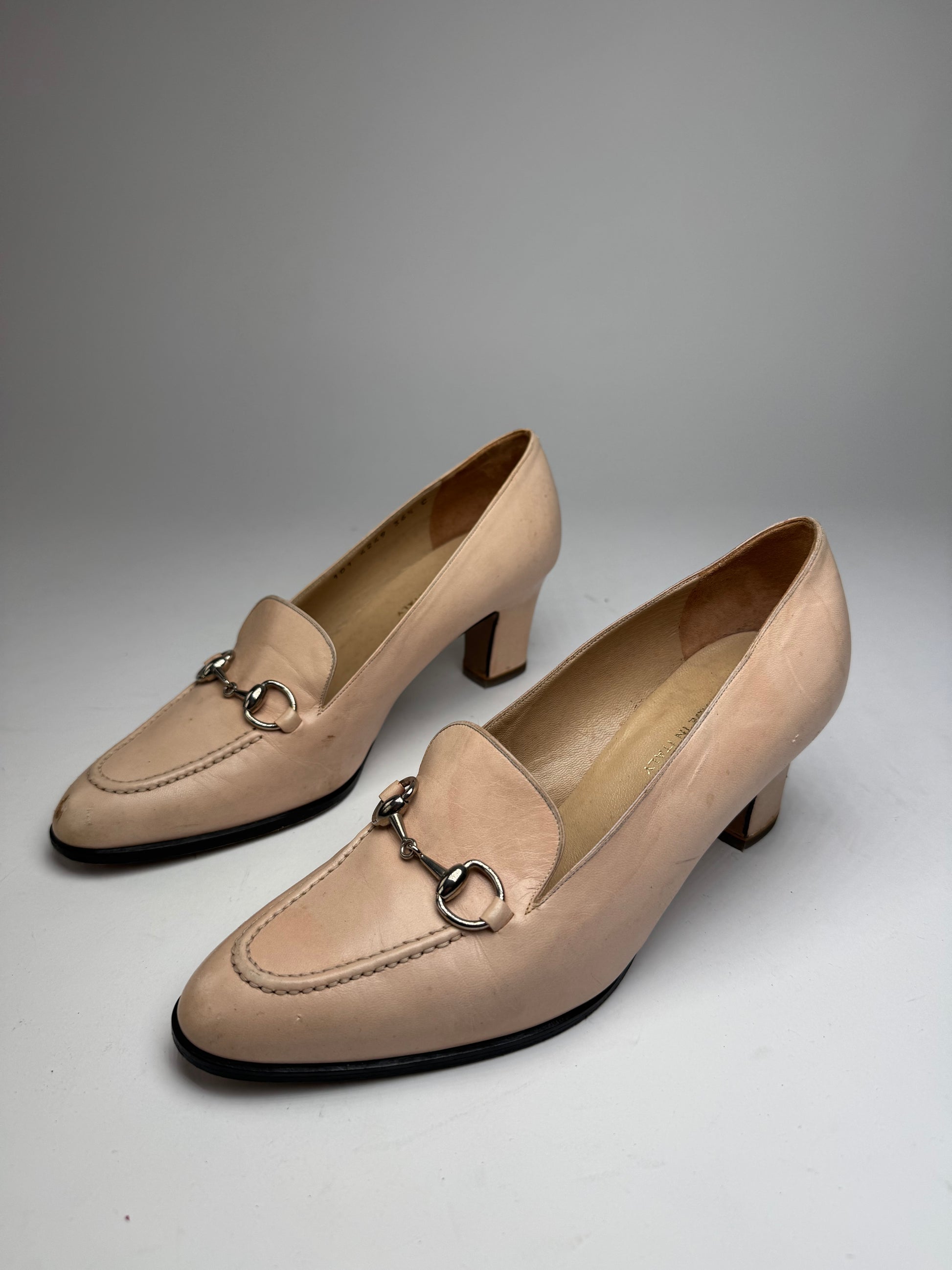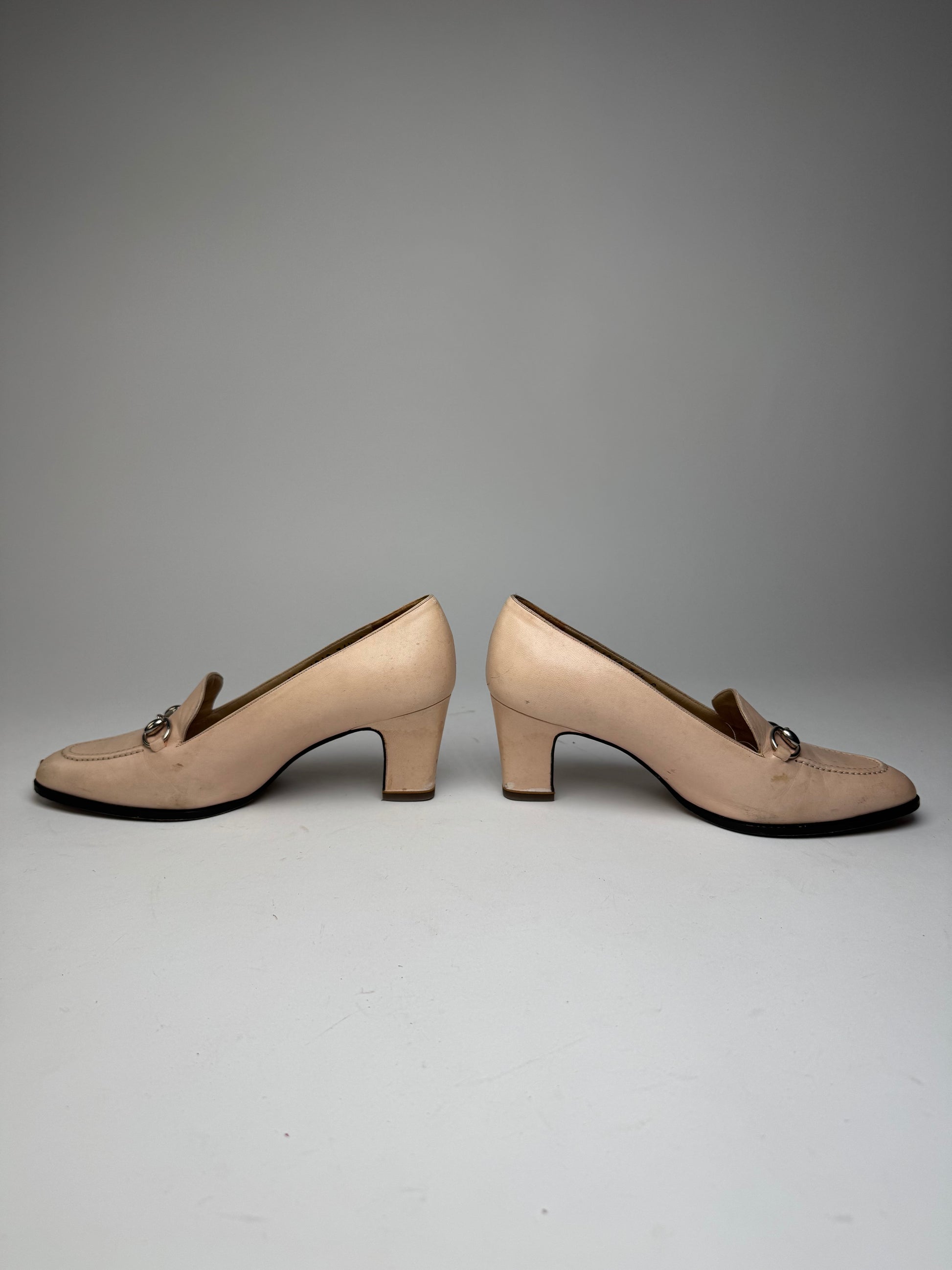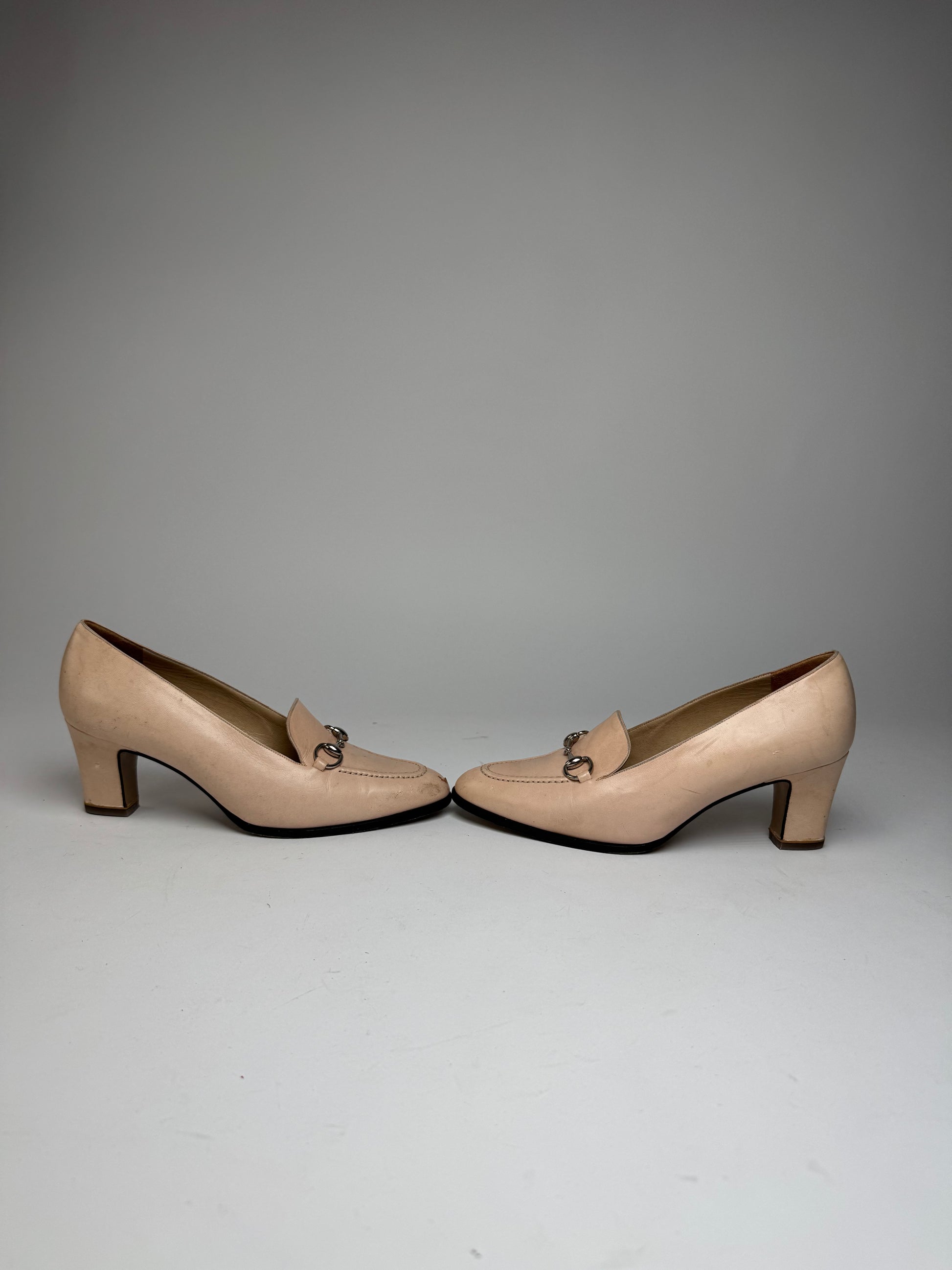 GUCCI Vintage Pumps. These elegant vintage pumps are finely crafted of soft pink leather. The shoes feature the iconic gold-tone steel Horsebit detail across the instep, a signature design element introduced by Gucci in the 1950s and inspired by the brand’s equestrian heritage, symbolizing timeless luxury and craftsmanship. The pumps open to a beige leather interior.