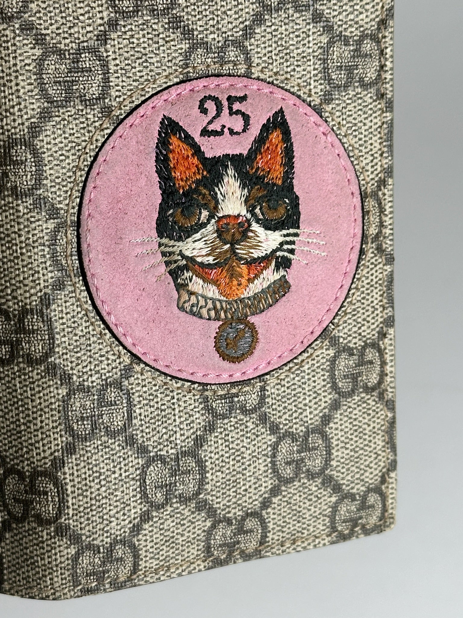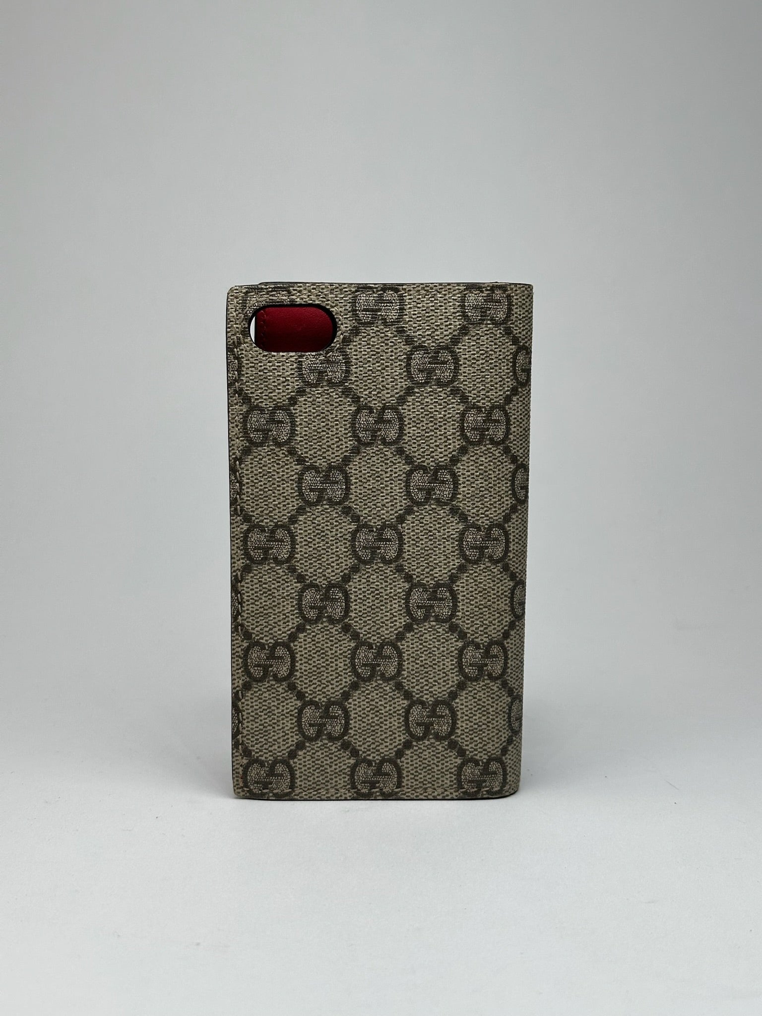 GUCCI Ophidia Monogram Vintage iPhone Case. This stylish phone case is finely crafted from classic Gucci Ophidia monogram canvas and features a distinctive cat appliqué on the front. Designed for iPhone 7 Plus, 8 Plus, or 6S Plus, it opens to a red interior.